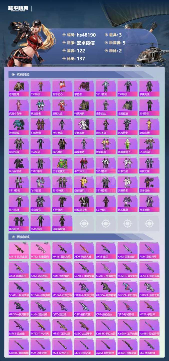 hs48190 安卓微-0王牌印记-5粉装-2特效枪-3载具-50410热力值-122套装-137