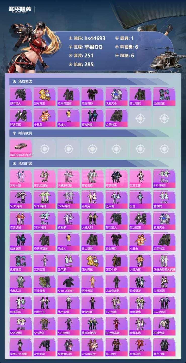 hs44693 苹果手Q-19王牌印记-6粉装-6特效枪-1载具-91751热力值-251套装-28