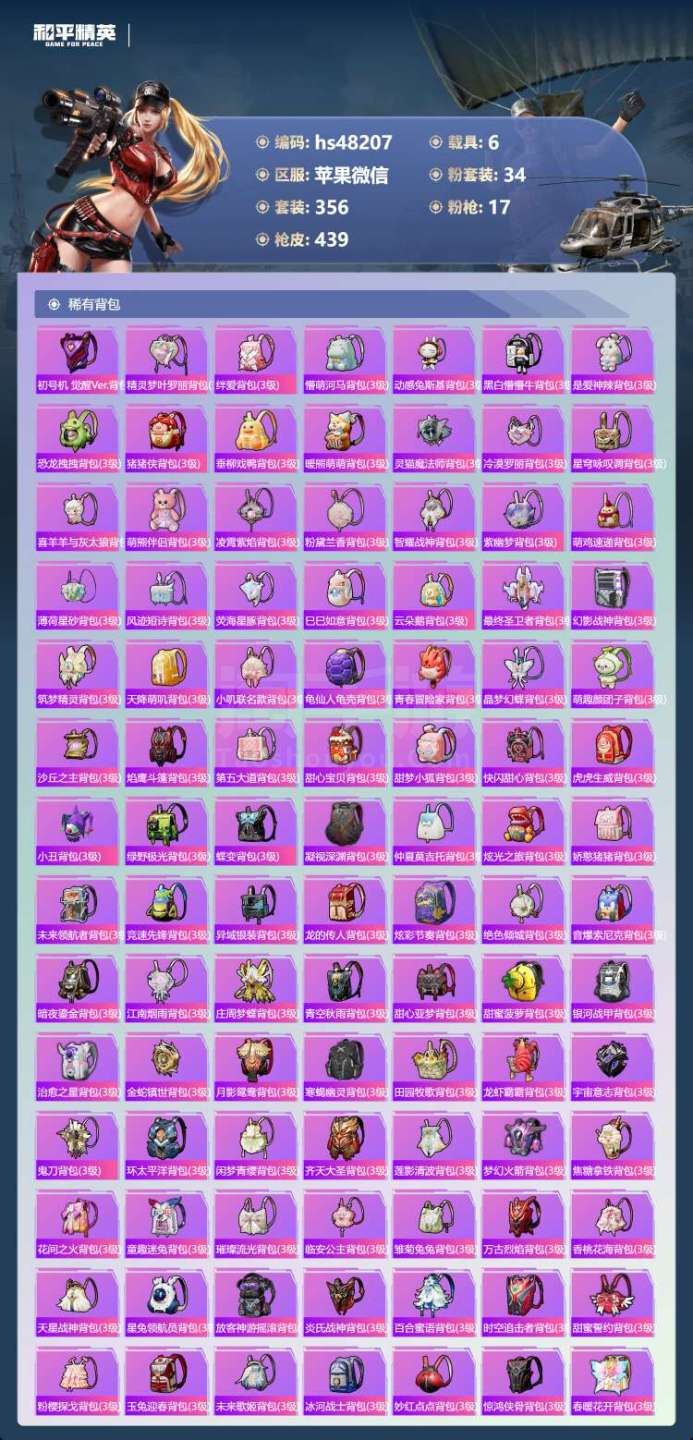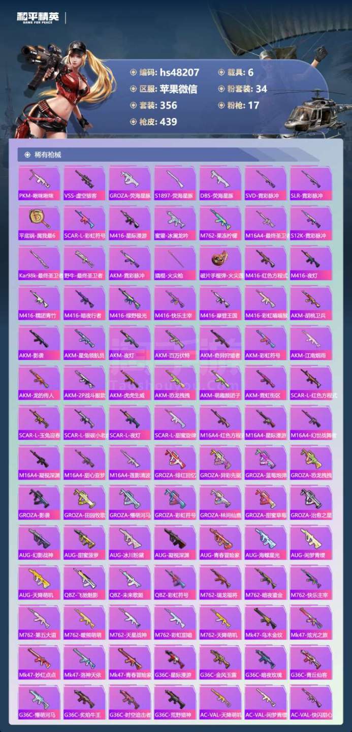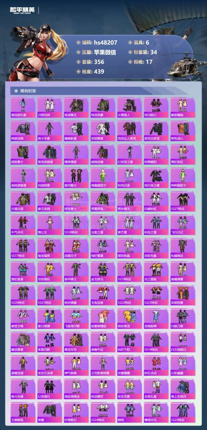 hs48207 苹果微-19王牌印记-34粉装-17特效枪-6载具-177886热力值-356套装