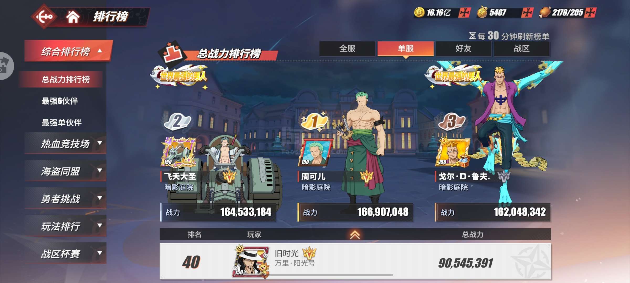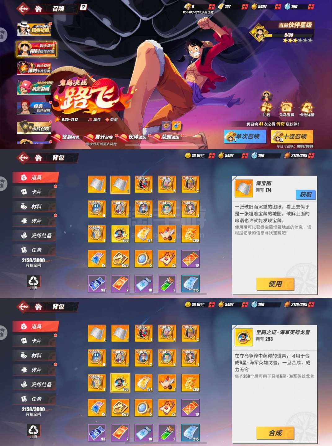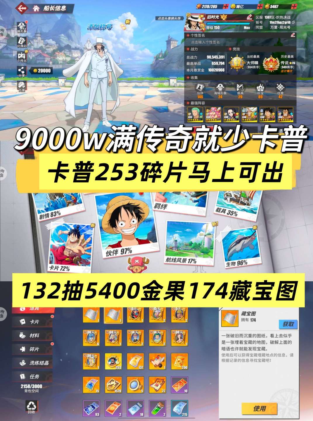 航海王热血航线【安卓华为】9000w准全图鉴青年卡普差7碎片,5400金果137抽,174藏宝图大量资源可肝,单站最高65w,