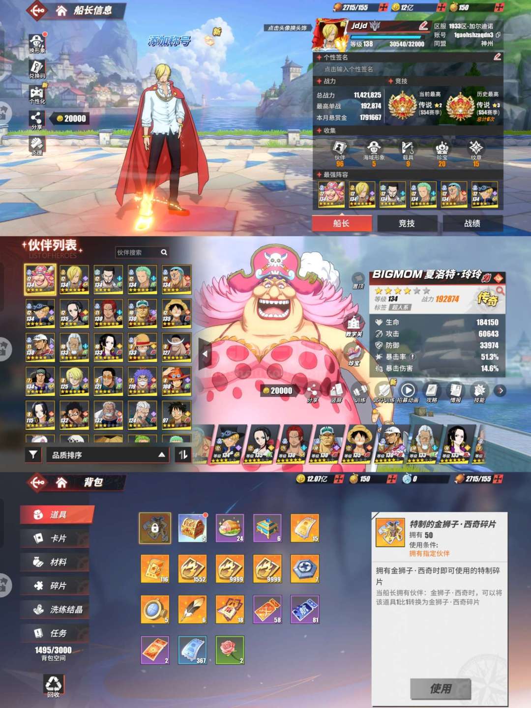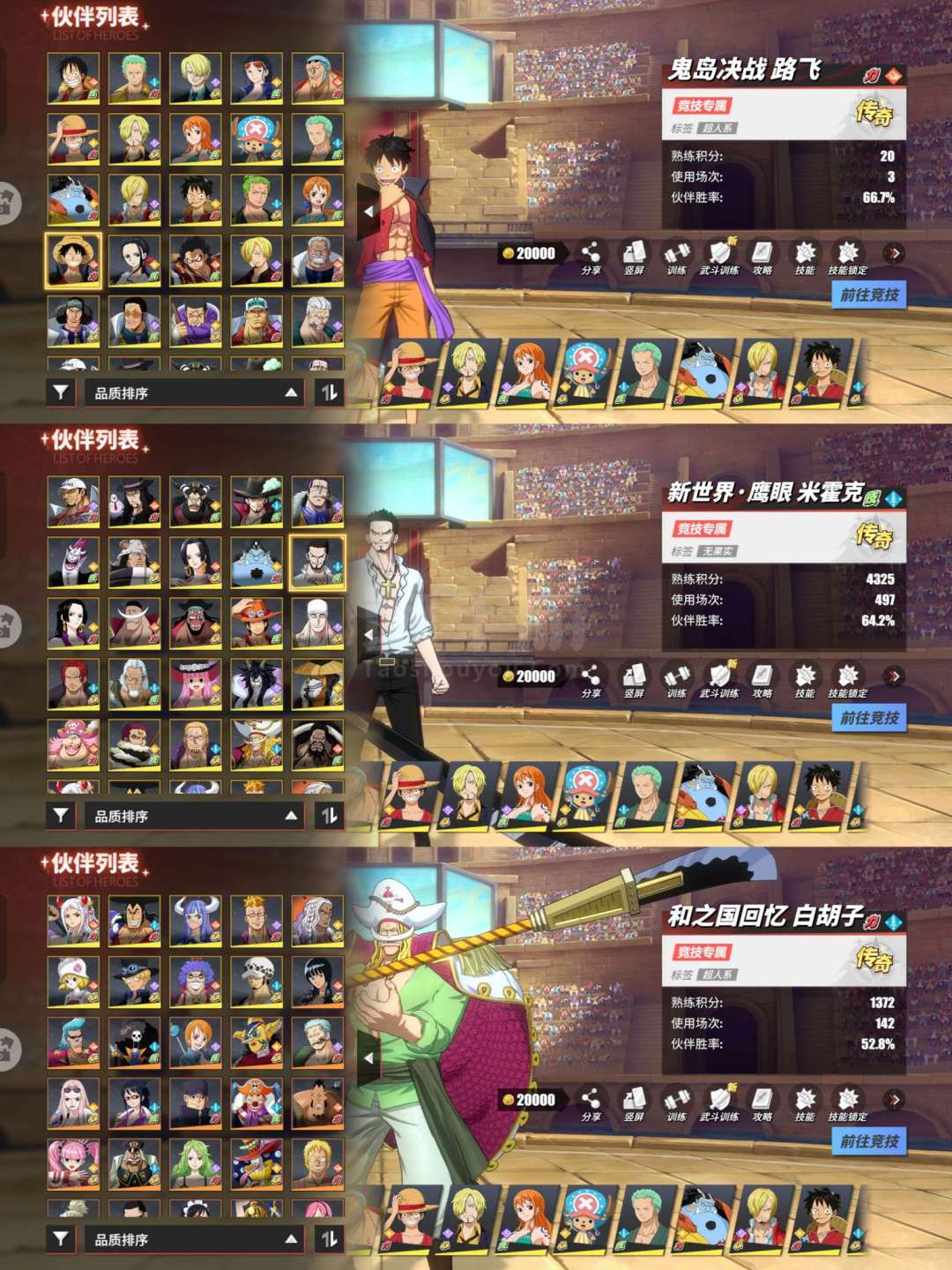 航海王热血航线【安卓华为】1100万竞技场59传奇9强者 鬼路已出 大和 和路 和索 魔神山治 青雷 青白 卡二 新鹰眼 四档