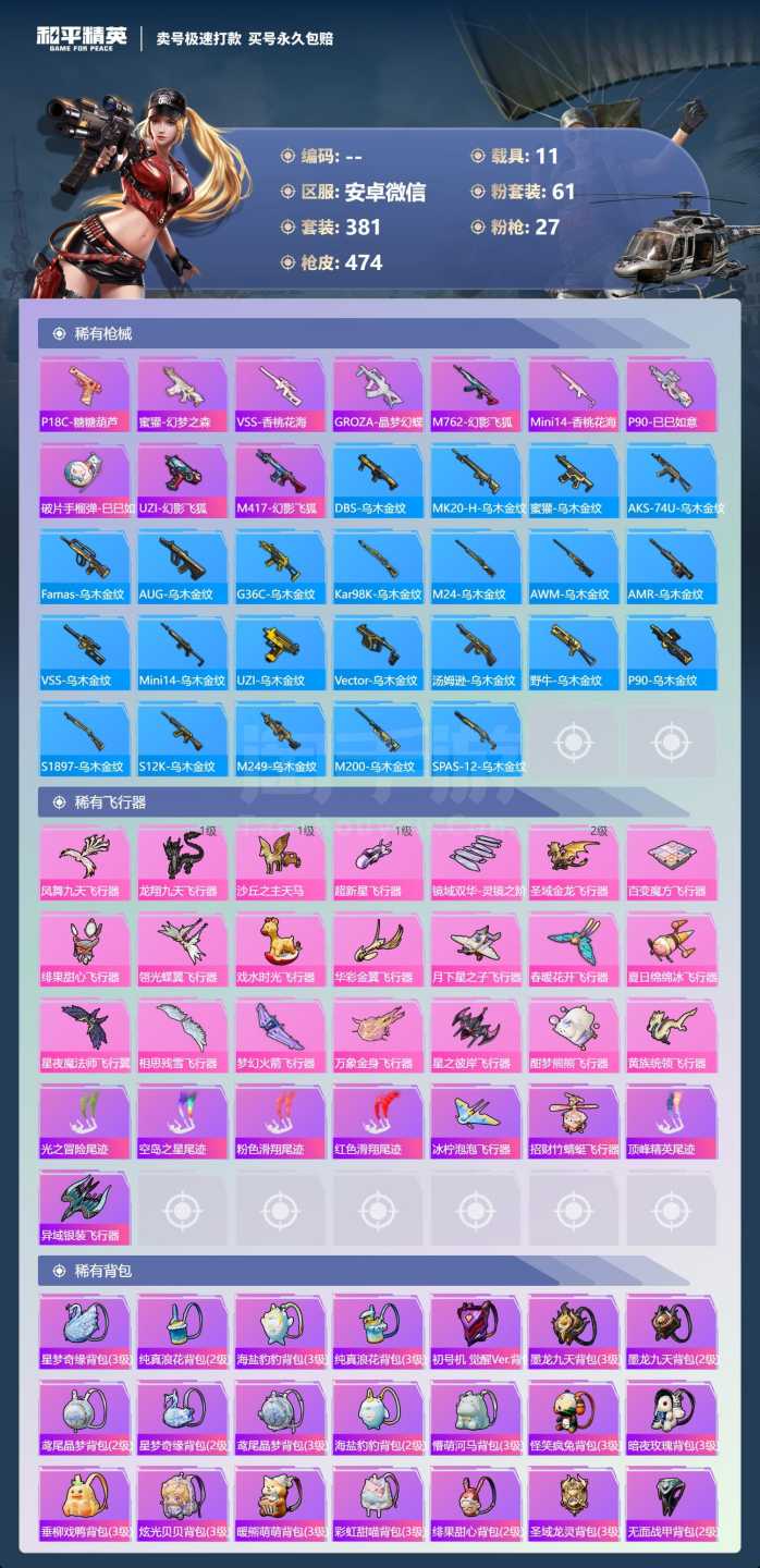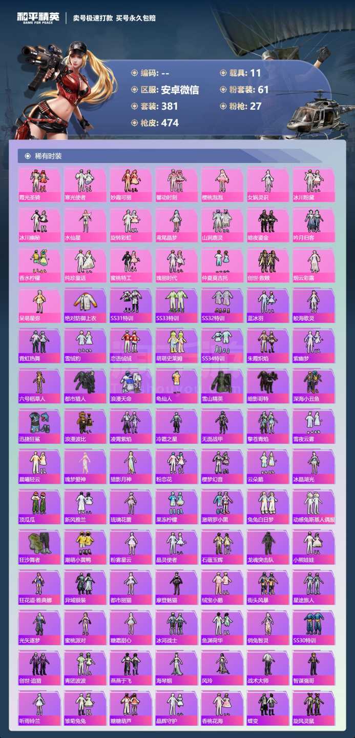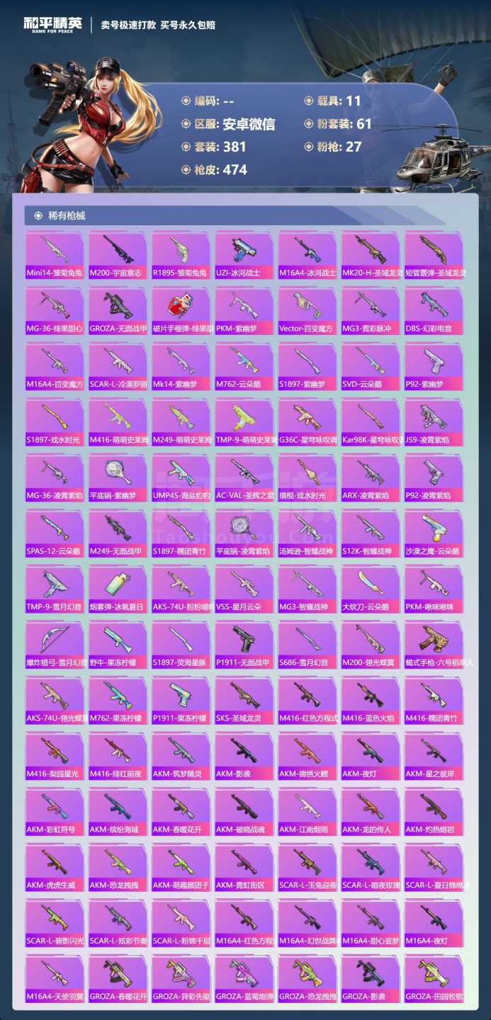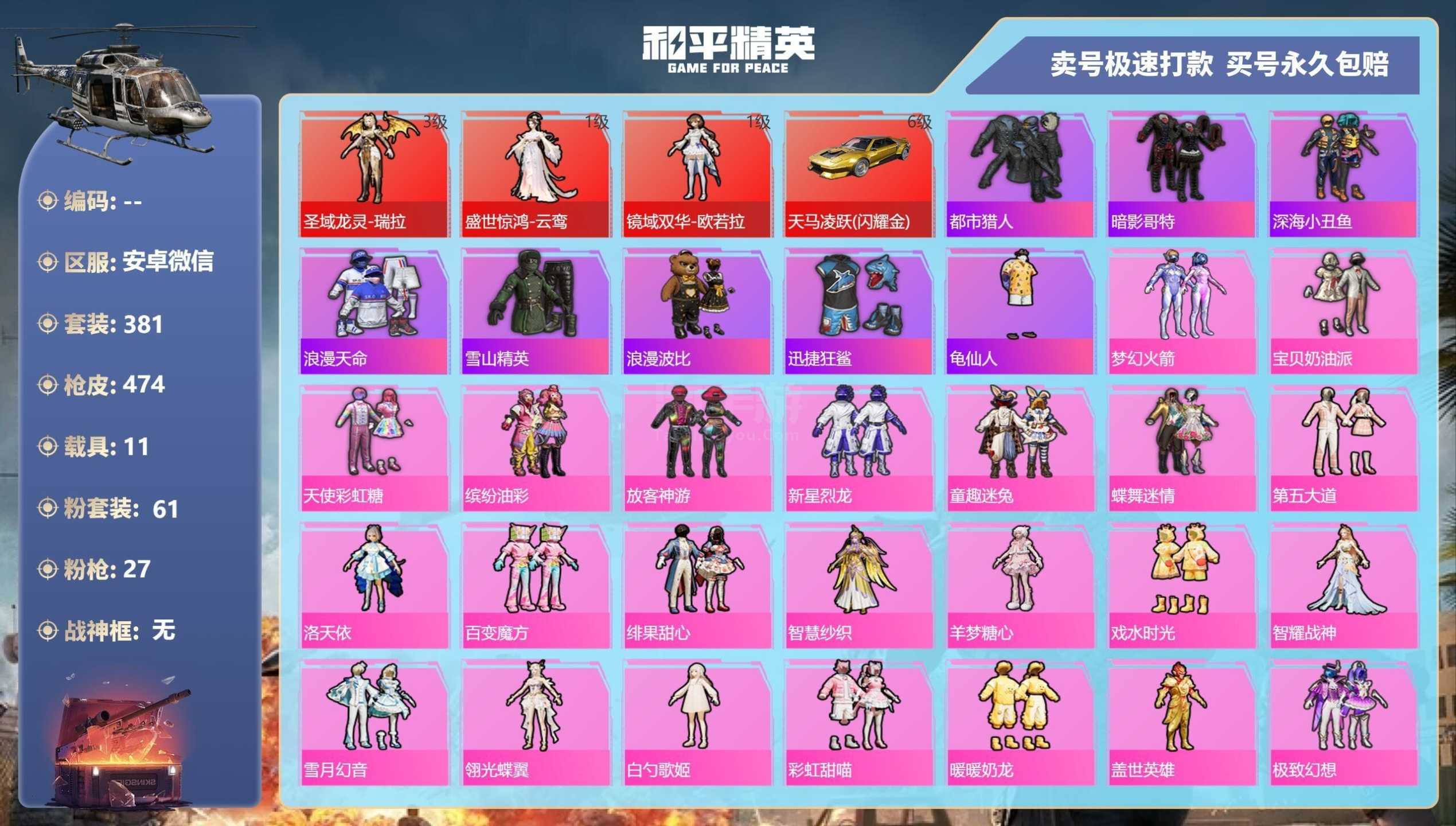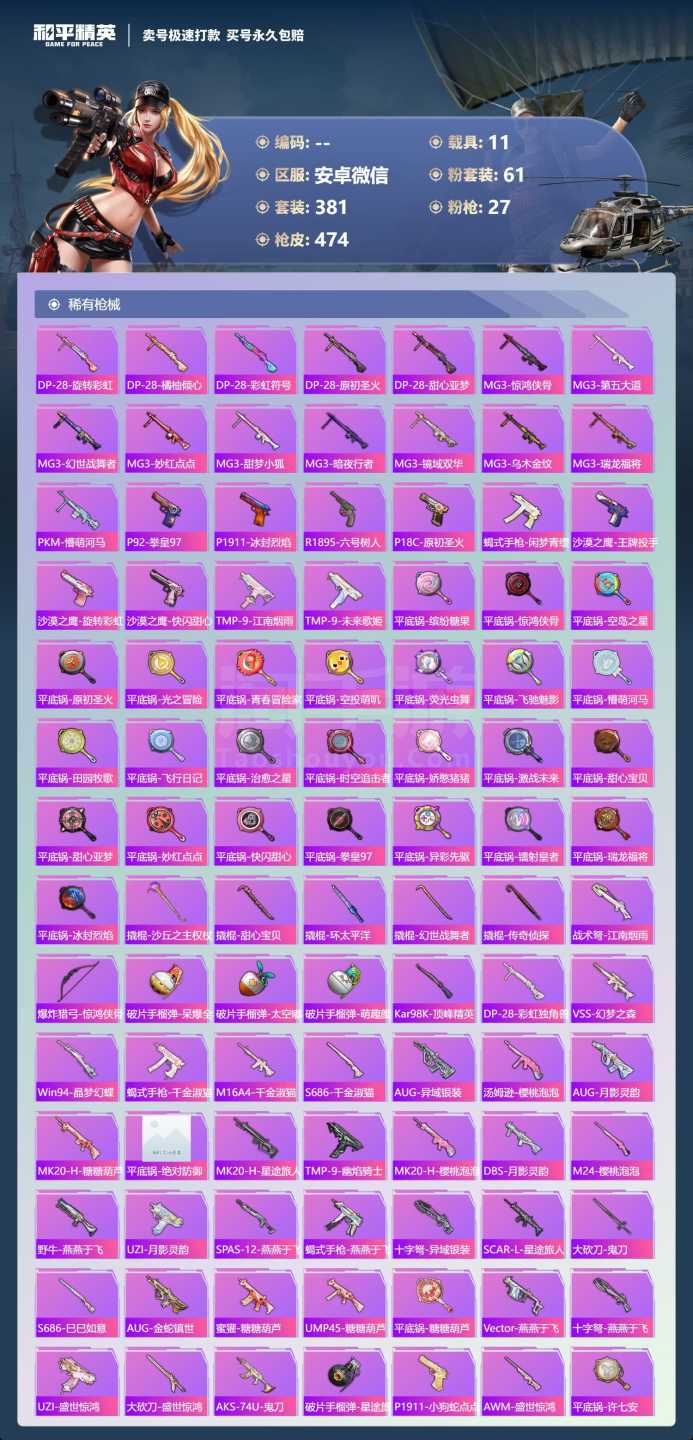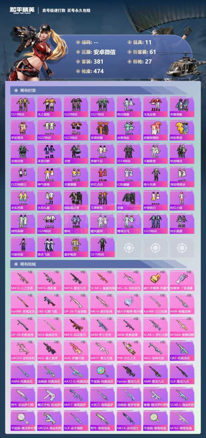 和平精英【安卓微信】a3922/安卓v/-26王牌印记-61粉装-27特效枪-11载具-224027热力值-381套装