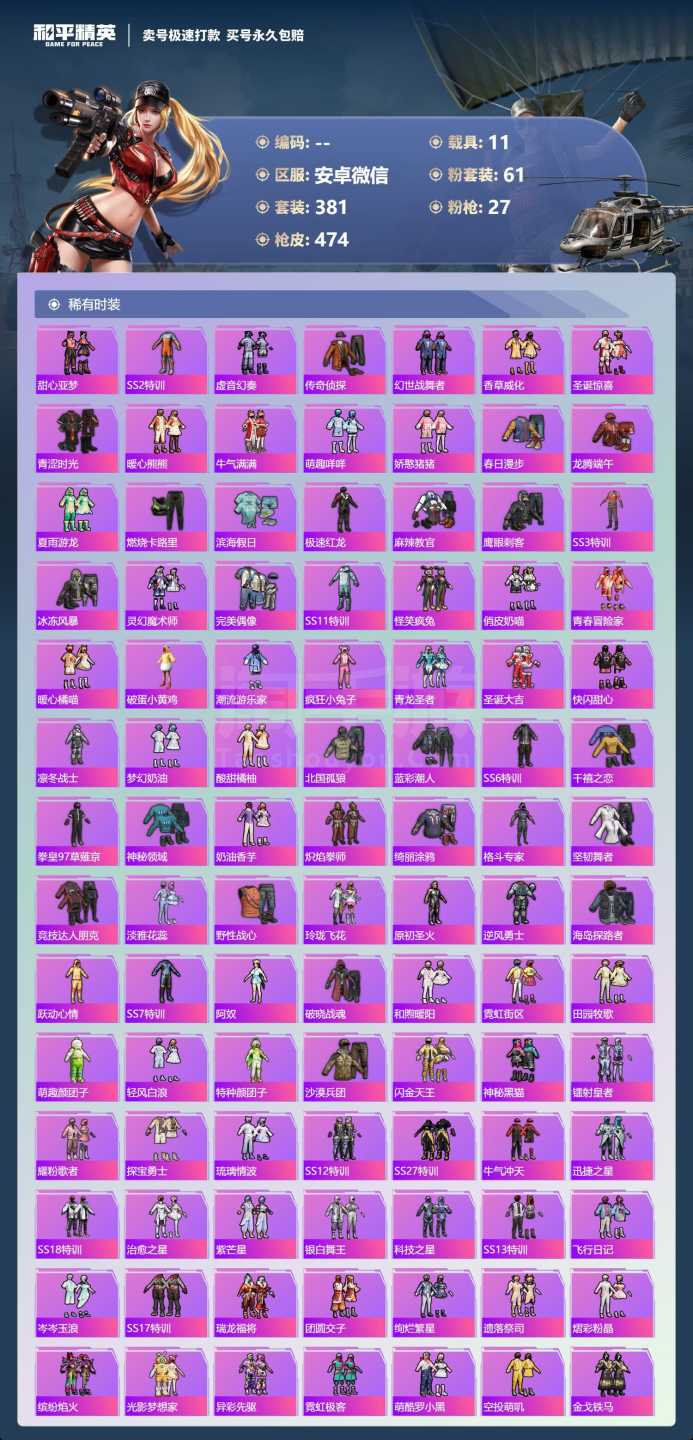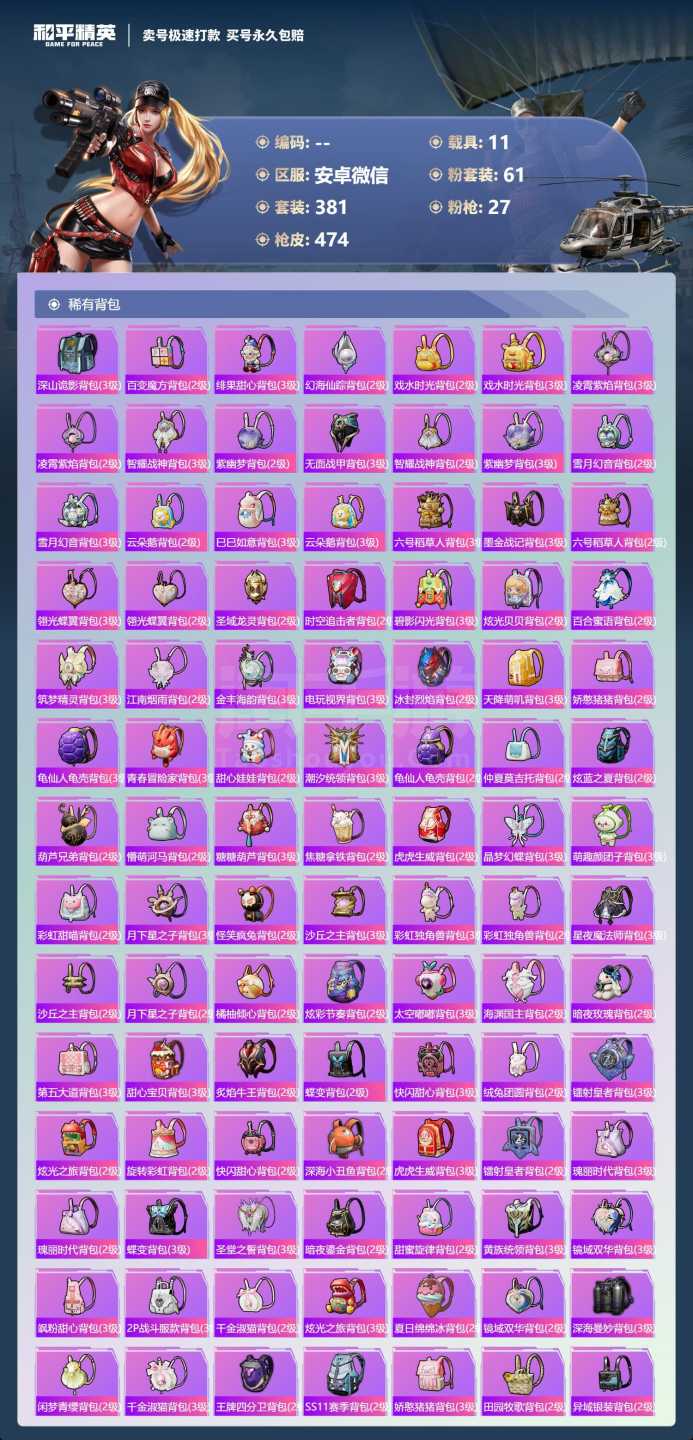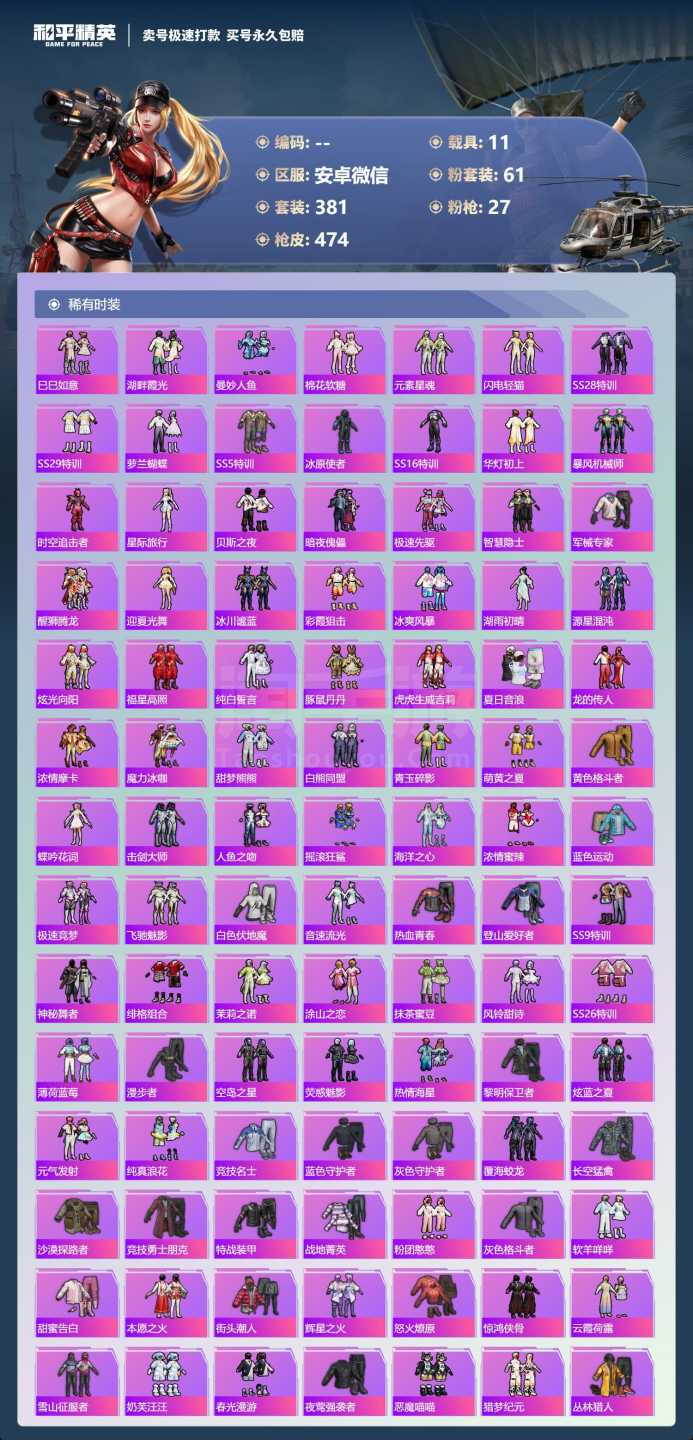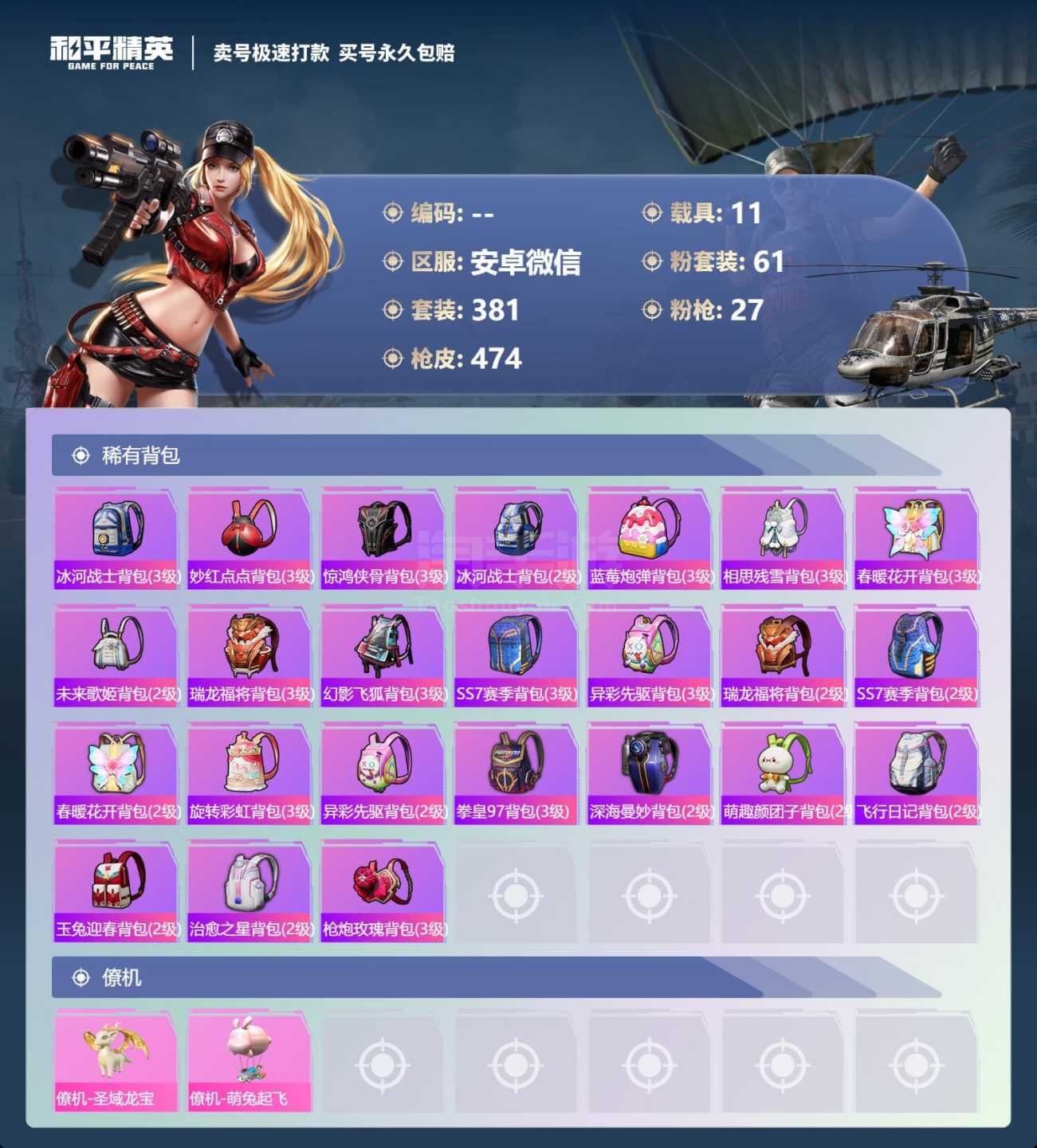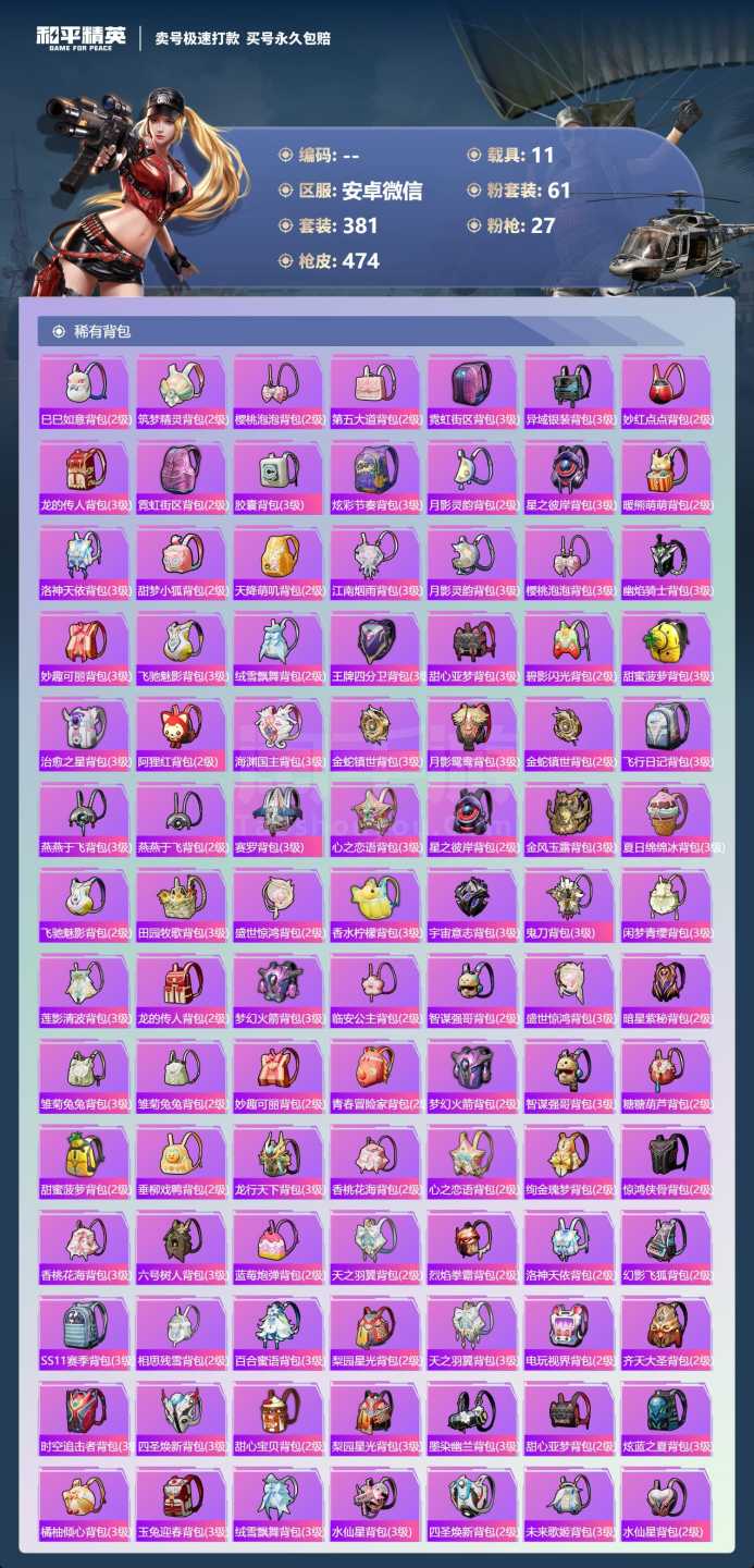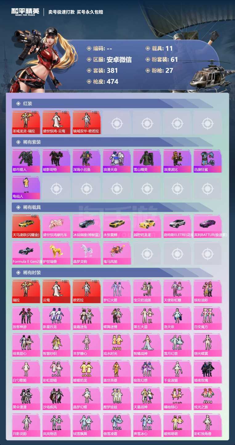 和平精英【安卓微信】a3922/安卓v/-26王牌印记-61粉装-27特效枪-11载具-224027热力值-381套装