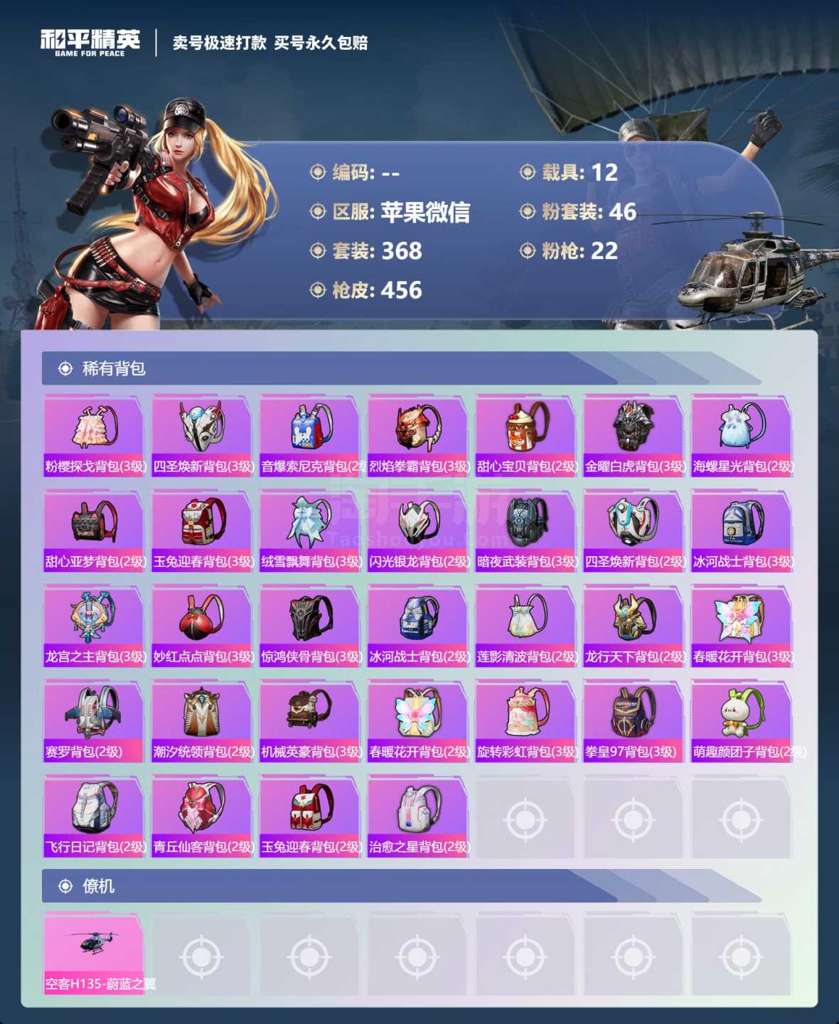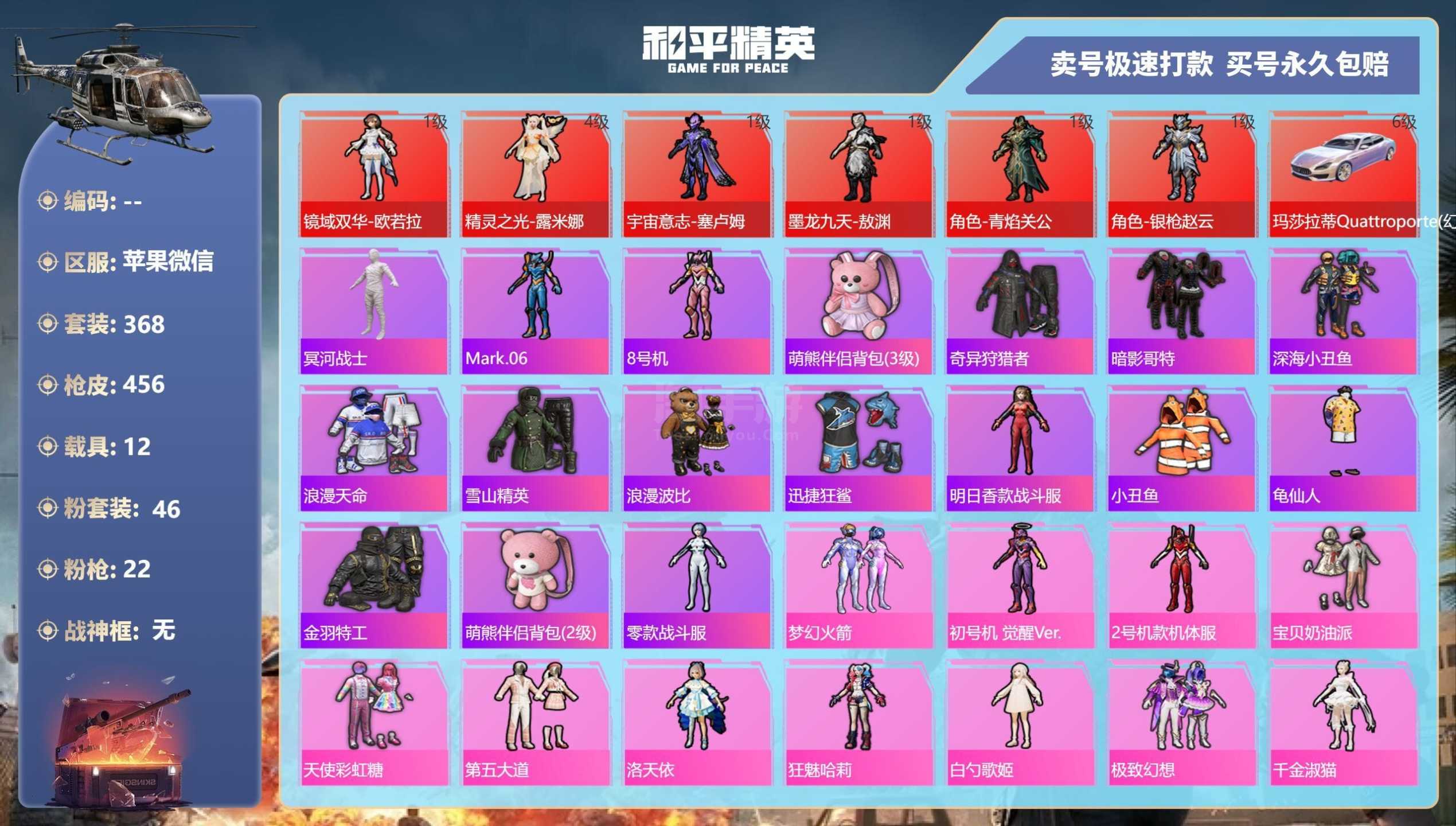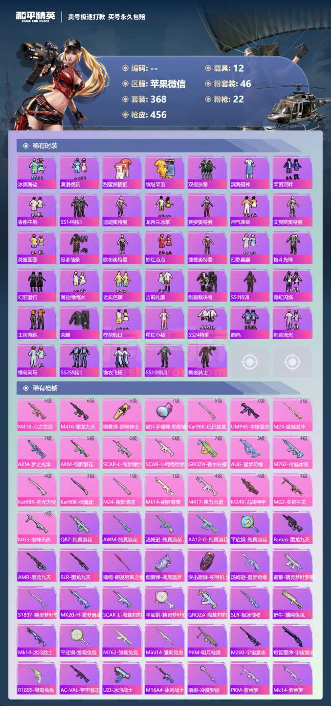 a4030/苹果微/-18王牌印记-46粉装-22特效枪-12载具-193313热力值-368套装