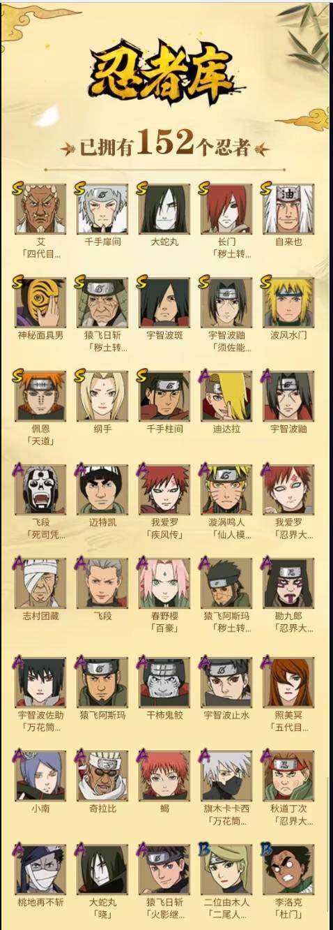 【S级忍者】:长门「秽土转生」(3星),猿飞日斩「秽土转生」(3星),宇智波鼬「须佐能乎」(3星),艾「四代目雷影」(3星),自来也(3星),大蛇丸(3星),纲手(3星),千手柱间(3星),千手扉间(3星),宇智波斑(3星),波风水门(3星),神秘面具男(3星),佩恩「天道」(3星)