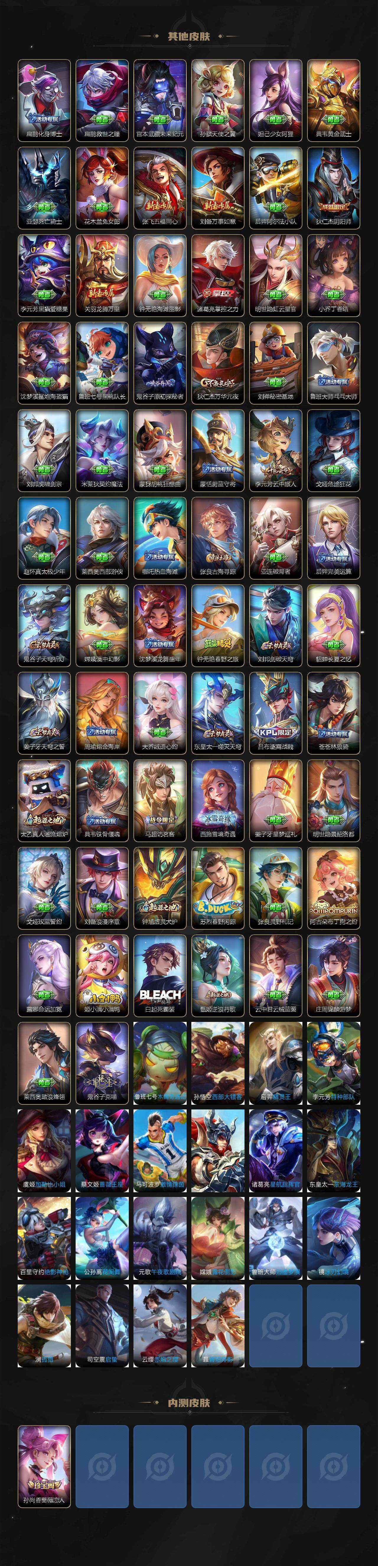 【限定皮肤】:大乔绒语心约,姜子牙天穹之誓,狄仁杰阴阳师,赵云皇家上将,孙尚香蔷薇恋人,马可波罗暗影游猎,狄仁杰万华元夜,项羽海滩派对,李元芳云中旅人,鬼谷子