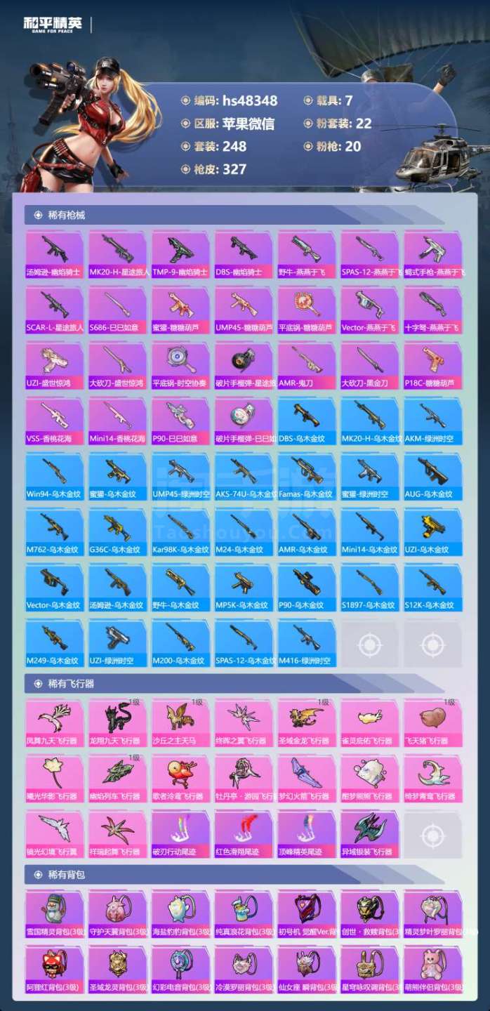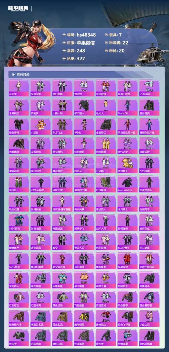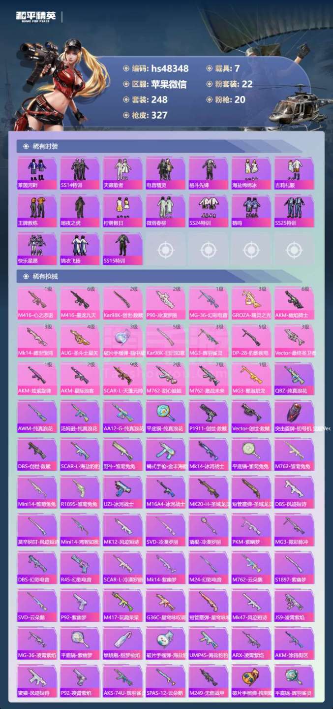 和平精英【苹果微信】hs48348 苹果v-15王牌印记-有战神框-3红装-22粉装-20特效枪-7载具-135132