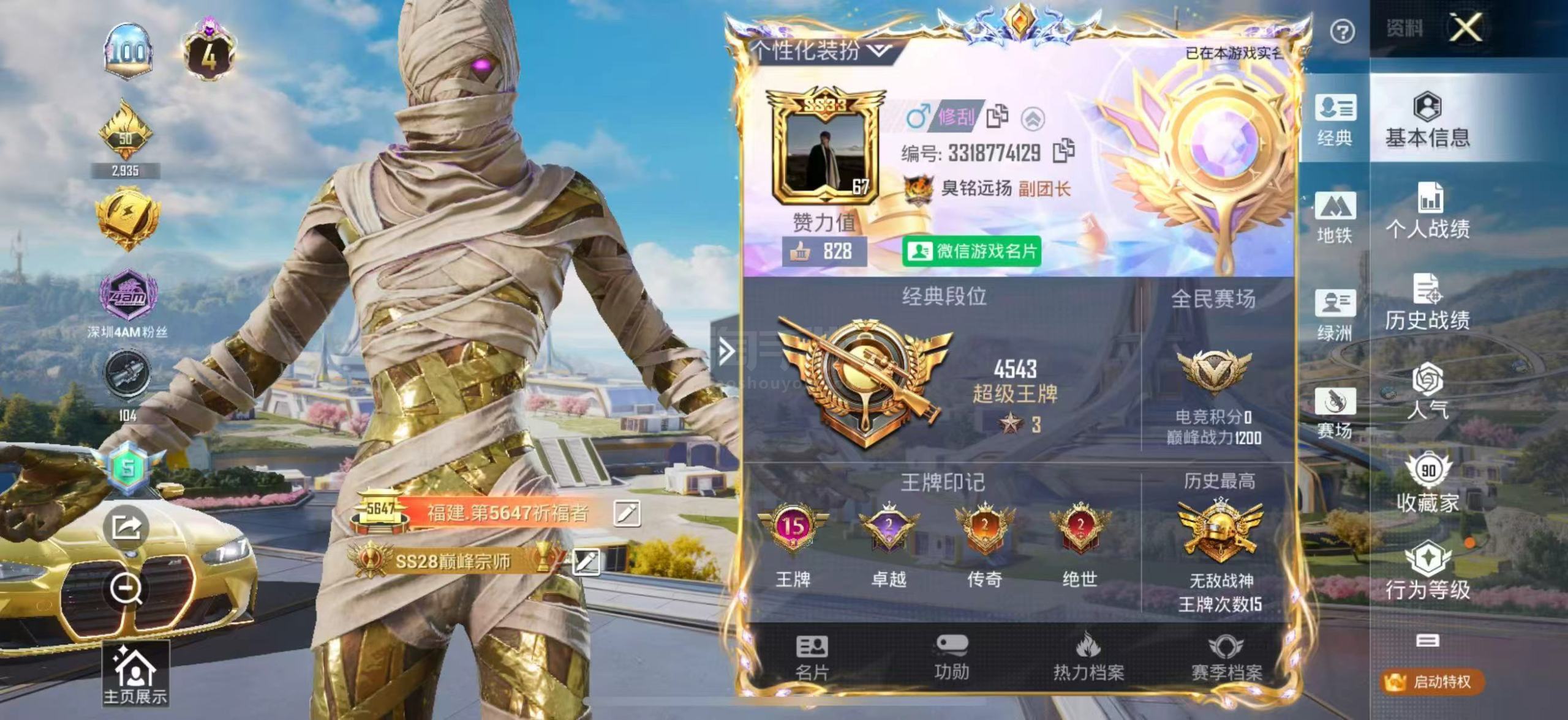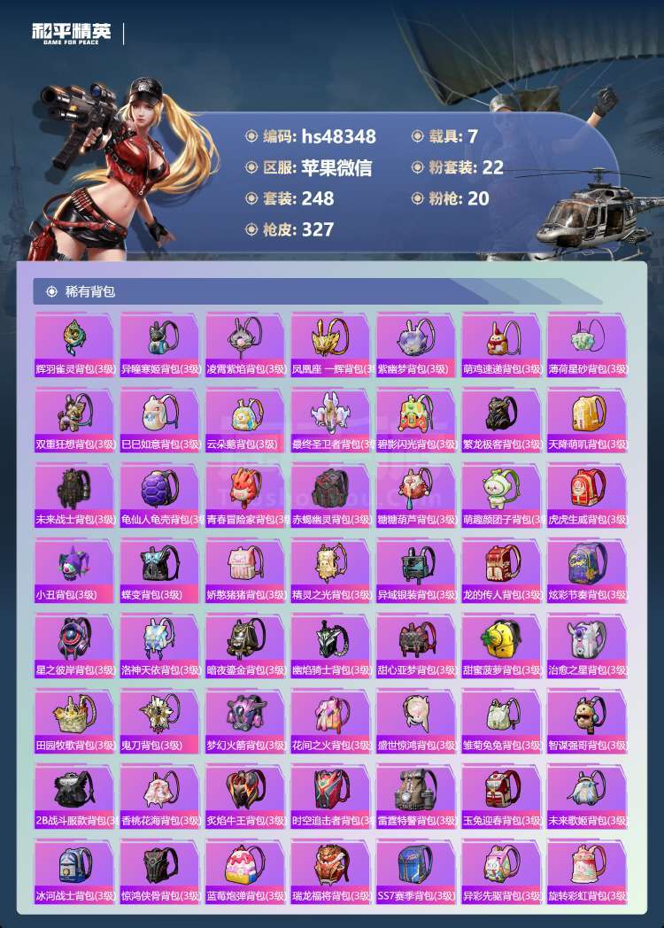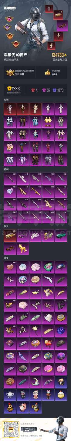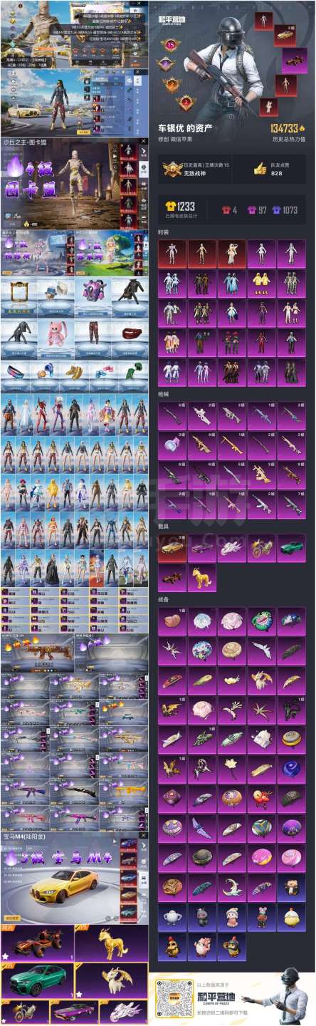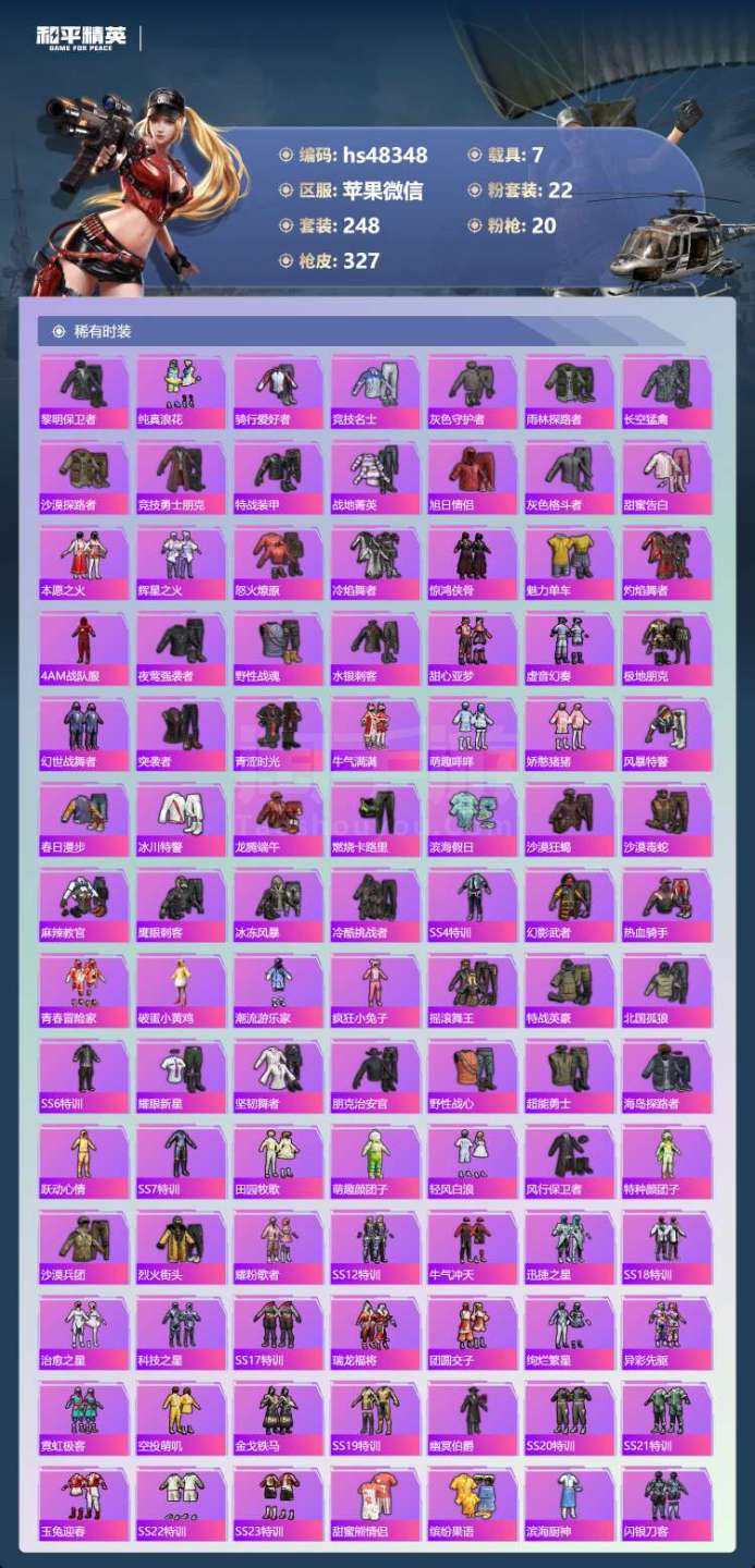 和平精英【苹果微信】hs48348 苹果v-15王牌印记-有战神框-3红装-22粉装-20特效枪-7载具-135132