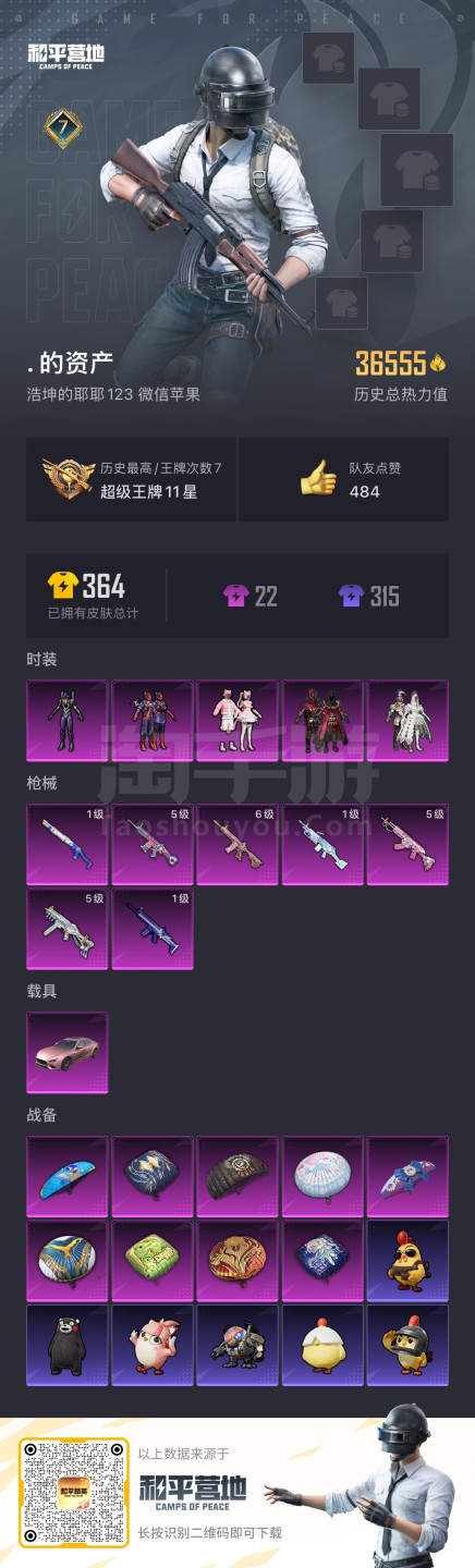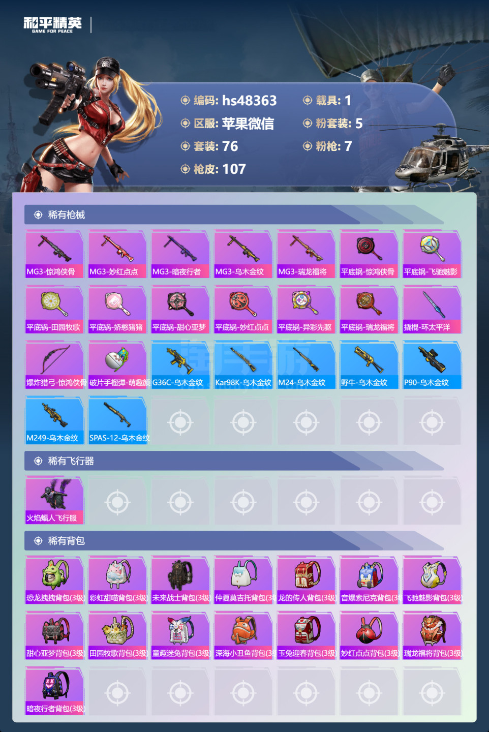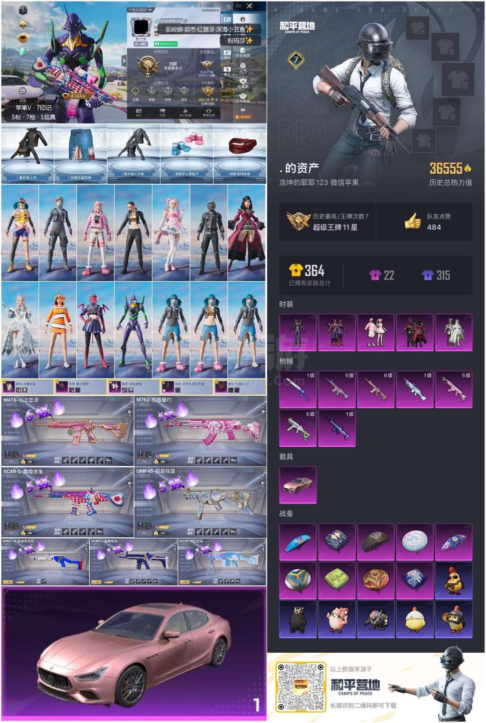 和平精英【苹果微信】hs48363 苹果v-7王牌印记-5粉装-7特效枪-1载具-36555热力值-76套装-107枪