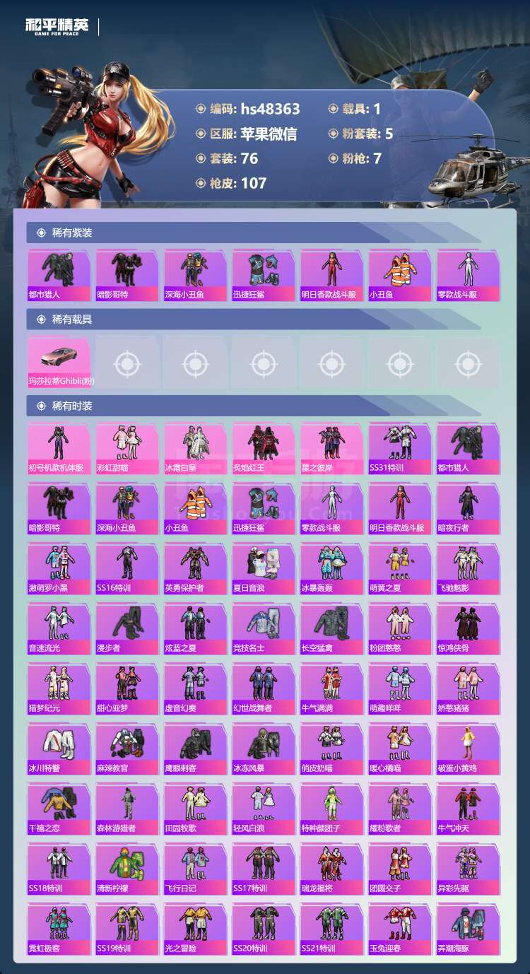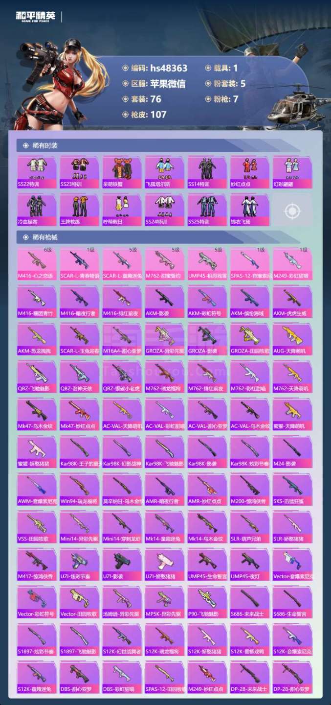 hs48363 苹果微-7王牌印记-5粉装-7特效枪-1载具-36555热力值-76套装-107枪