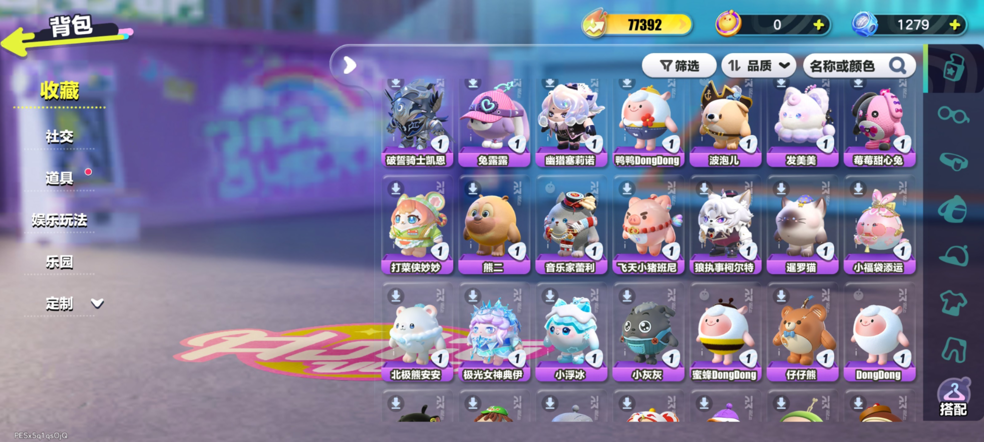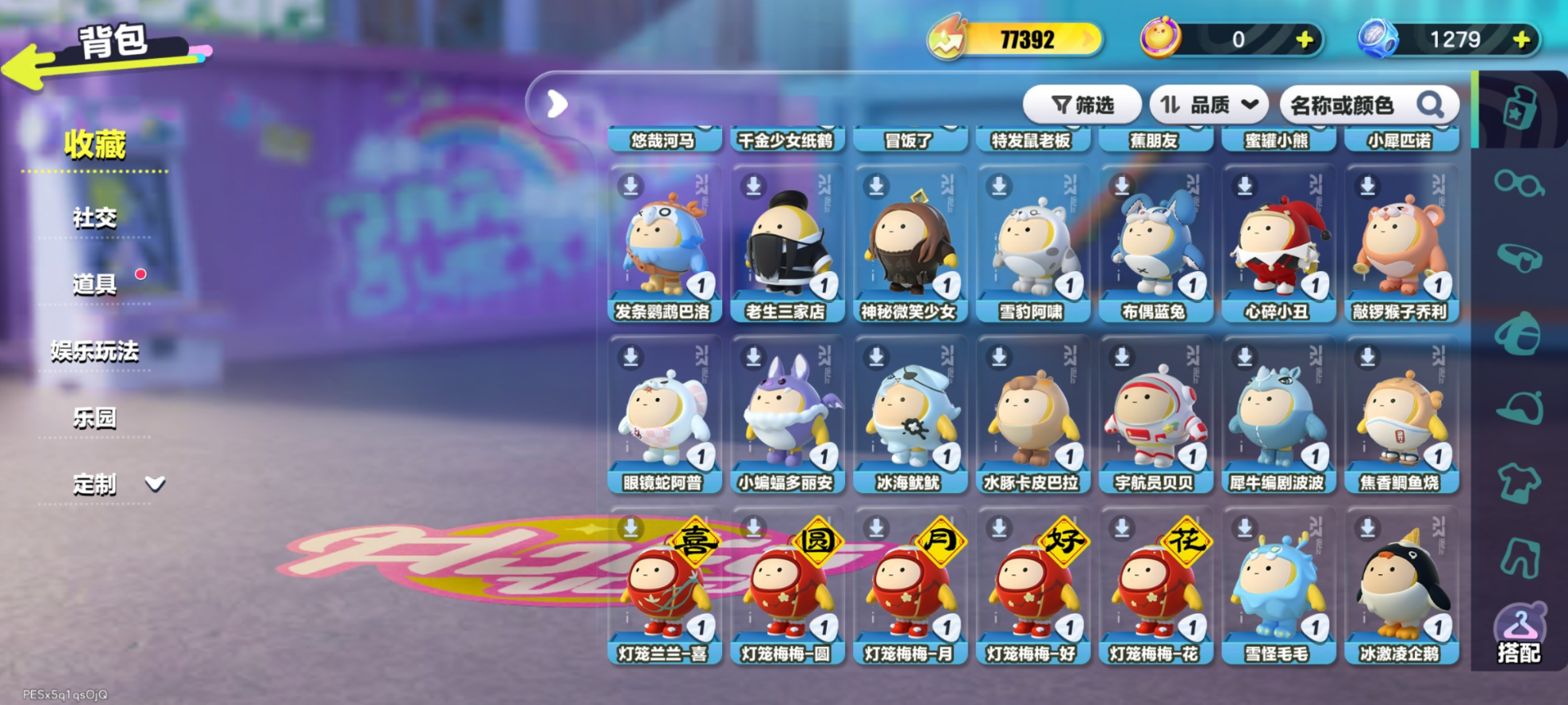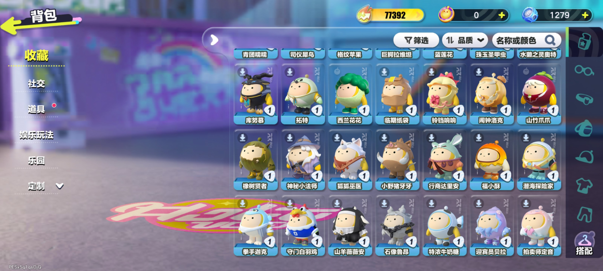 紫皮:莓莓 DongDong,蜜蜂 DongDong,鸭鸭 DongDong,DongDong,大祭司木西恩,暴龙化石斯坦,冷面千金竹月,海盐布丁嘟嘟,柠檬汽水啵啵,誓约玩偶里昂,木偶鸭松果,控球手迅风,布偶米米,超燃蛋小红,超燃蛋小绿,劝学小子,大娃,小狮子园蒙,舞女洛弥诗,执法官布谷,破誓
