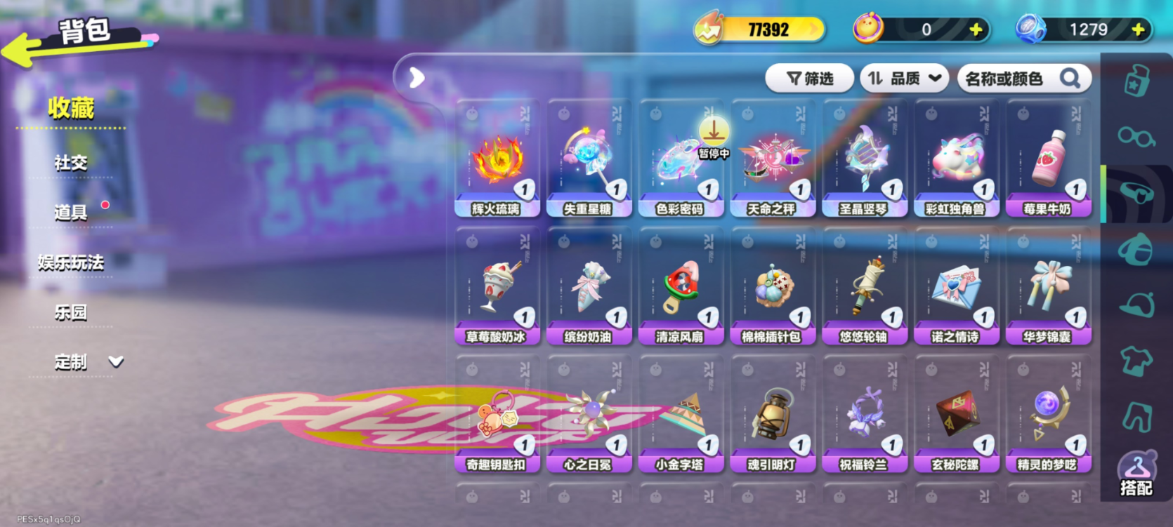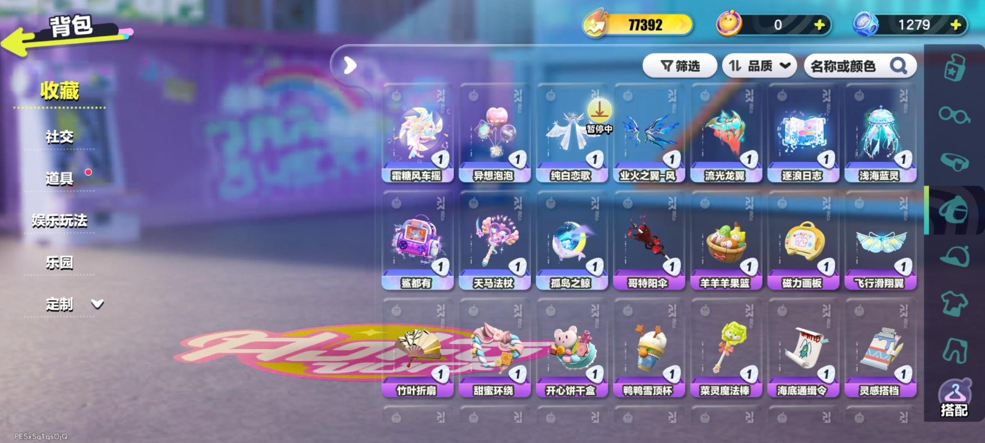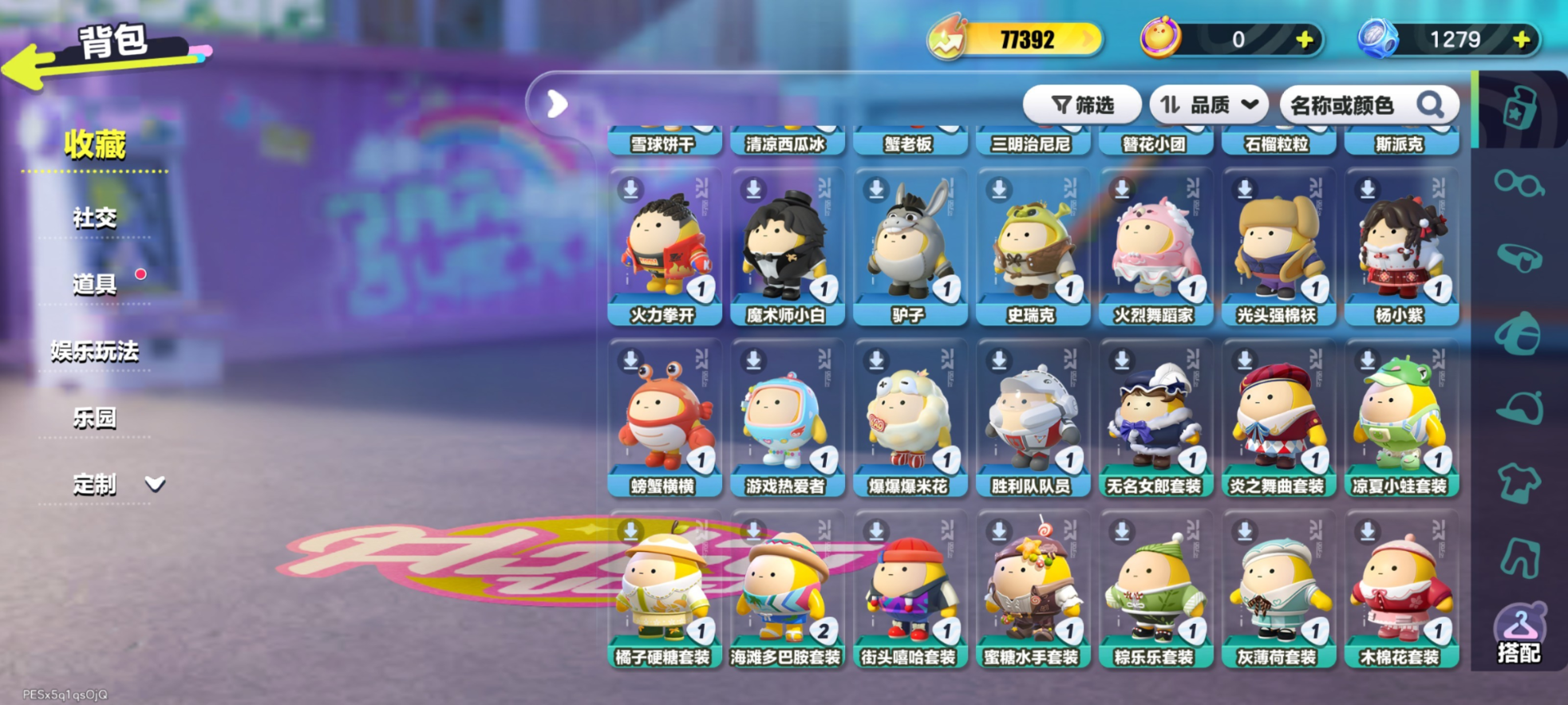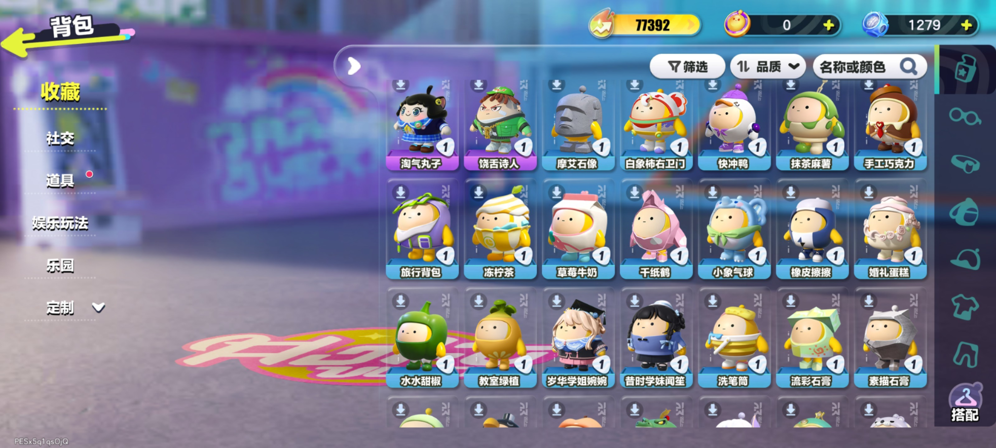紫皮:莓莓 DongDong,蜜蜂 DongDong,鸭鸭 DongDong,DongDong,大祭司木西恩,暴龙化石斯坦,冷面千金竹月,海盐布丁嘟嘟,柠檬汽水啵啵,誓约玩偶里昂,木偶鸭松果,控球手迅风,布偶米米,超燃蛋小红,超燃蛋小绿,劝学小子,大娃,小狮子园蒙,舞女洛弥诗,执法官布谷,破誓