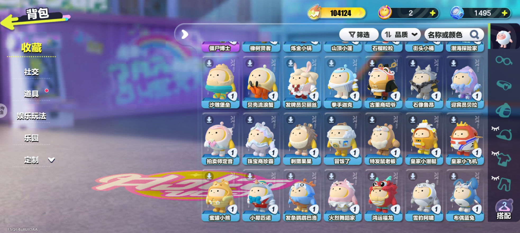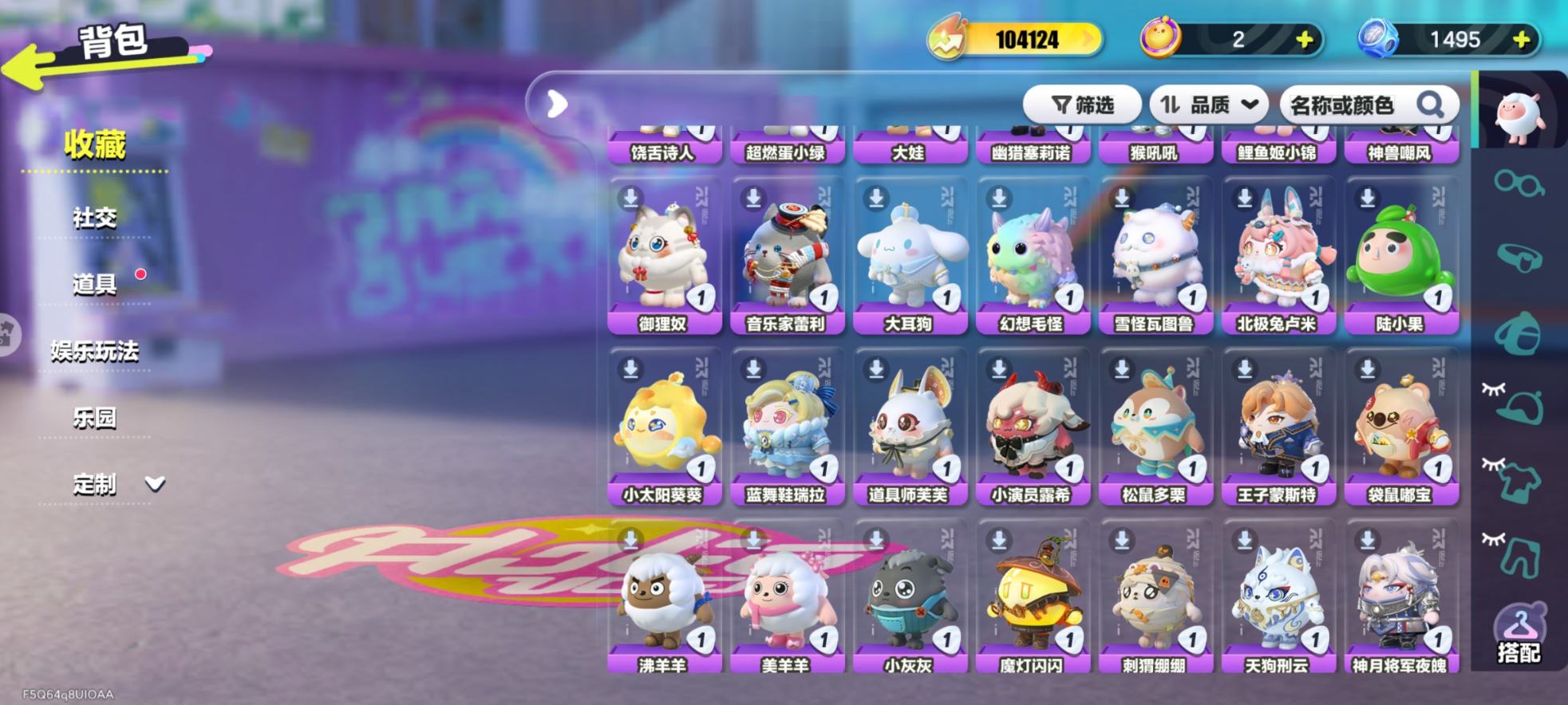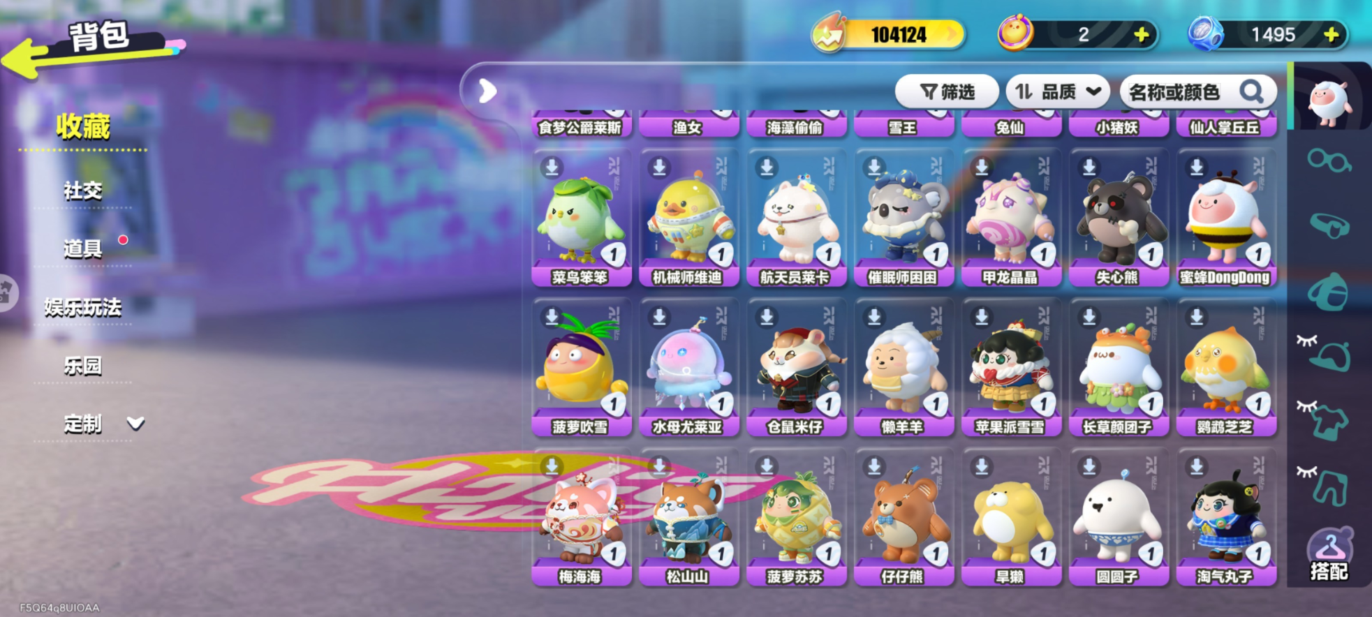 紫皮:DongDong,蜜蜂 DongDong,大亨波利,石心船长苏勒,发美美,打菜侠妙妙,飞天小猪班尼,暹罗猫,小福袋添运,面包狗松松,极光女神典伊,元气丸子,郁金香贝尔,流浪小象哆哆,狸猫大力,饶舌诗人,超燃蛋小绿,大娃,幽猎塞莉诺,猴吼吼,鲤鱼姬小锦,神兽嘲风,