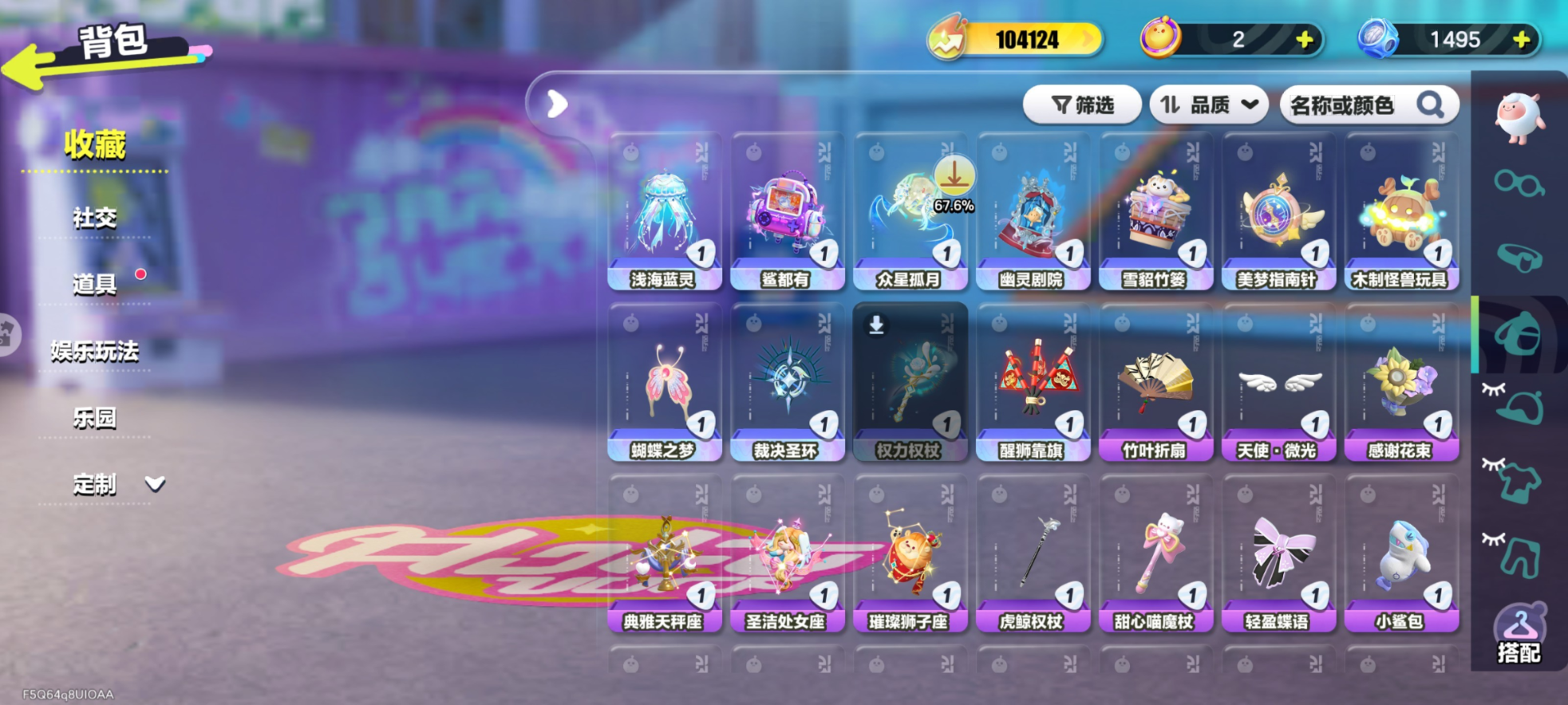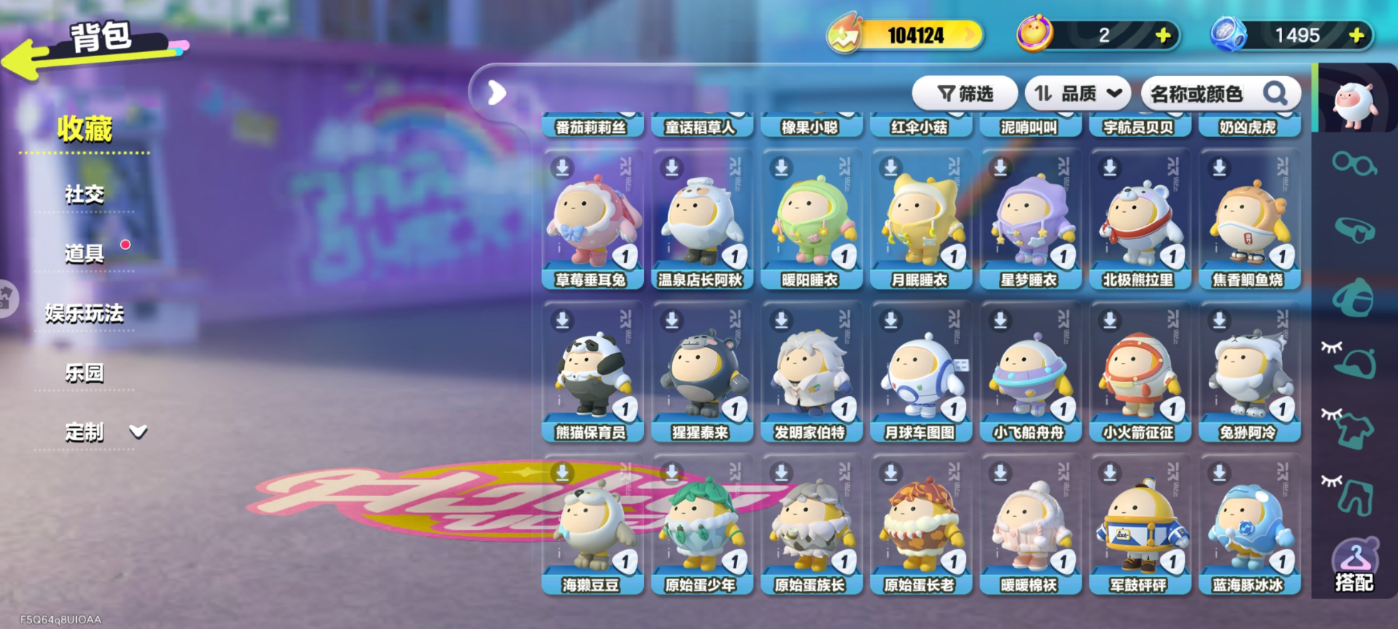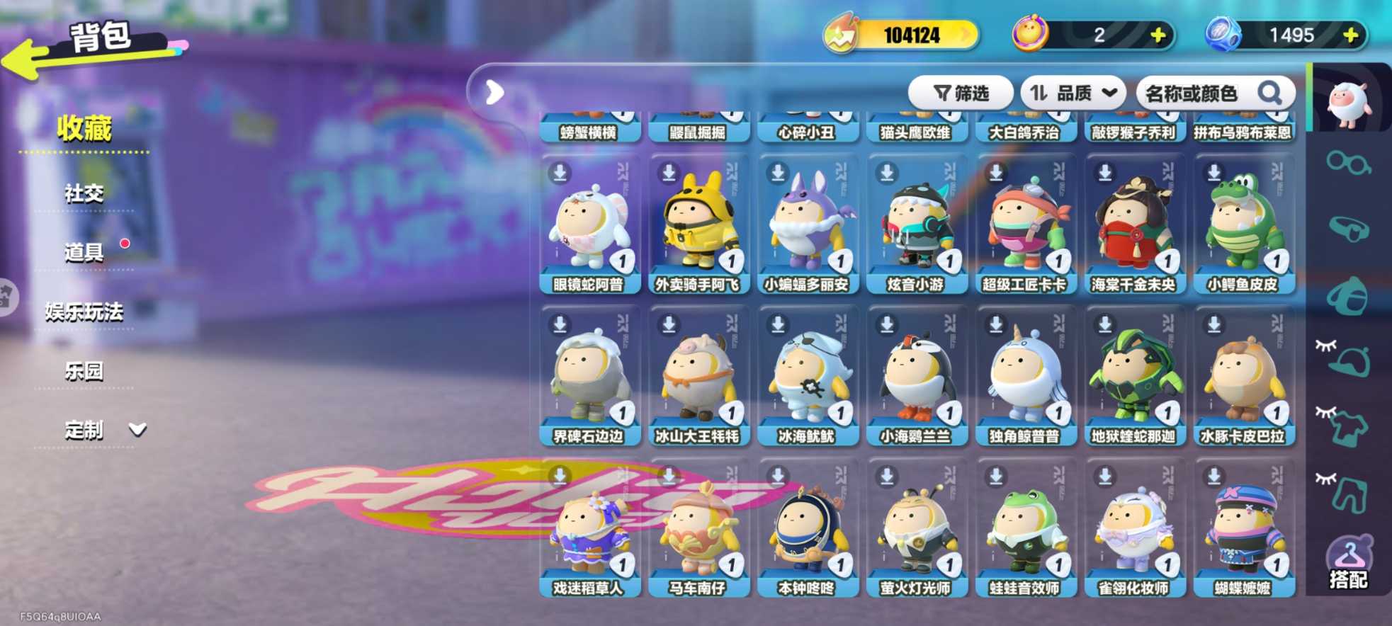 紫皮:DongDong,蜜蜂 DongDong,大亨波利,石心船长苏勒,发美美,打菜侠妙妙,飞天小猪班尼,暹罗猫,小福袋添运,面包狗松松,极光女神典伊,元气丸子,郁金香贝尔,流浪小象哆哆,狸猫大力,饶舌诗人,超燃蛋小绿,大娃,幽猎塞莉诺,猴吼吼,鲤鱼姬小锦,神兽嘲风,