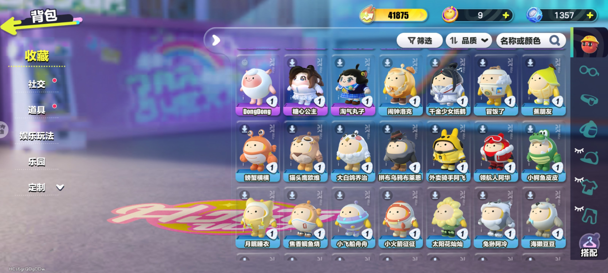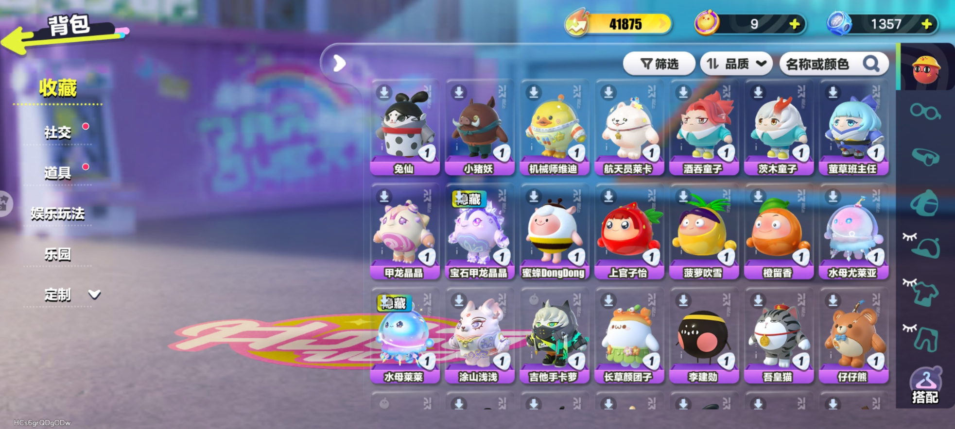 紫皮:蜜蜂 DongDong,DongDong,红小豆,音乐家崔利,暹罗猫,小福袋添运,盖碗茶青青,熊猫岁岁,三角龙小萨,八音盒温妮,仓鼠米仔,糖稀糯糯,虎皮卷大灰狼,豚豚服务员,松饼小红帽,饶舌诗人,大娃,极光女神典伊,狐狸公子,兔仙,小猪妖,机械师维迪,航天员莱卡,酒香童子,茨木童子,萤草班主任,甲龙晶
