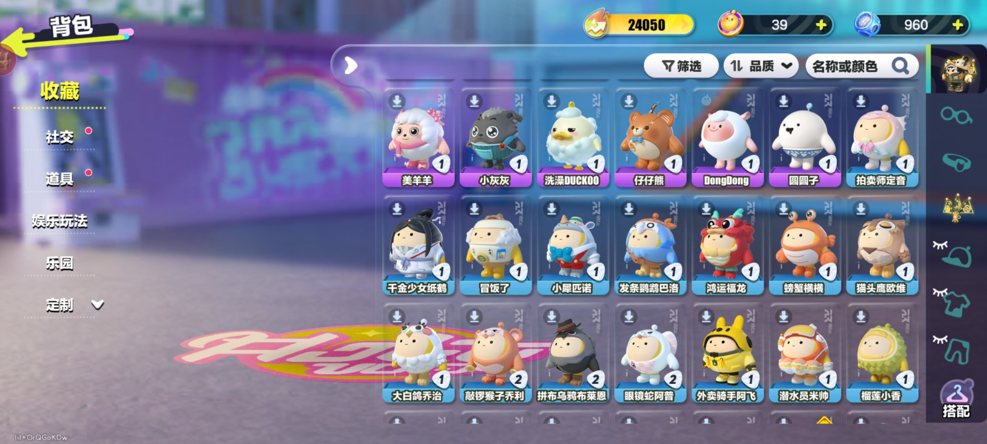 紫皮:DongDong,发美美,音乐家崔利,飞天小猪斑尼,暹罗猫,小福袋添运,极光女神典伊,雪怪瓦图鲁,梅海海,松山山,虎皮卷大灰狼,吼吼,鲤鱼姬小锦,北极兔卢米,梨花诗,元气丸子,袋鼠膨宝,沸羊羊,美羊羊,小灰灰,洗澡 DUCKOO,仔仔熊,圆圆子