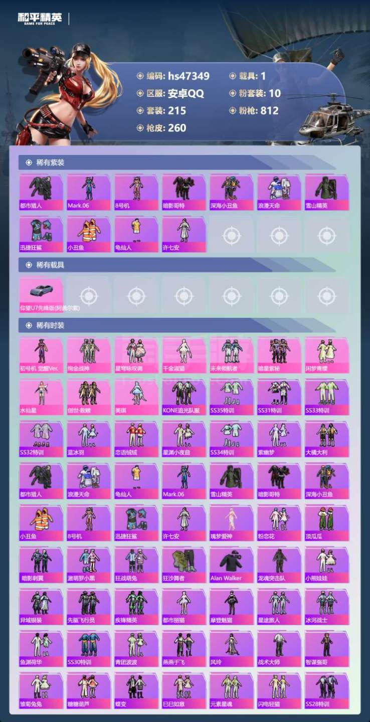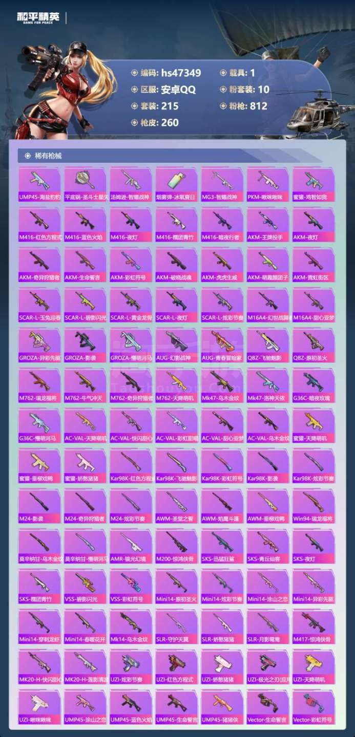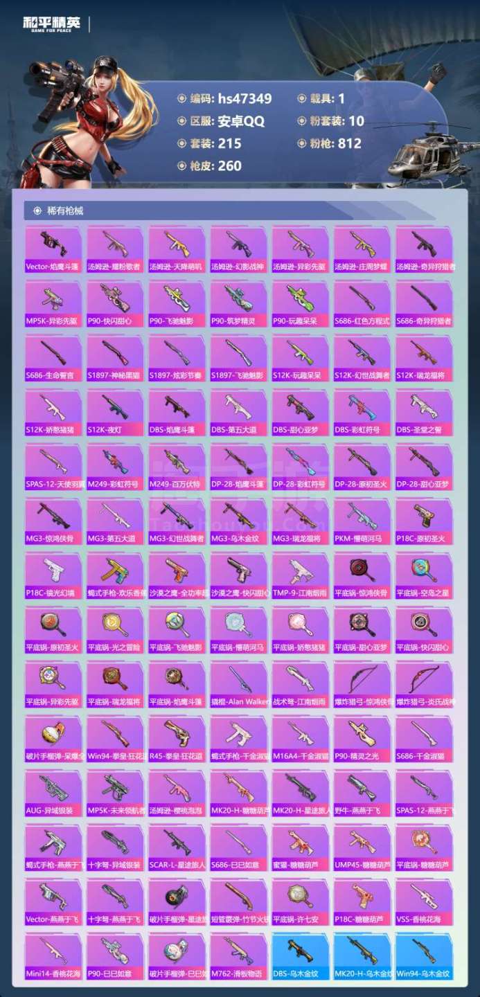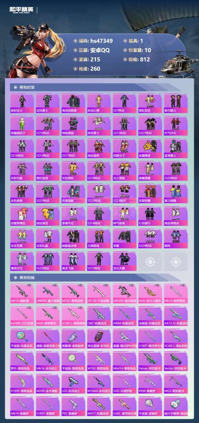 和平精英【安卓QQ】hs47349 安卓手Q-11王牌印记-10粉装-10特效枪-1载具-84418热力值-215套装-