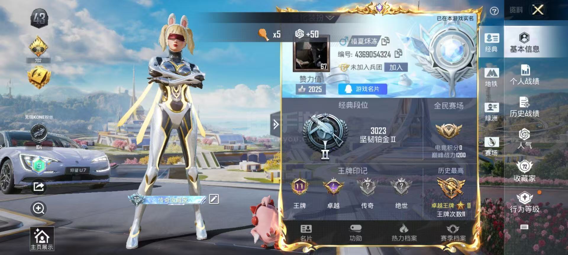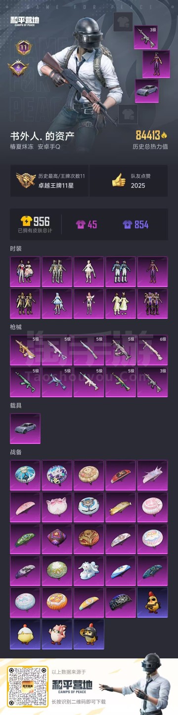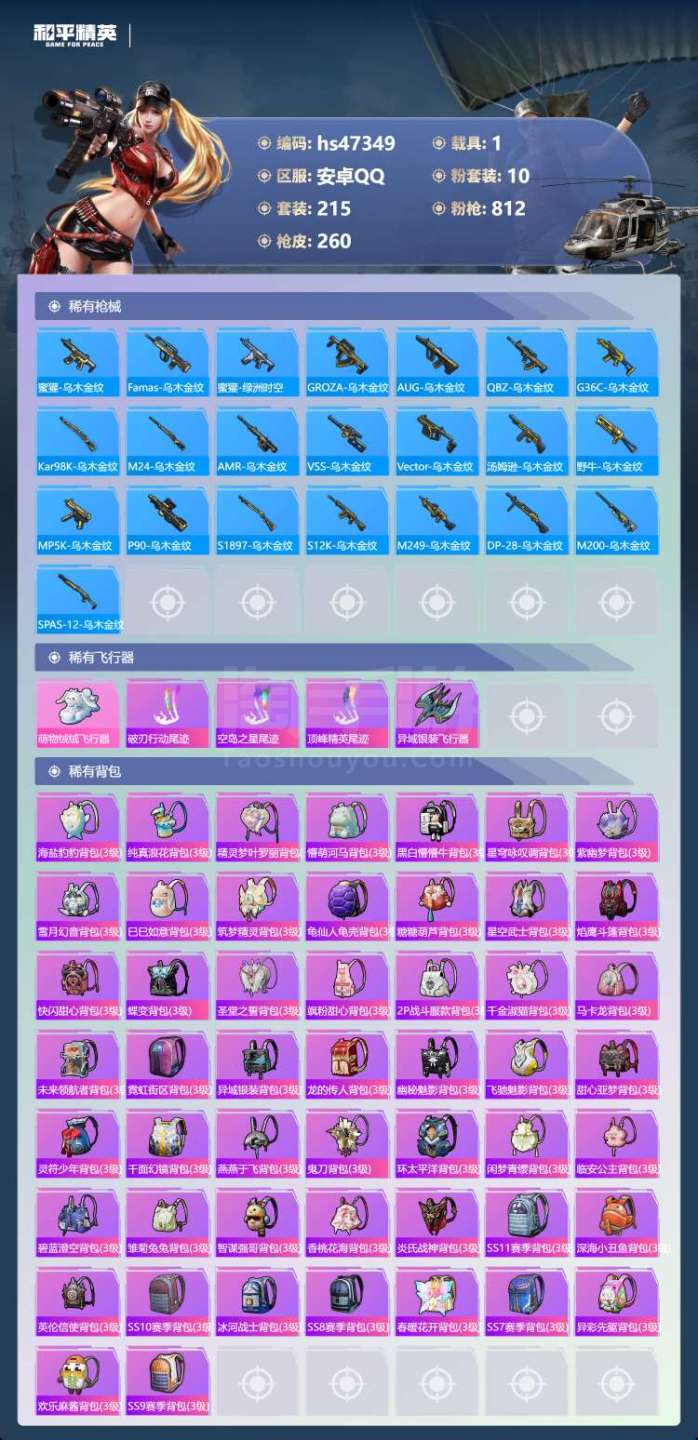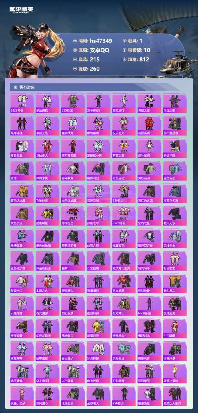 和平精英【安卓QQ】hs47349 安卓手Q-11王牌印记-10粉装-10特效枪-1载具-84418热力值-215套装-