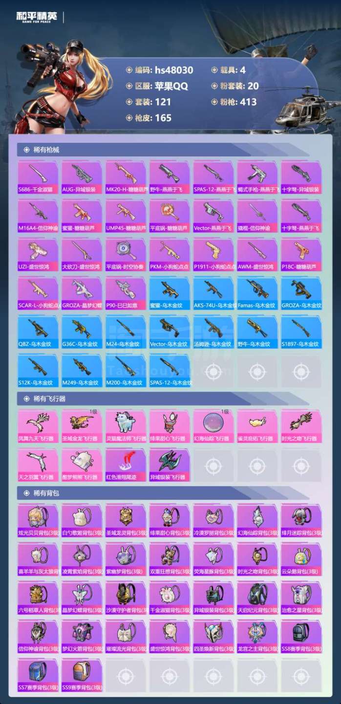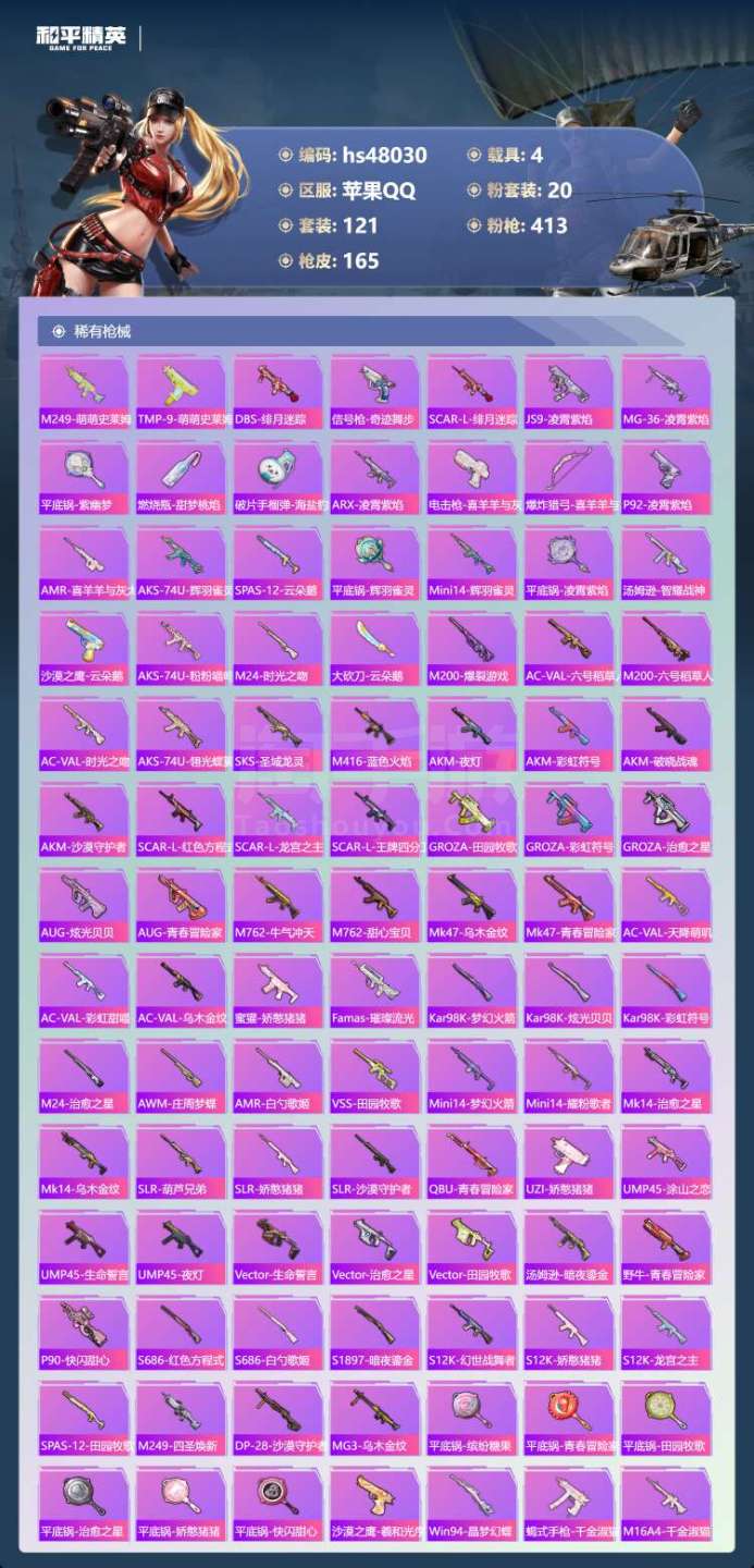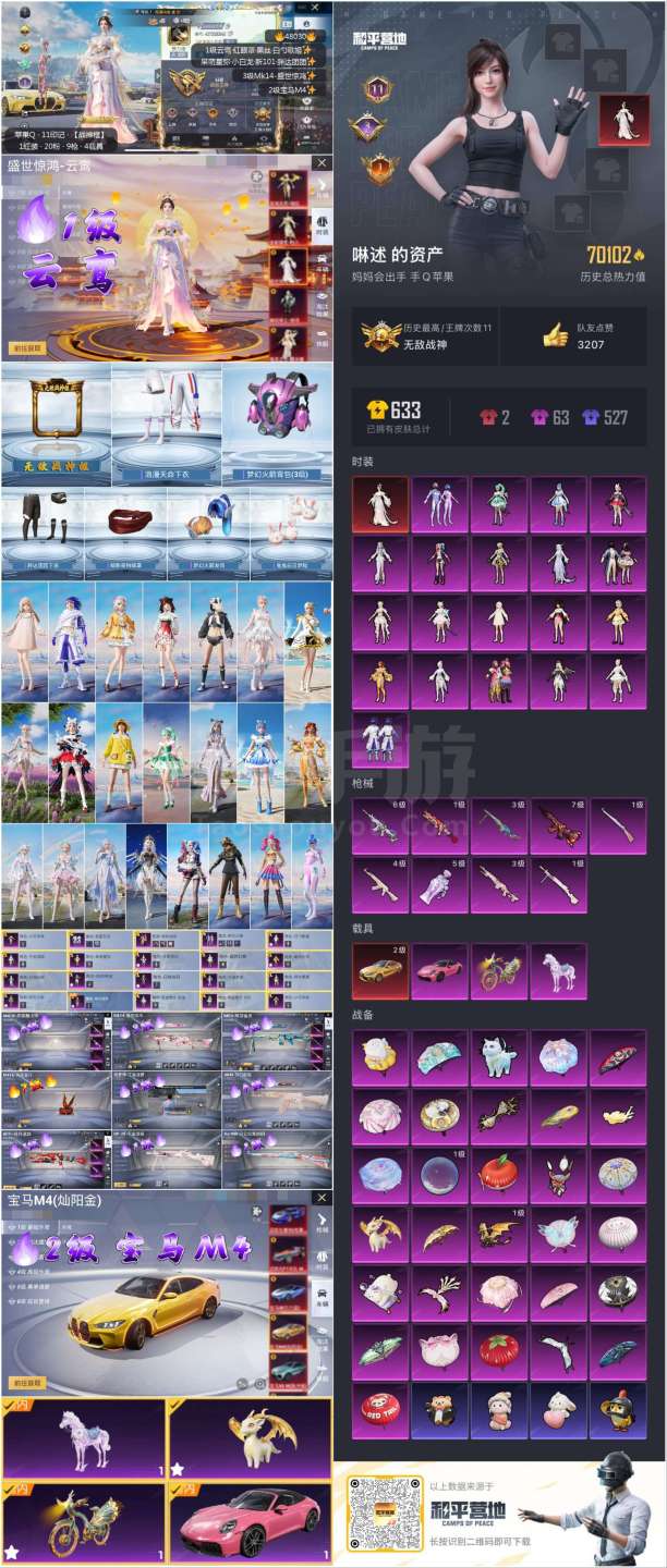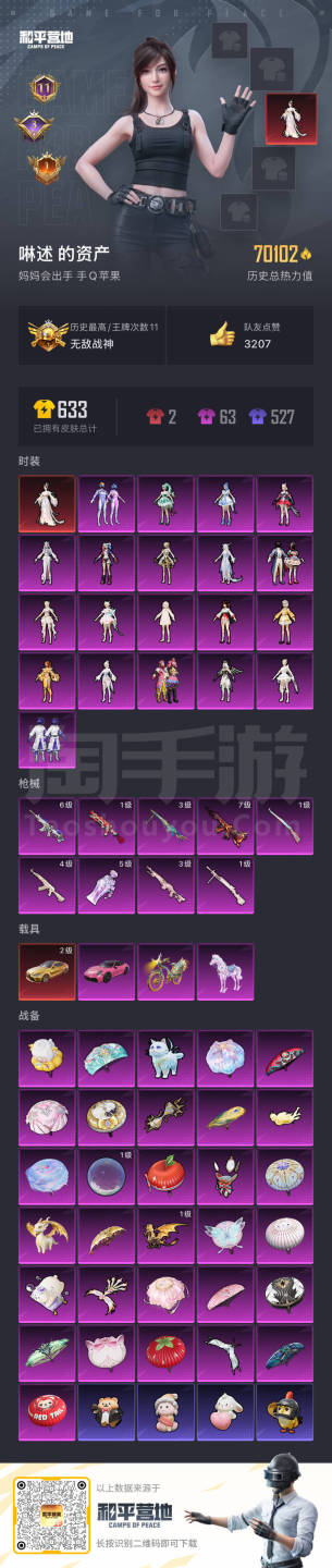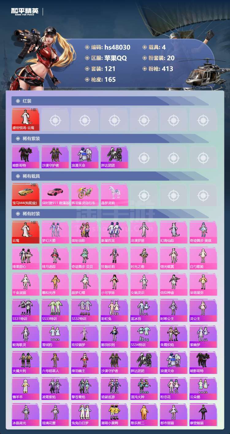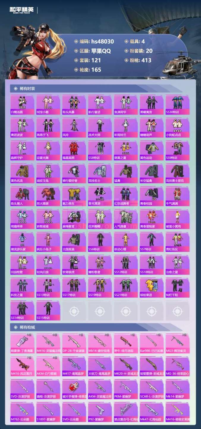 和平精英【苹果QQ】hs48030 苹果手Q-11王牌印记-有战神框-1红装-20粉装-9特效枪-4载具-70102热力