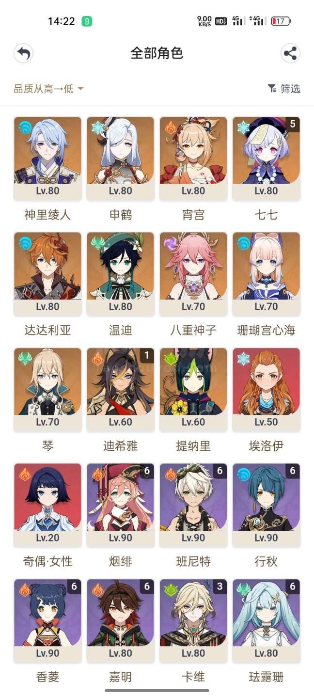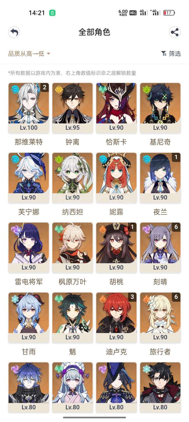 原神【安卓官方】官服81黄,100级那维莱特,95级钟离,2+1龙王,1+3夜兰,1+3胡桃,6命刻晴,5命七七等