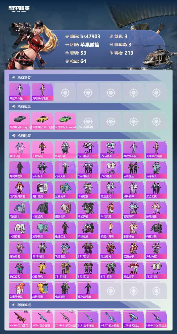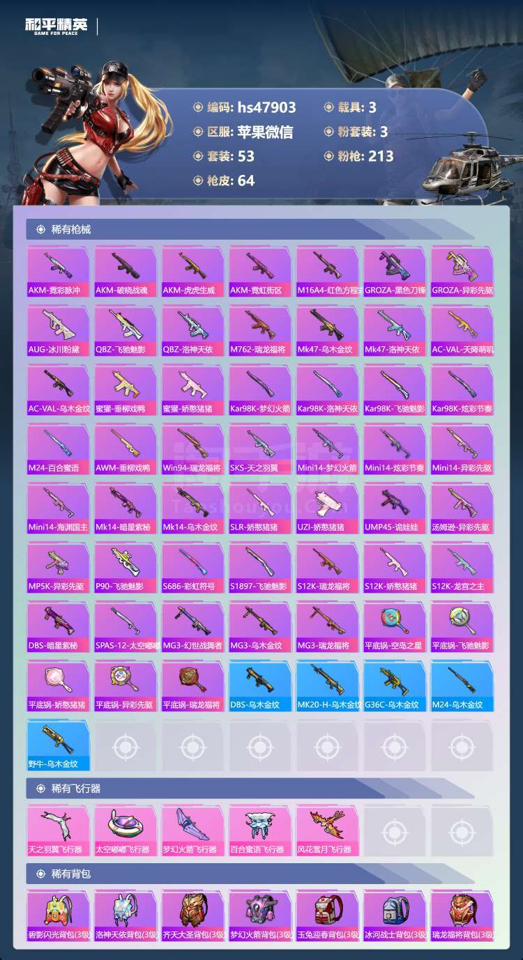 hs47903 苹果微-3王牌印记-3粉装-3特效枪-3载具-26976热力值-53套装-64枪皮