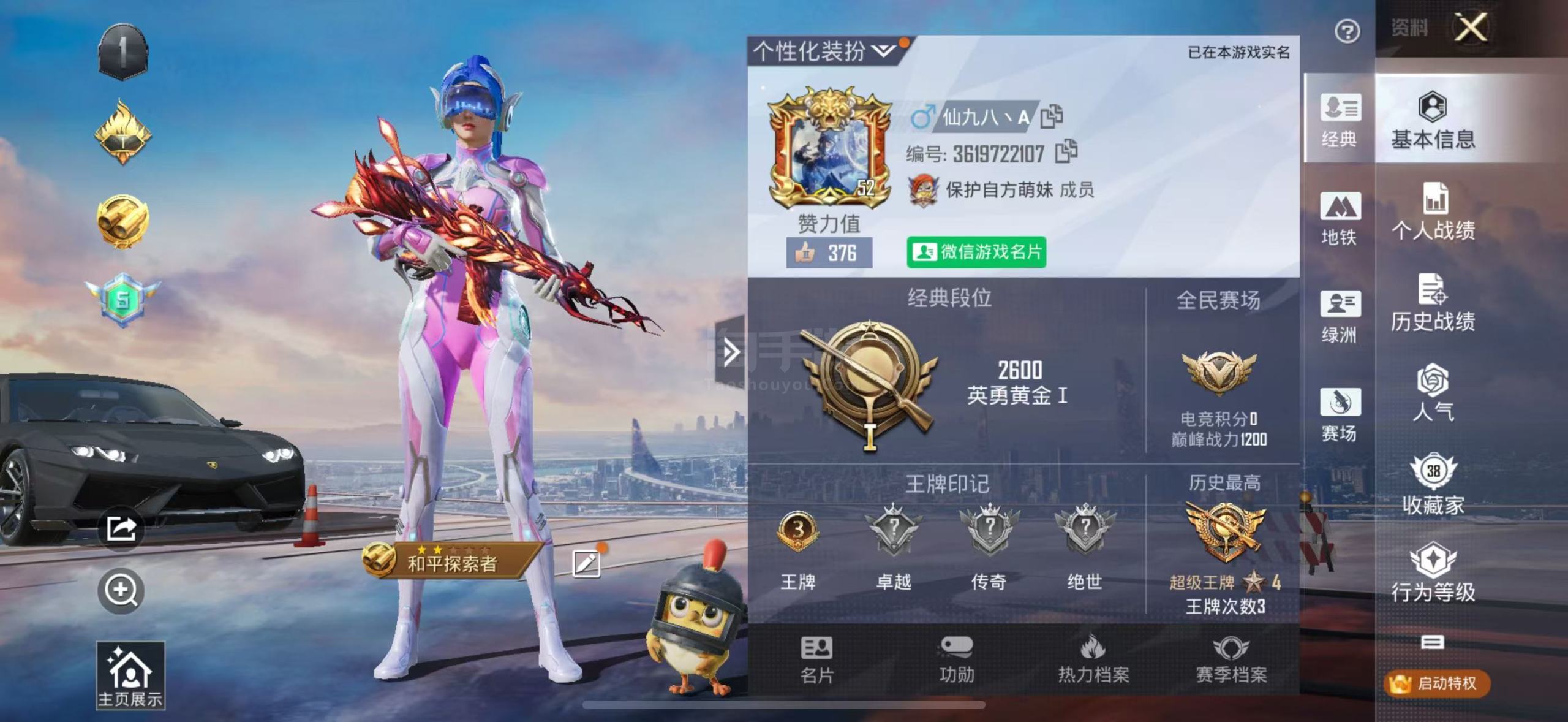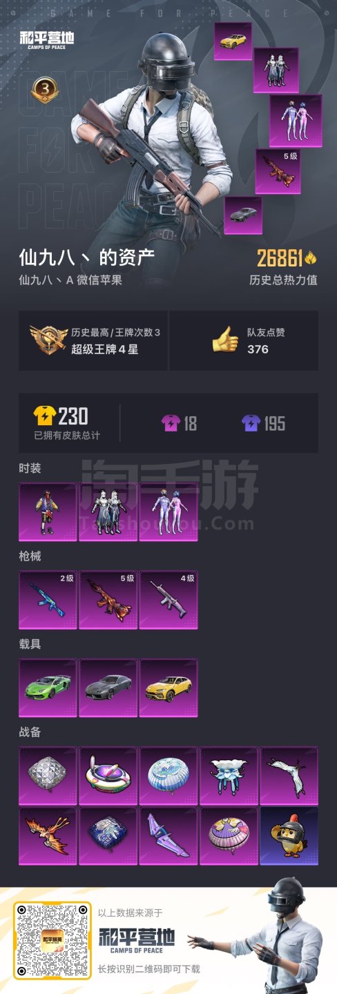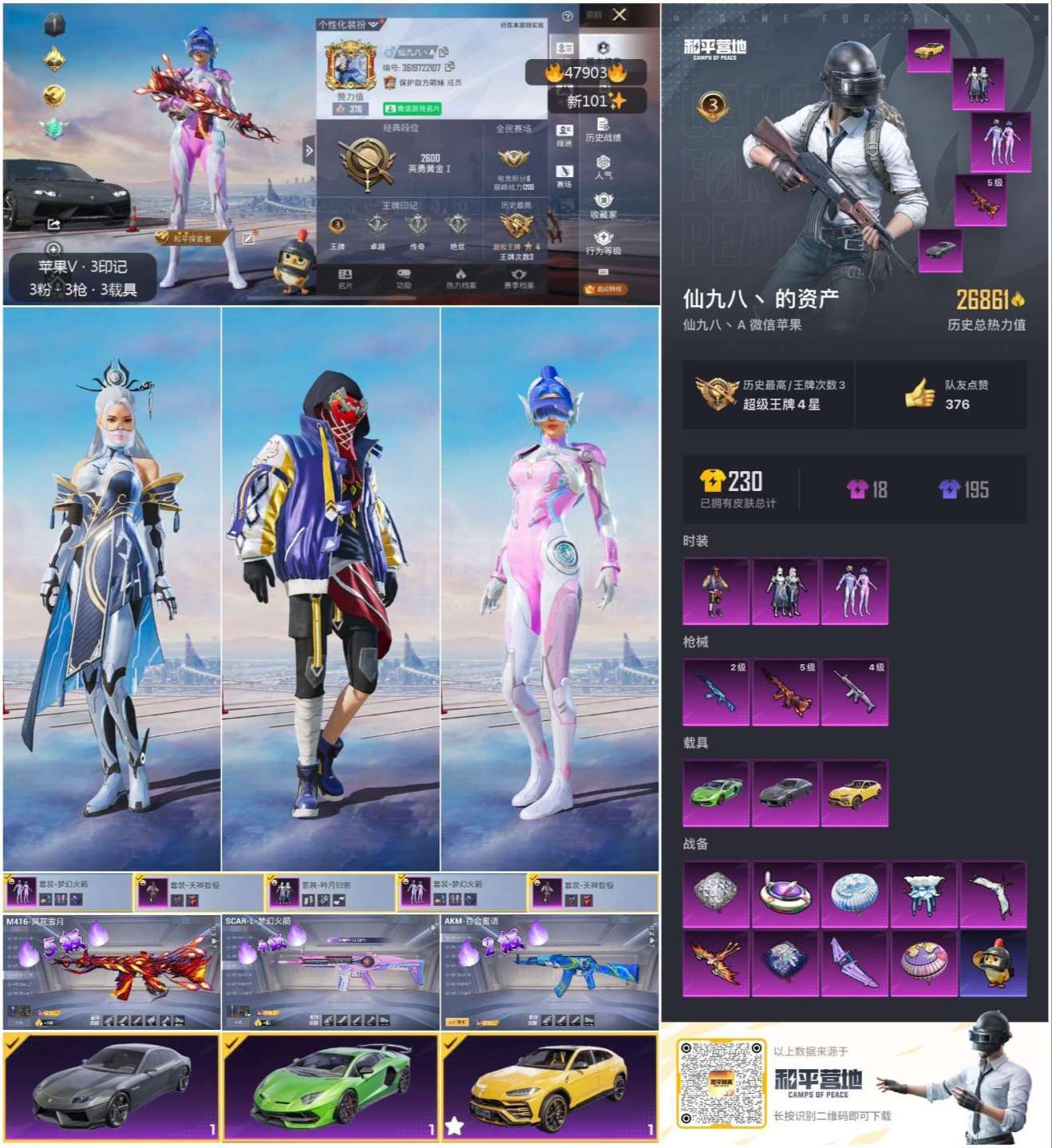 和平精英【苹果微信】hs47903 苹果v-3王牌印记-3粉装-3特效枪-3载具-26976热力值-53套装-64枪皮