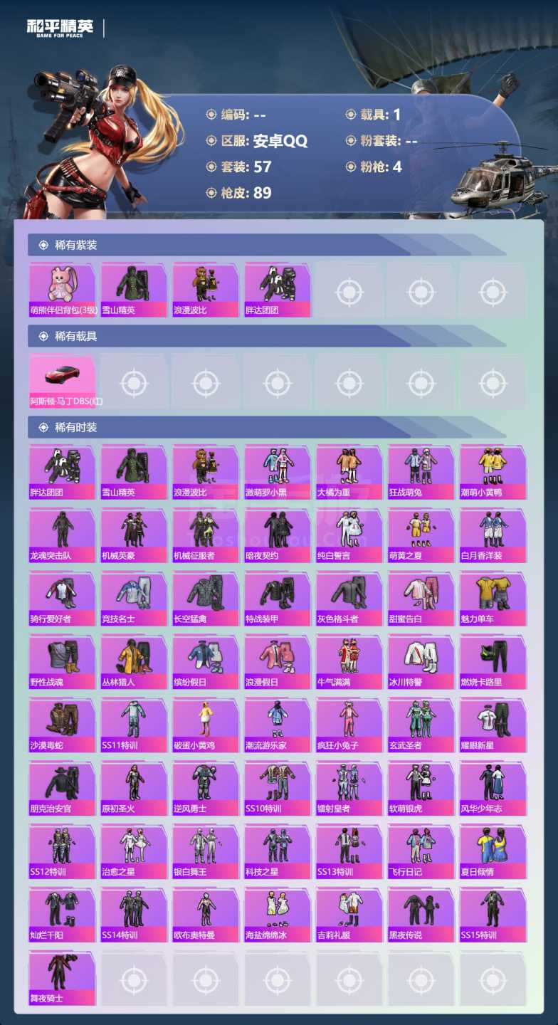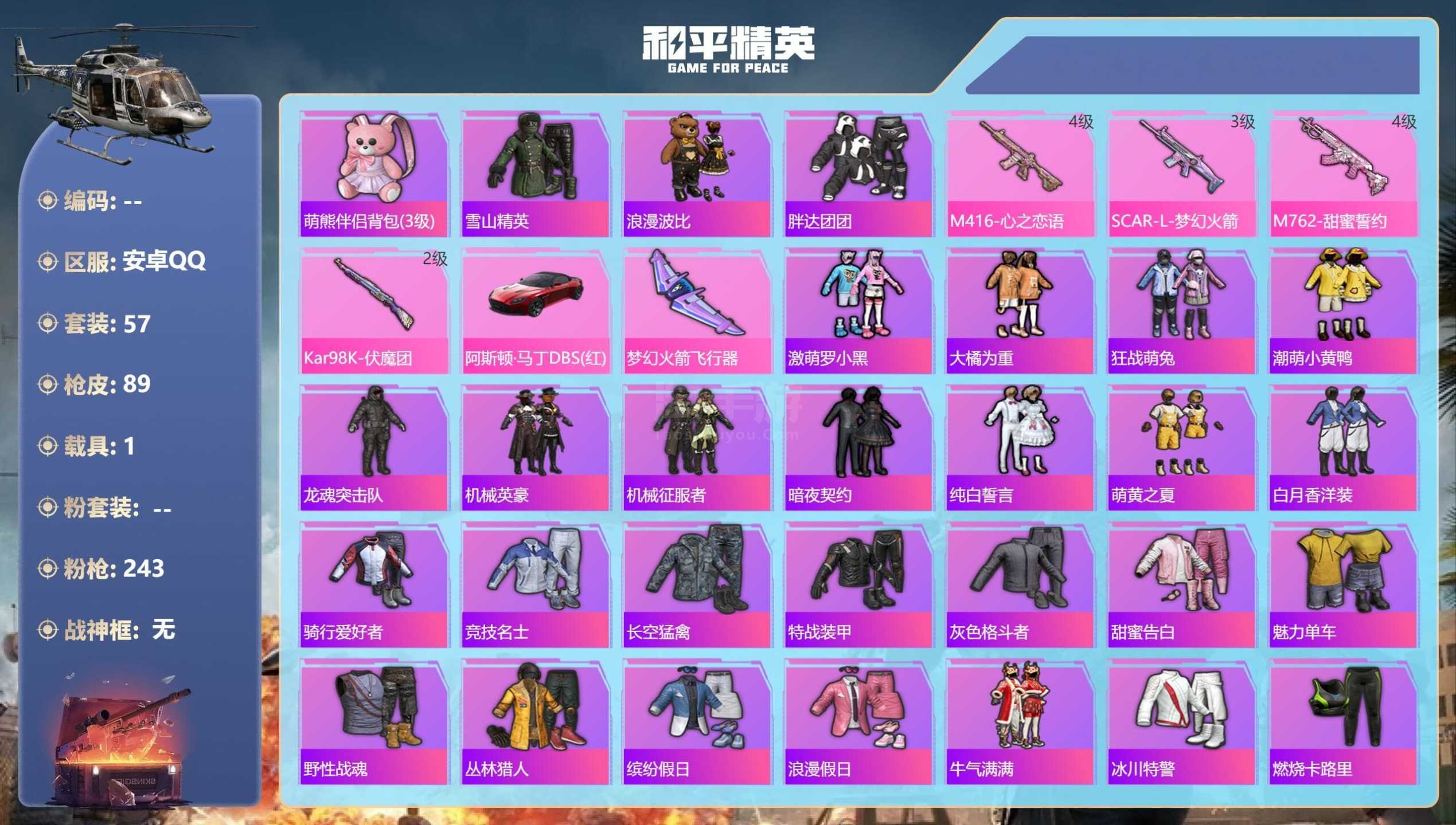 a4065/安卓QQ/-2王牌印记-4特效枪-1载具-28700热力值-57套装-89枪皮