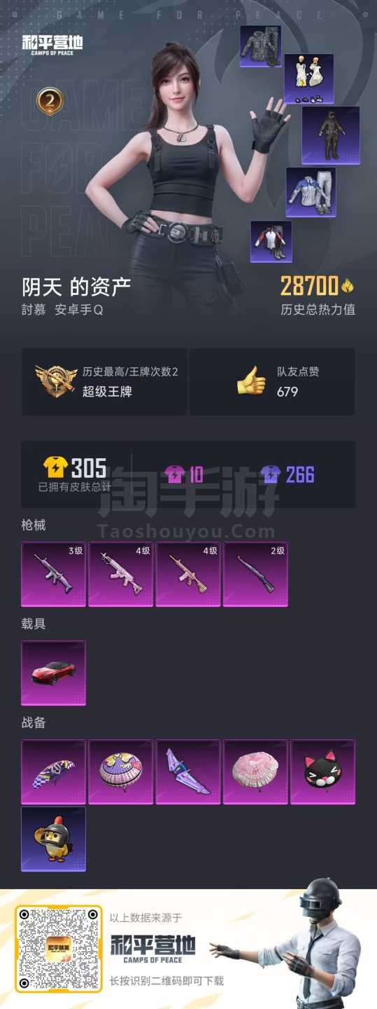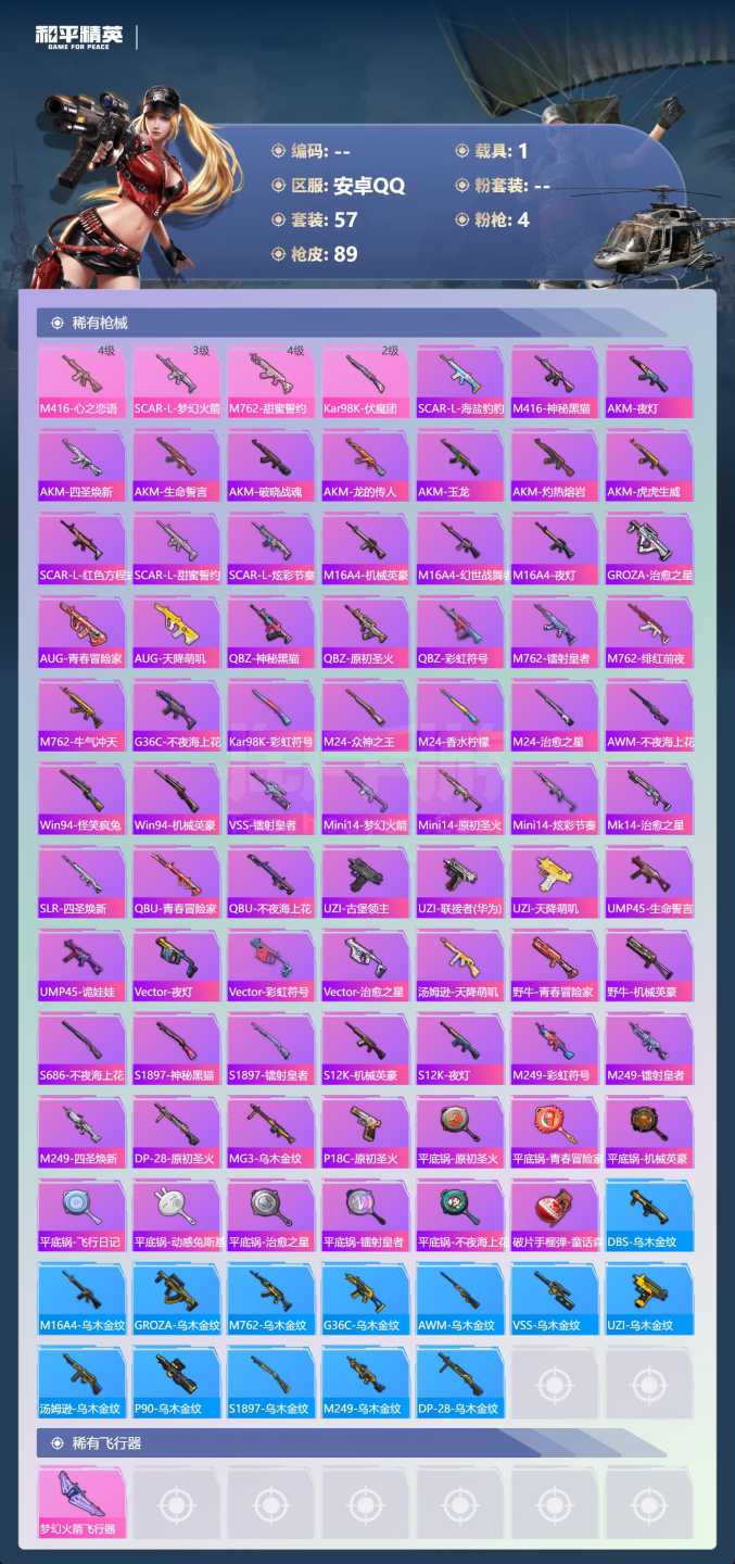 和平精英【安卓QQ】a4065/安卓QQ/-2王牌印记-4特效枪-1载具-28700热力值-57套装-89枪皮