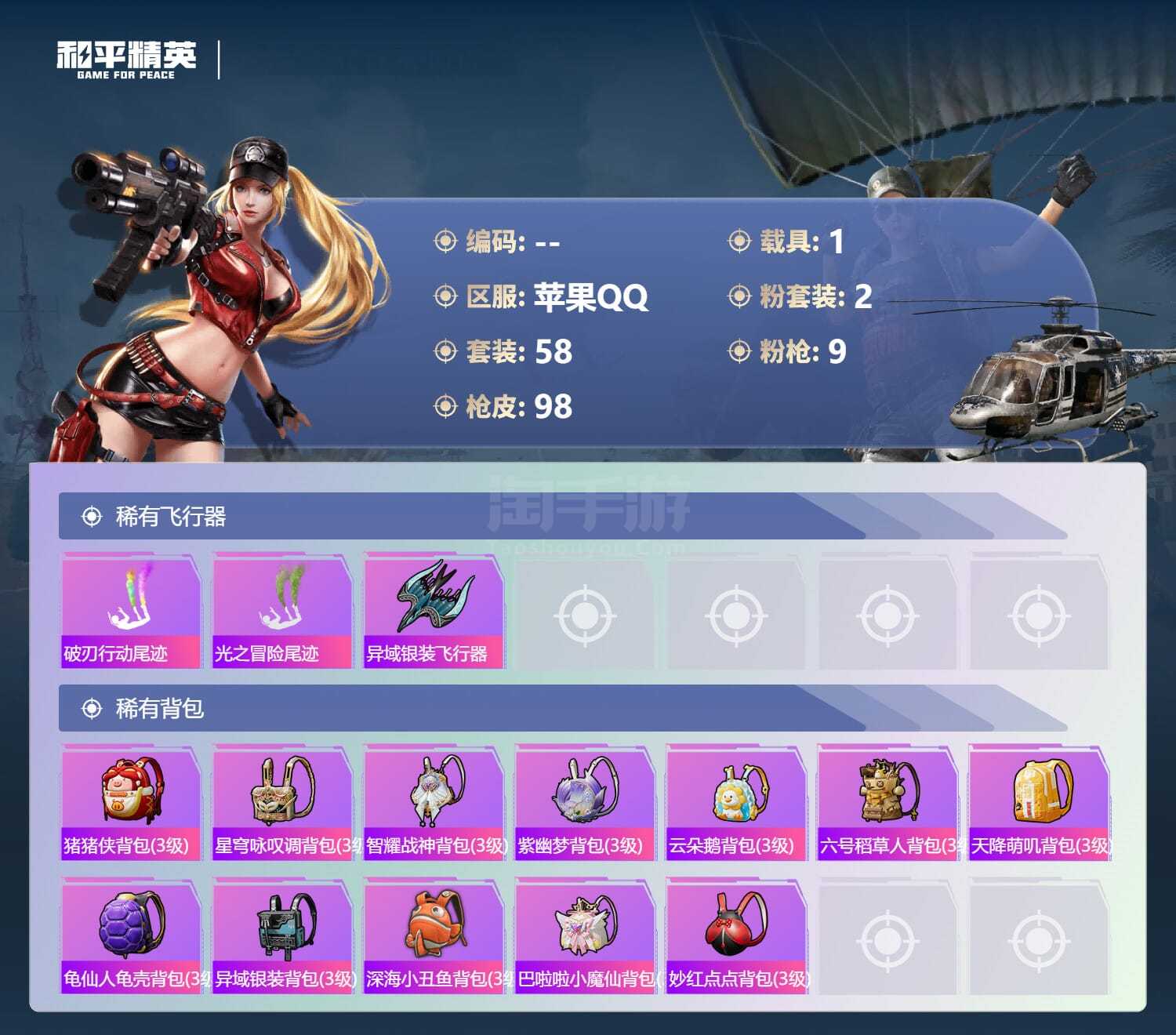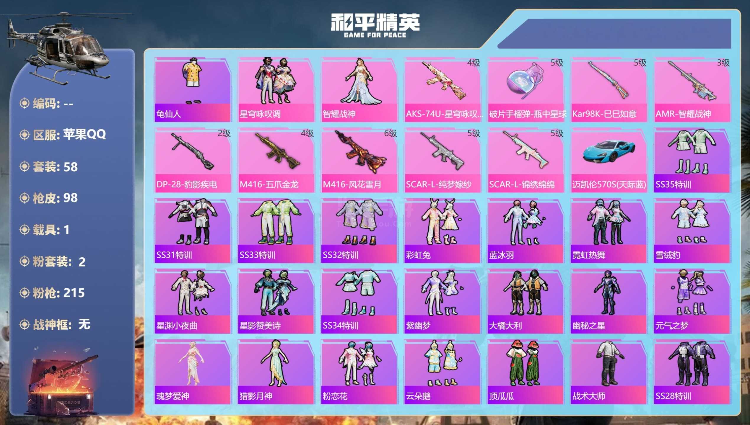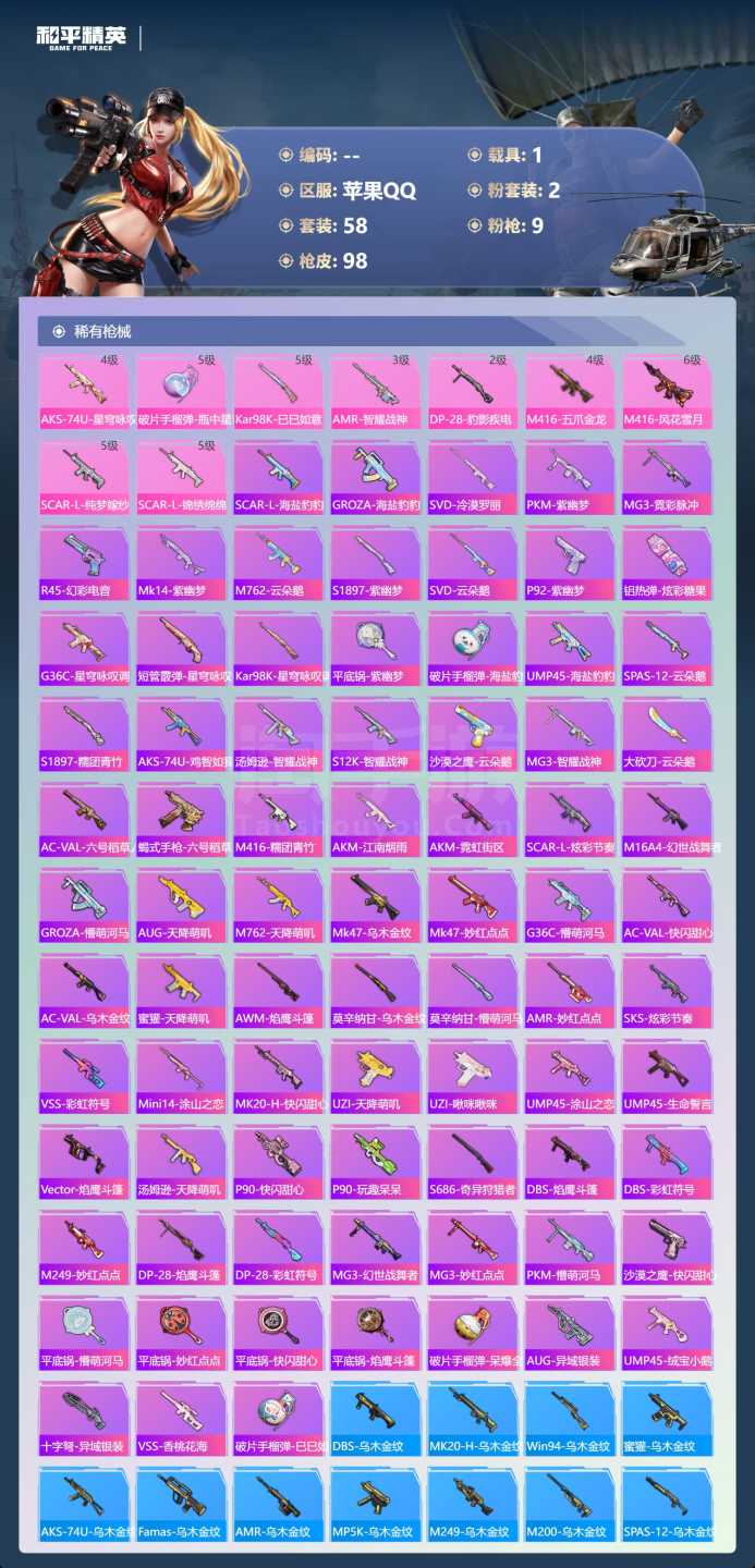a4064/苹果QQ/-5王牌印记-2粉装-9特效枪-1载具-31155热力值-58套装-98枪皮-