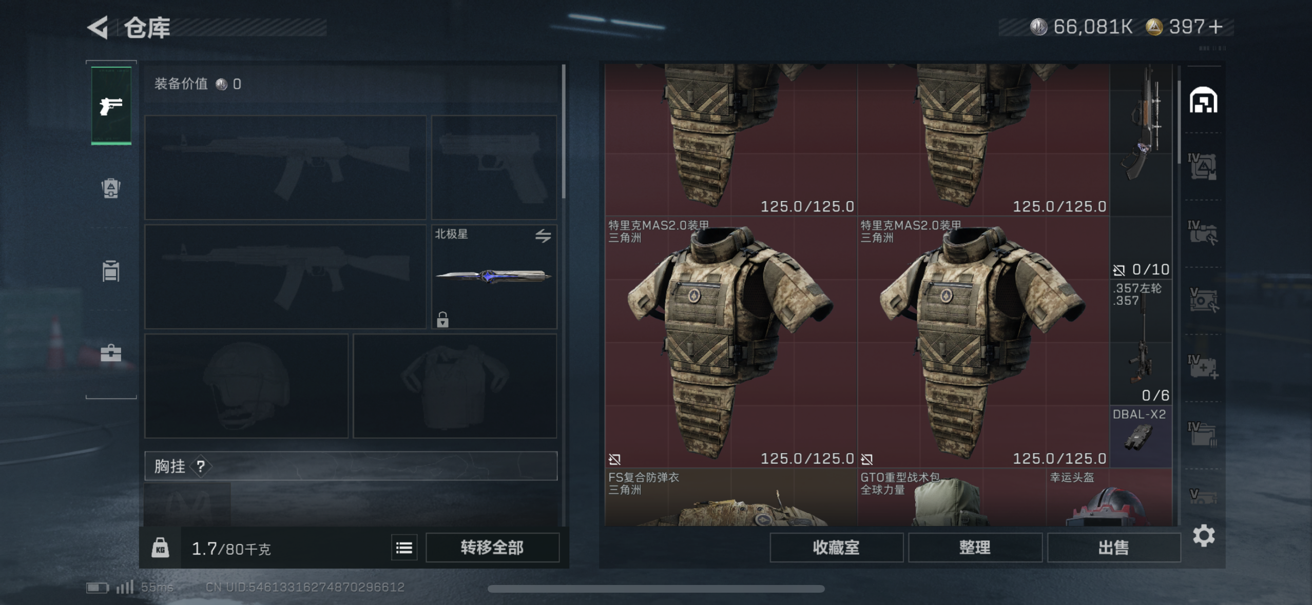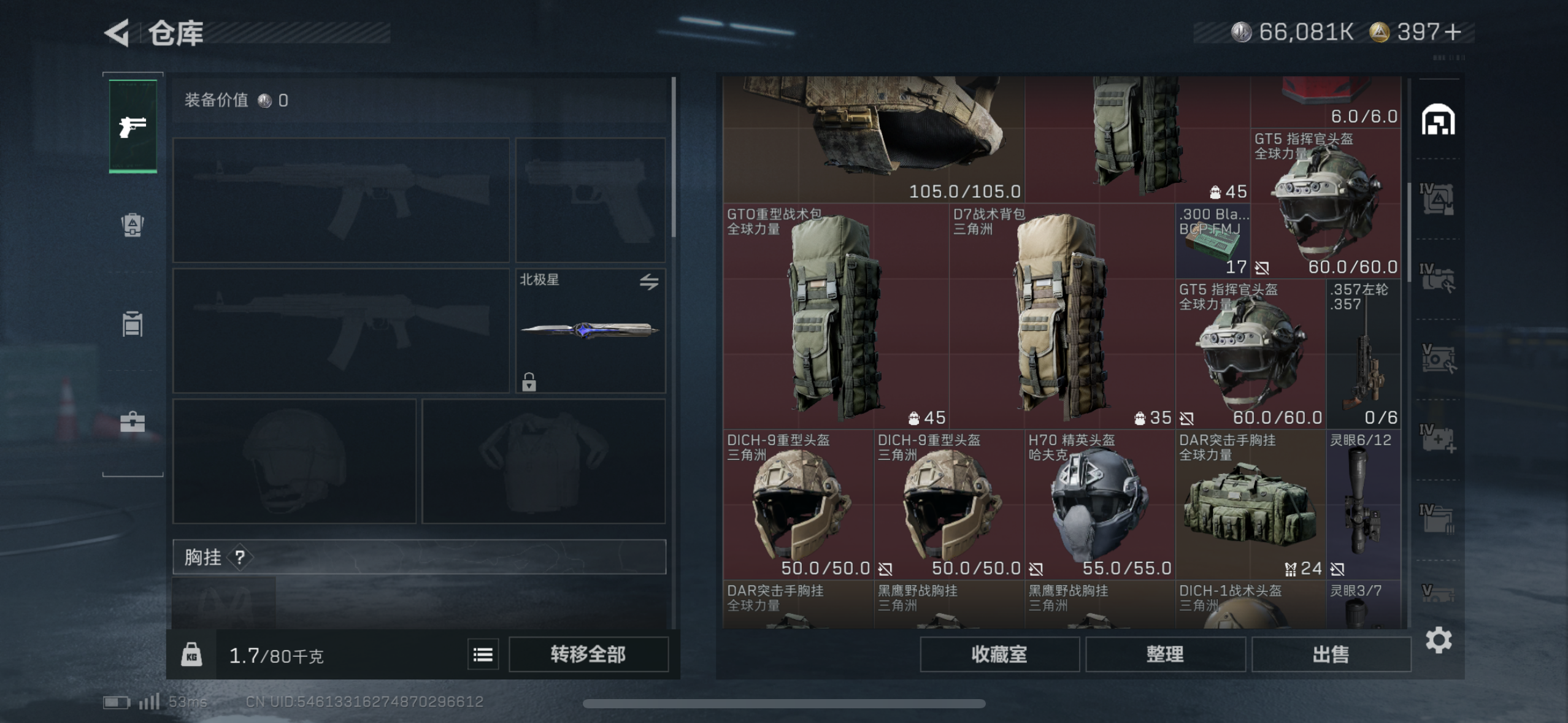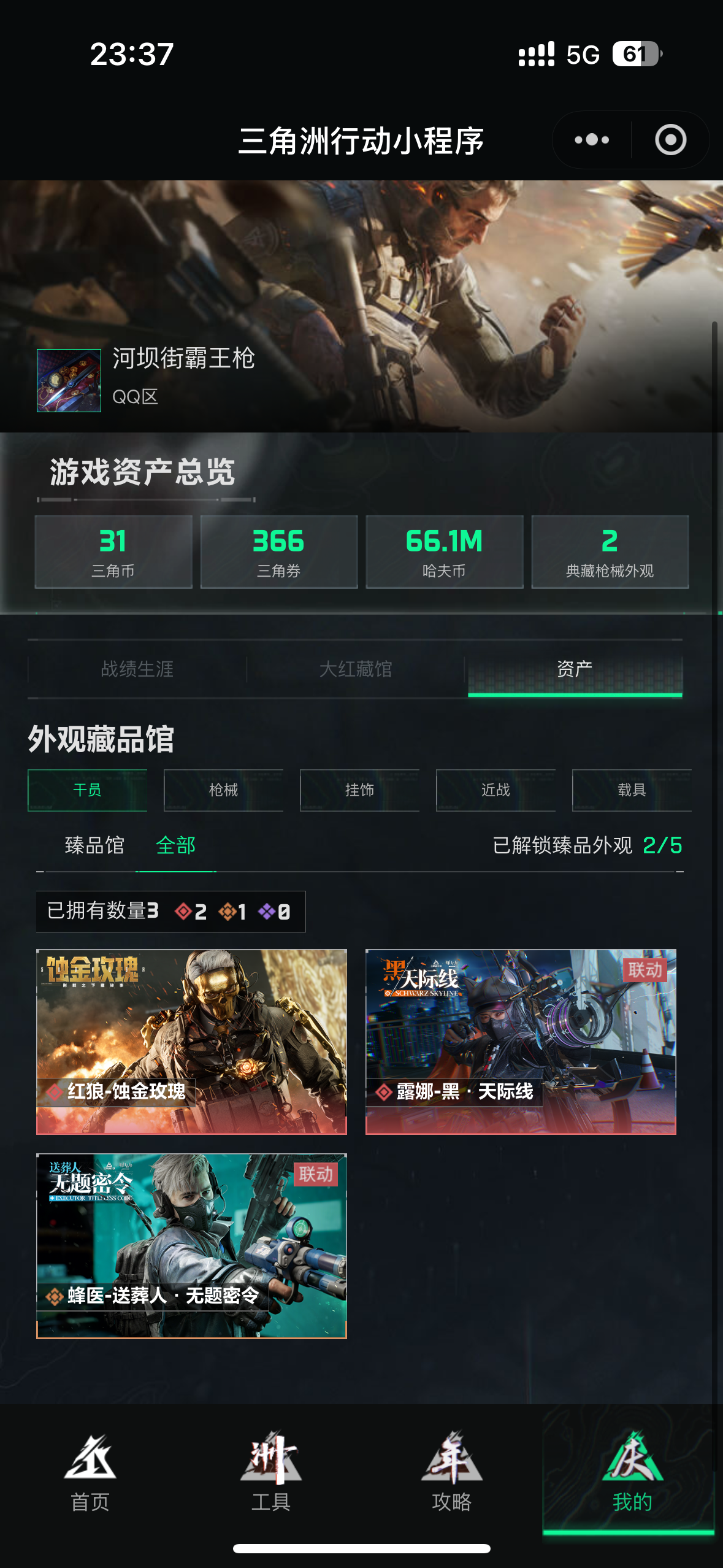 总资产288M,哈夫币6623w,近战2,枪皮数量133,战场等级:8 列兵,行动等级:60 三角洲巅峰,露娜-黑天际线/红狼-蚀金玫瑰/深蓝-不破誓约/蜂医-送葬人无题密令,近战-北极星