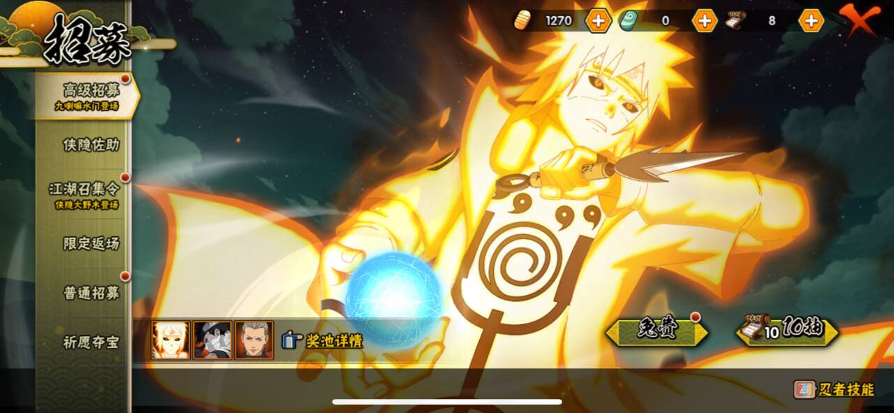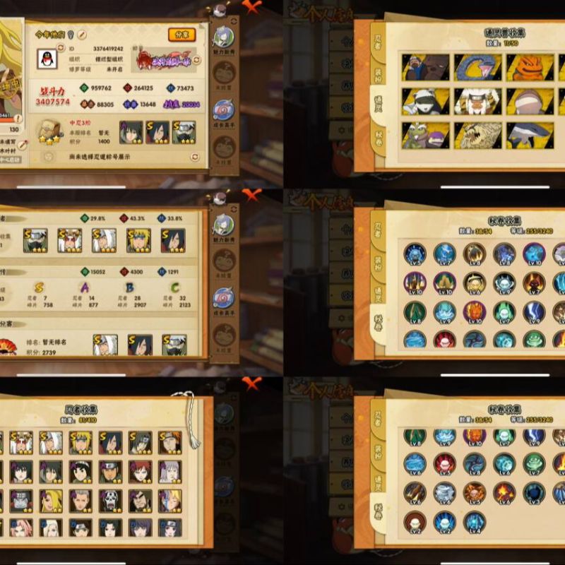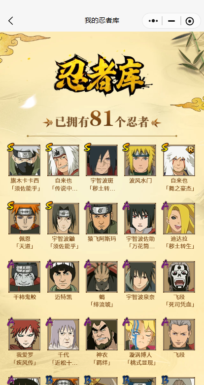 【S忍者】宇智波斑「秽土转生·解」,自来也「舞之豪杰」,旗木卡卡西「须佐能乎」,自来也「传说中的三忍」,宇智波鼬「须佐能乎」,佩恩「天道」,波风水门,