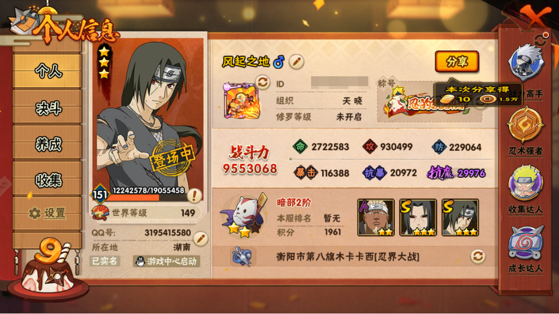 火影忍者【苹果QQ】955w战力超26S+11直购52A+2紫色入场效果+88片
