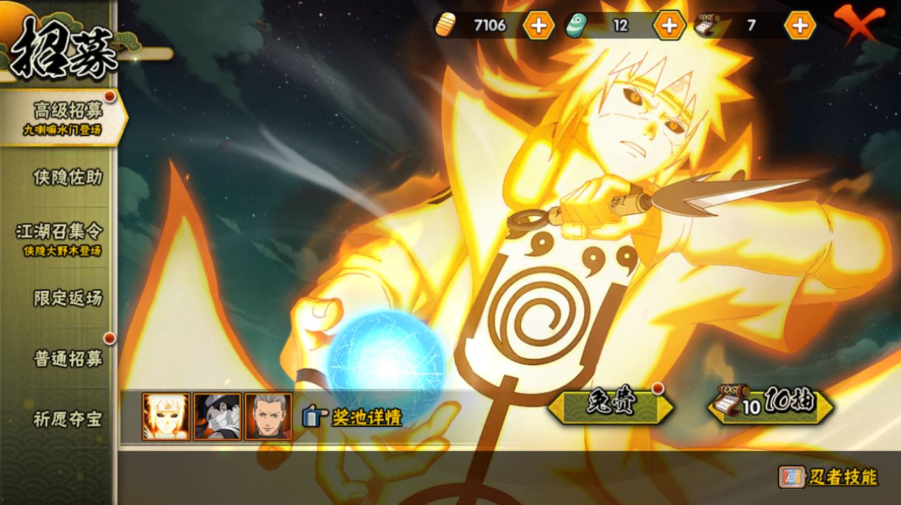 【S忍者】艾「忍界大战」,大筒木桃式,宇智波斑「秽土转生·解」,千手柱间「木叶创立」,宇智波佐助「永恒万花筒」,漩涡鸣人「九喇嘛连结」,迈特凯「S门」,自来也「舞之豪杰」,宇智波斑「白面具」,千手扉间「秽土转生」,猿飞日斩「秽土转生」,宇智波鼬「须佐能乎」,佩恩「天道」,波风水门,大蛇丸,