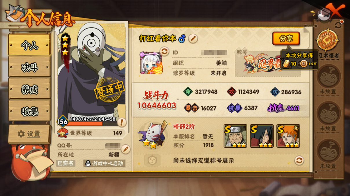 火影忍者【苹果QQ】1064W战力白破超34S+12直购A62A+5个直购通灵战