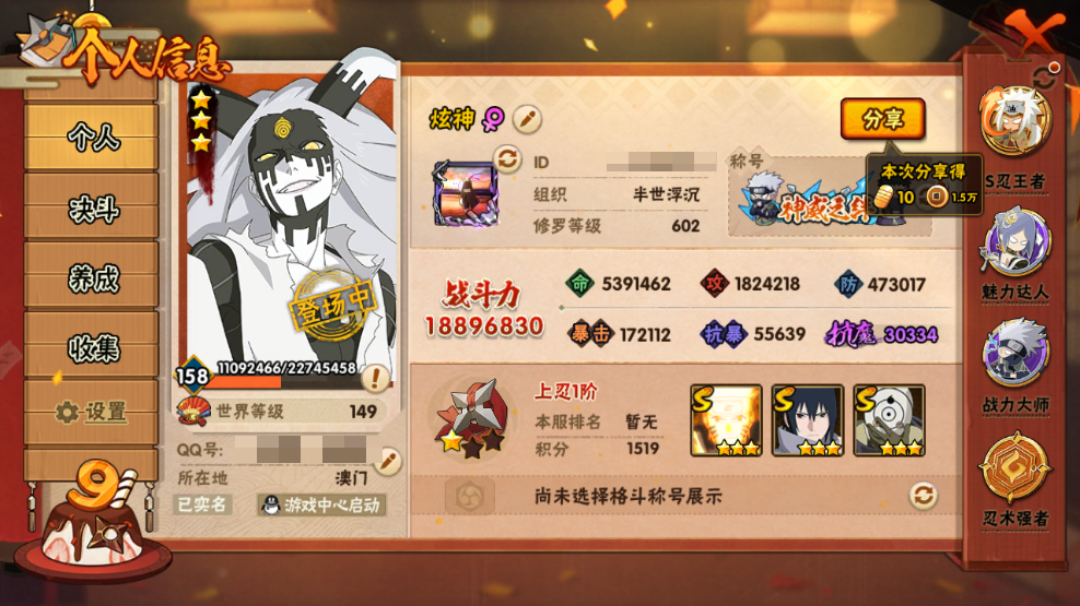 火影忍者【苹果QQ】1889w白破+死水41s+4直购45A+80片止水战力18