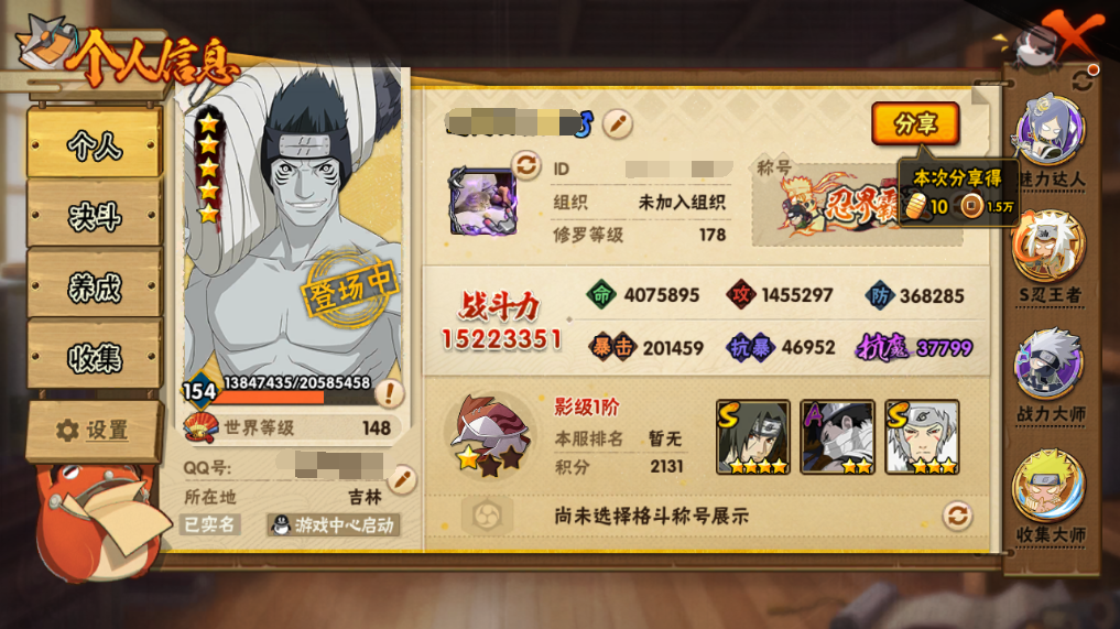 火影忍者【苹果QQ】1522w战力创柱+白破36S+10个198直购A/2个紫皮