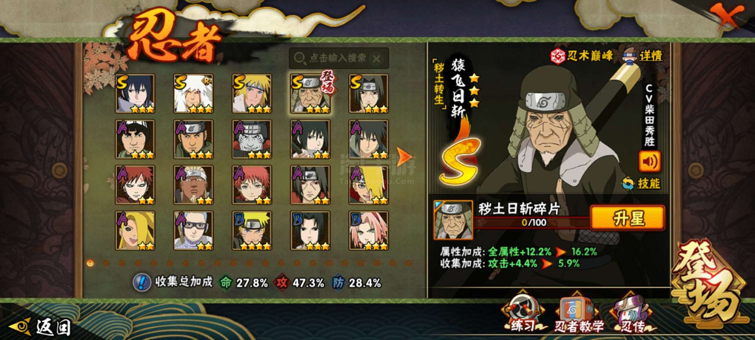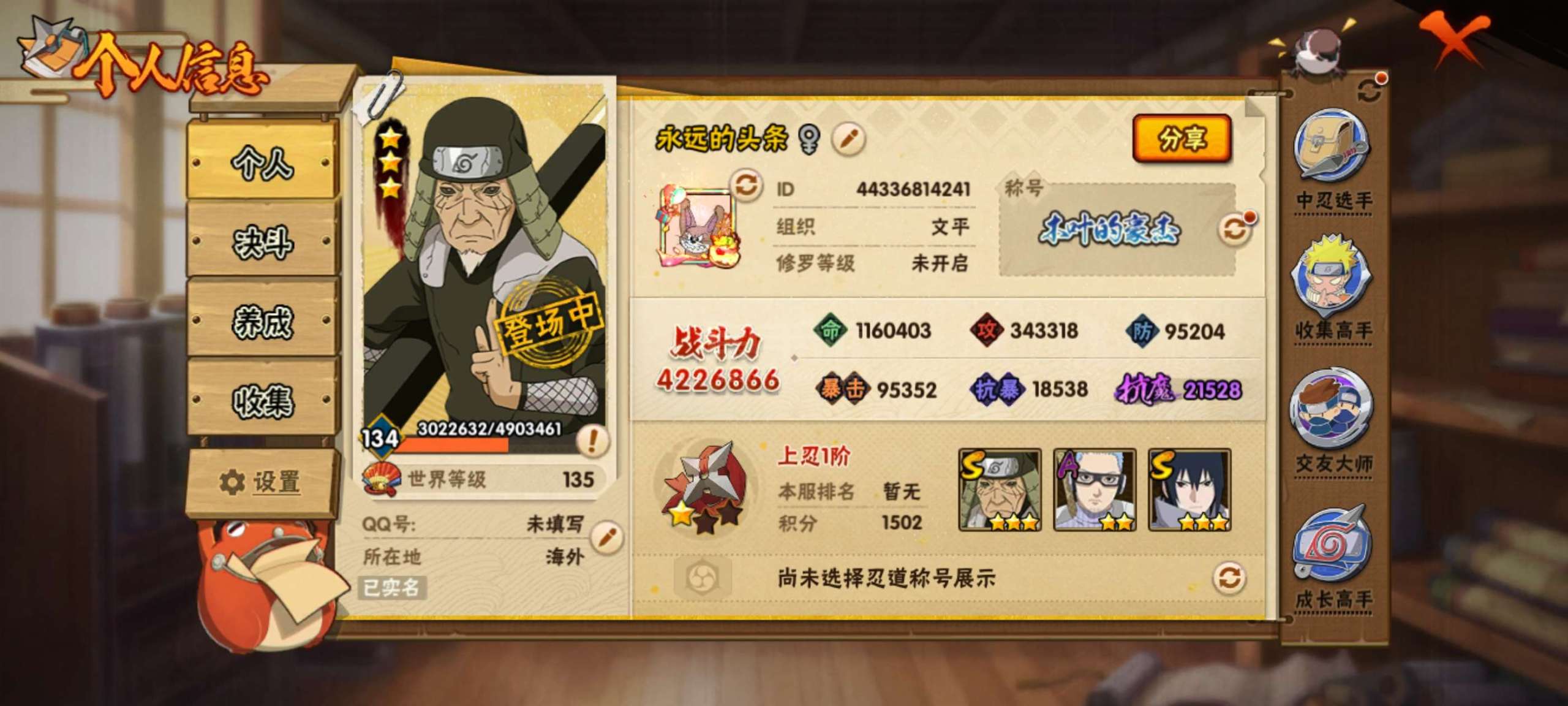 火影忍者【安卓QQ】v5 422w战力账号 秽土三代 永恒万花筒佐助 百战水门 百战鼬 川自 还有106张高招劵