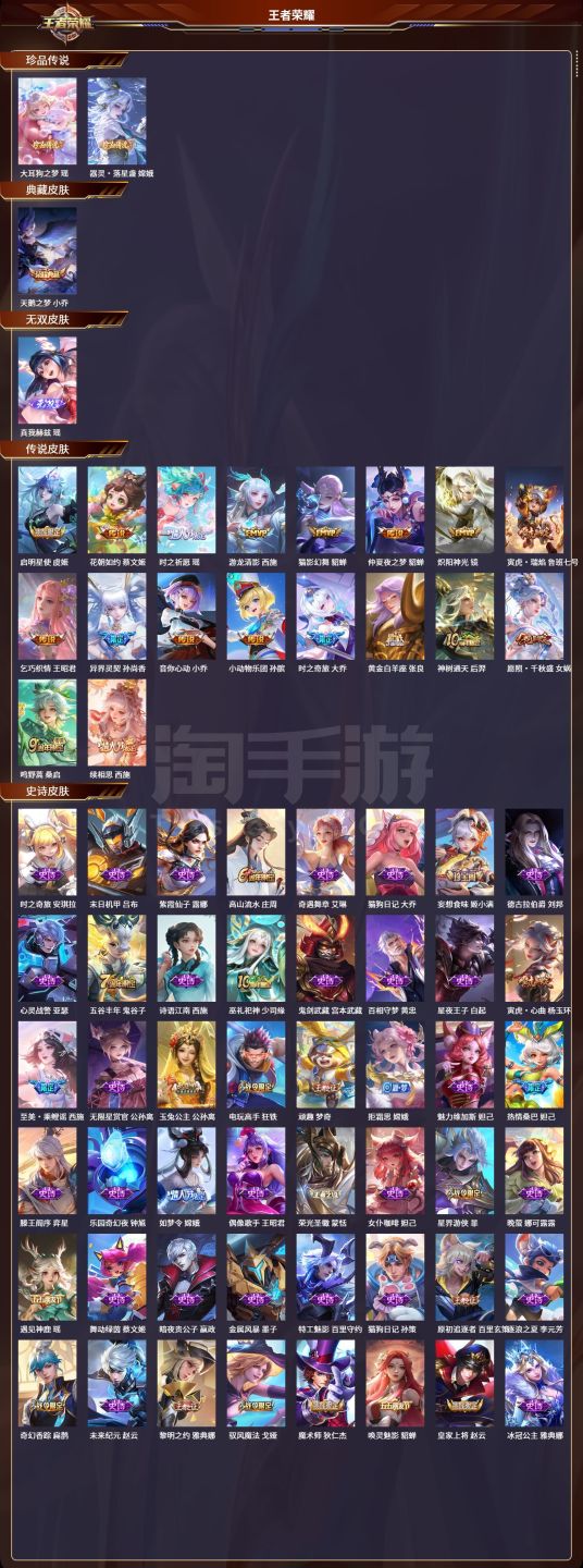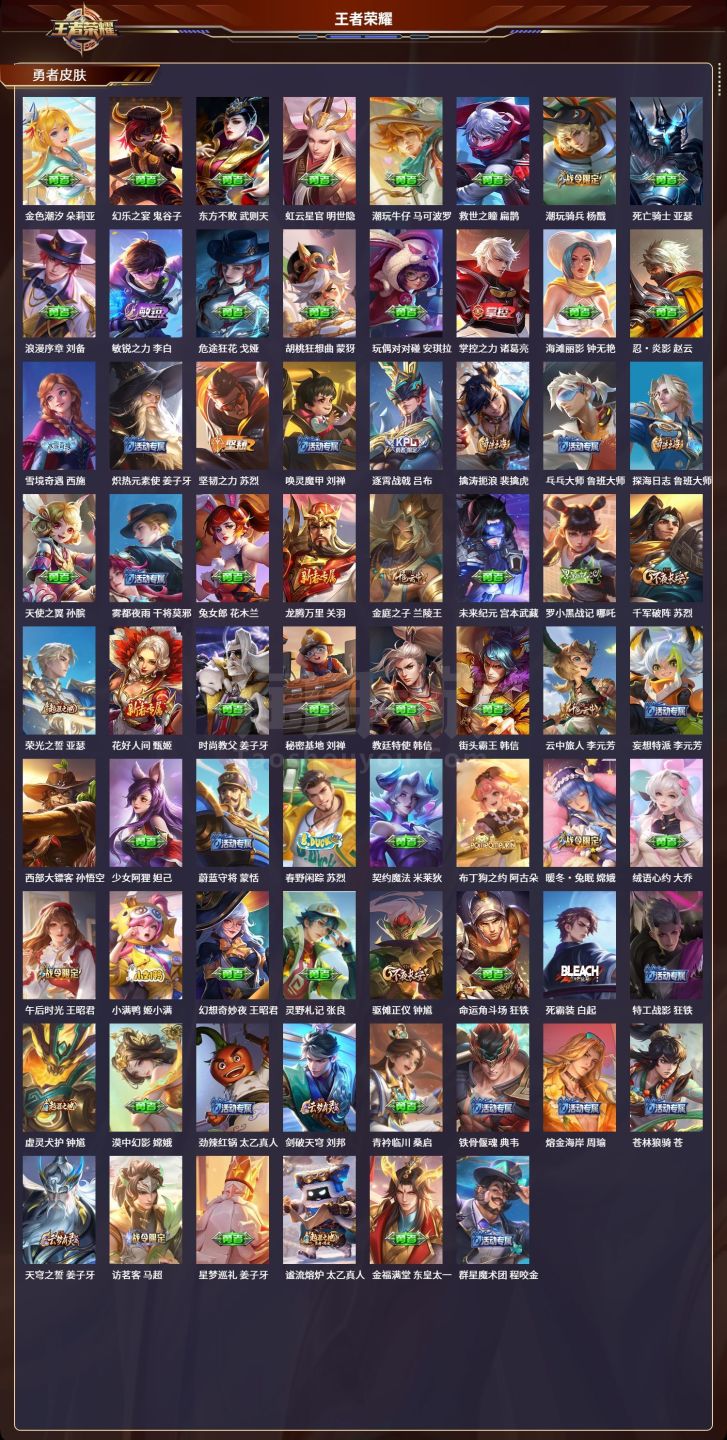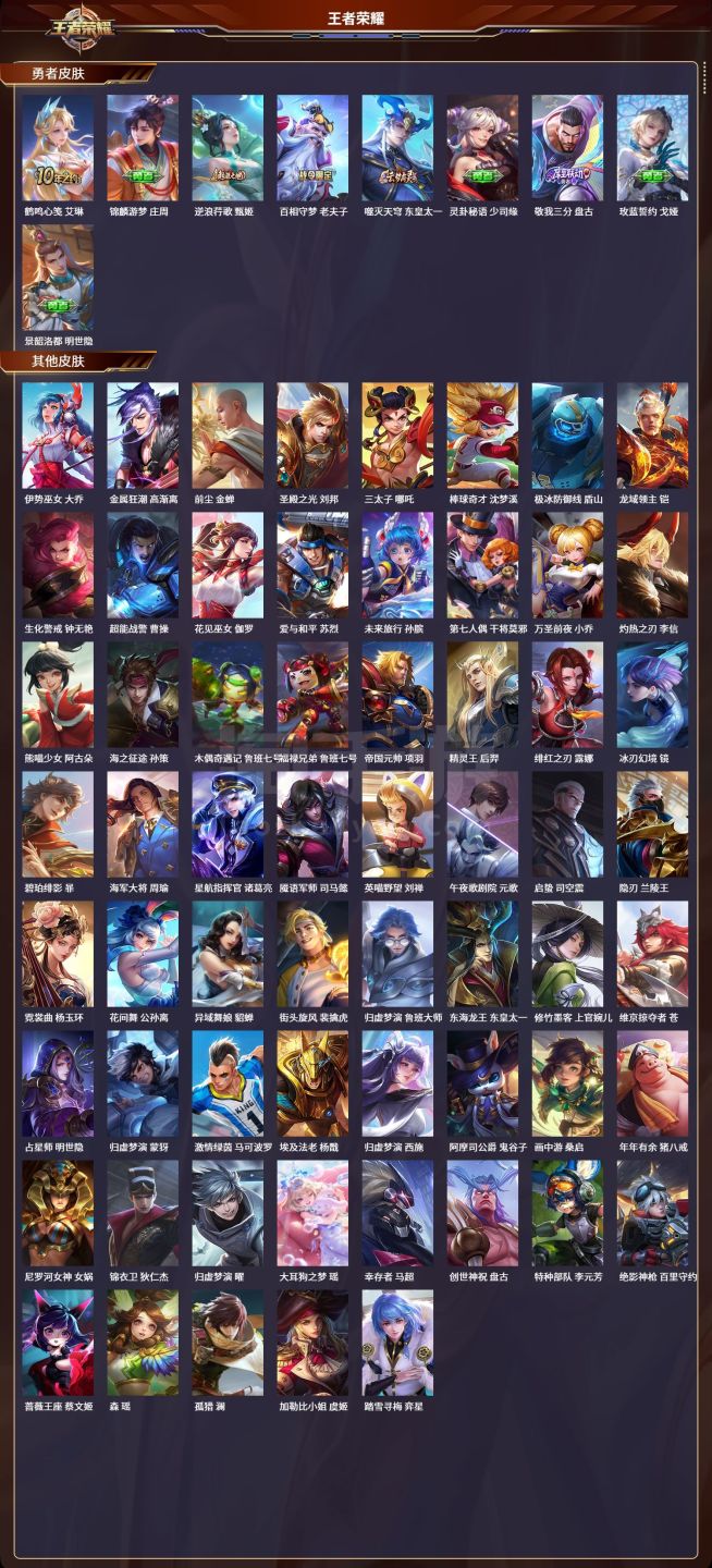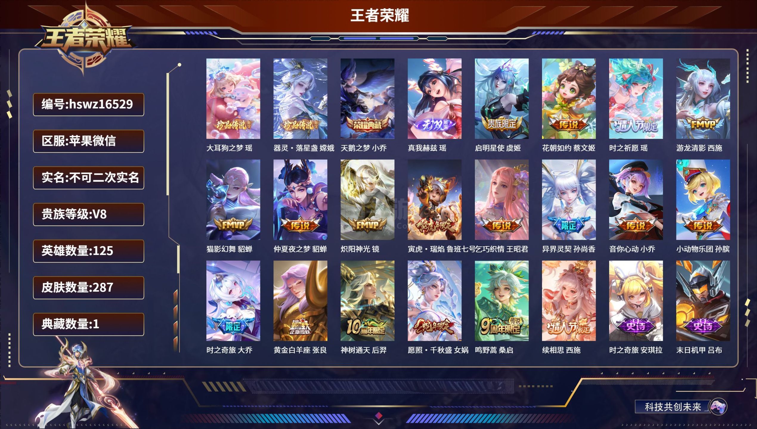 苹果v/最强王者/287皮肤/125英雄/1典藏/0珍品无双/1无双/2珍品传说/18传说/78史