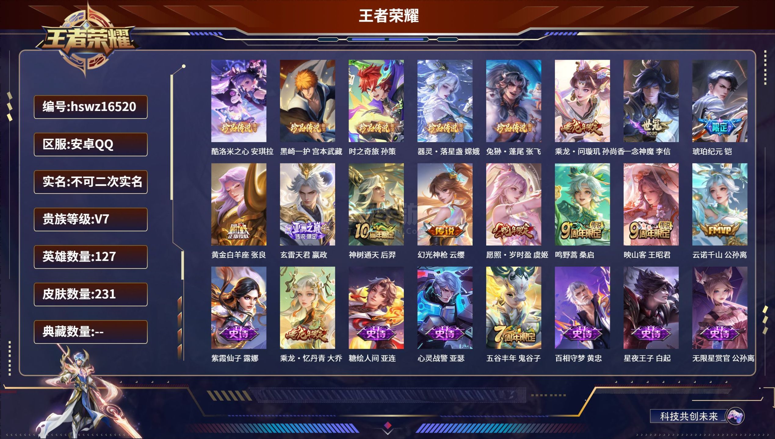 王者荣耀【安卓QQ】安卓QQ/永恒钻石/231皮肤/127英雄/0典藏/0珍品无双/0无双/5珍品传说/11传说/65史