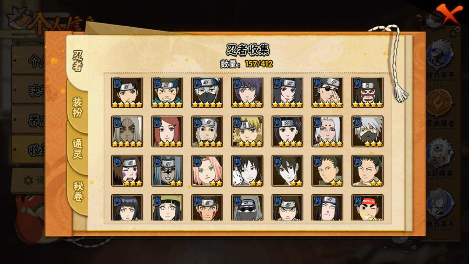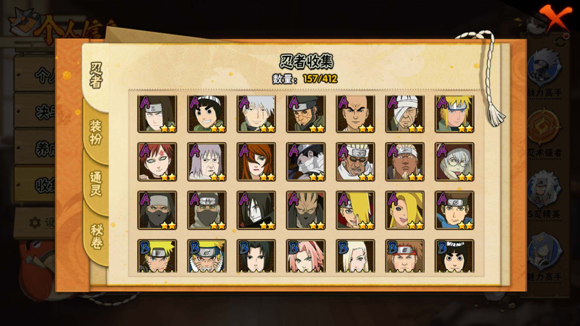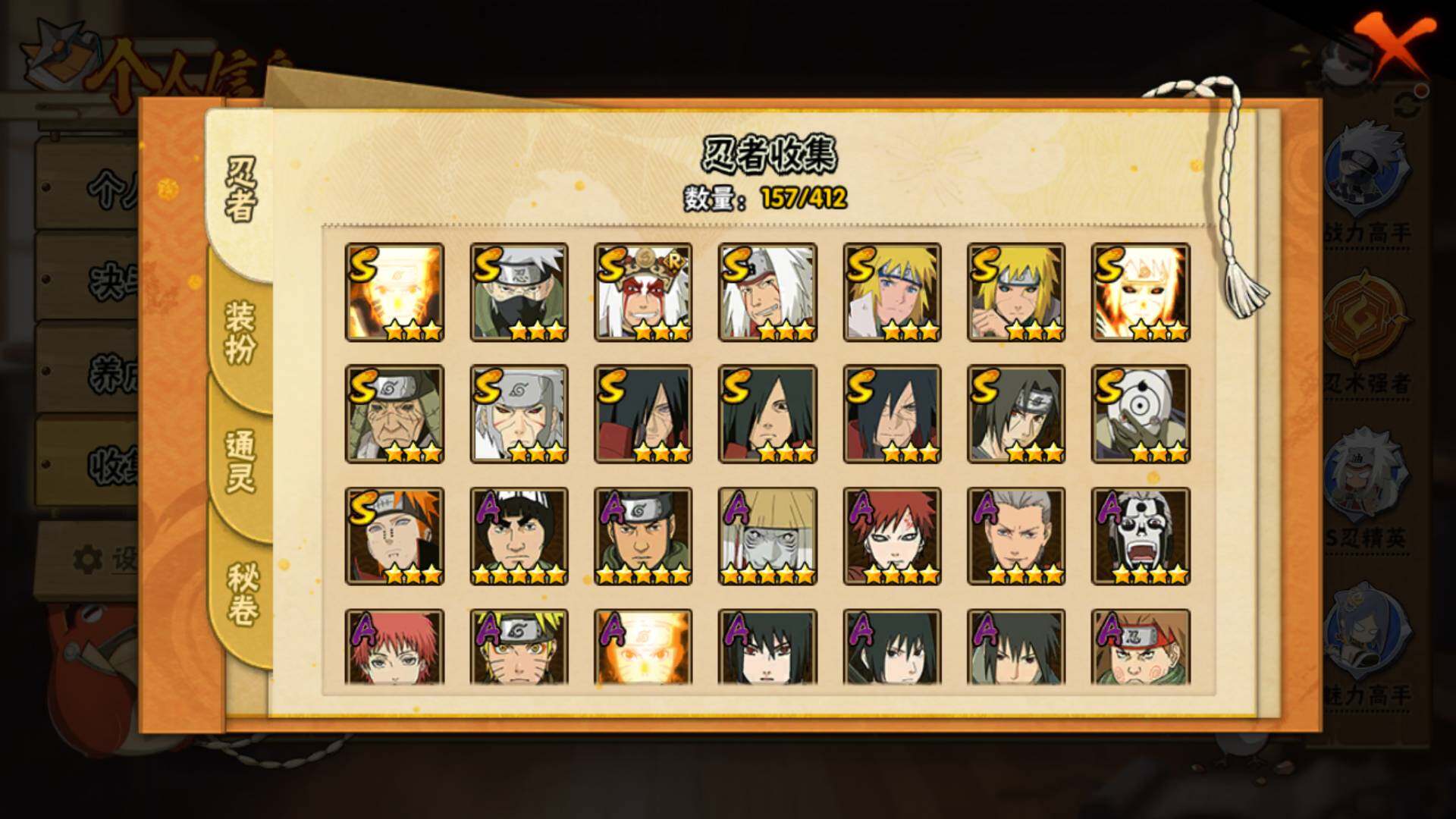 【S级忍者】:猿飞日斩「秽土转生」(3星),波风水门「秽土转生」(3星),千手扉间「秽土转生」(3星),宇智波斑「秽土转生」(3星),宇智波斑「秽土转生·解」(3星),宇智波鼬「须佐能乎」(3星),旗木卡卡西「须佐能乎」(3星),自来也「舞之豪杰」(3星),自来也「传说中的三忍」(3星)