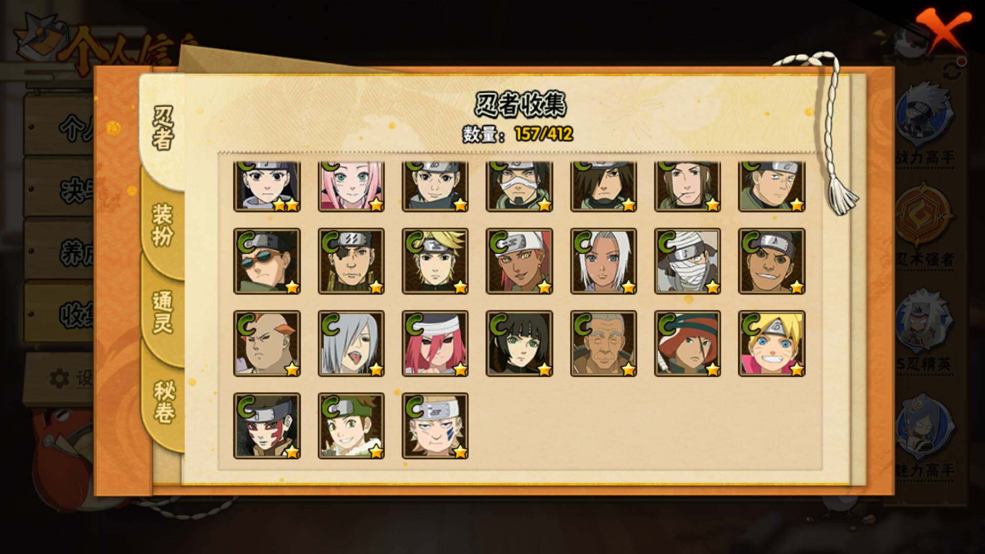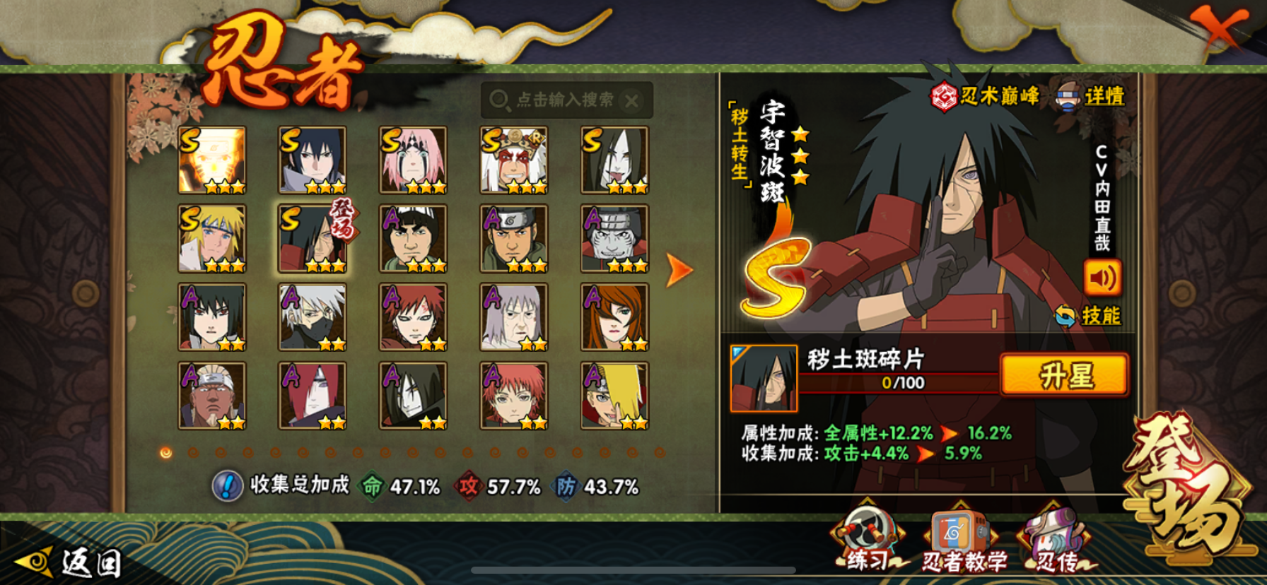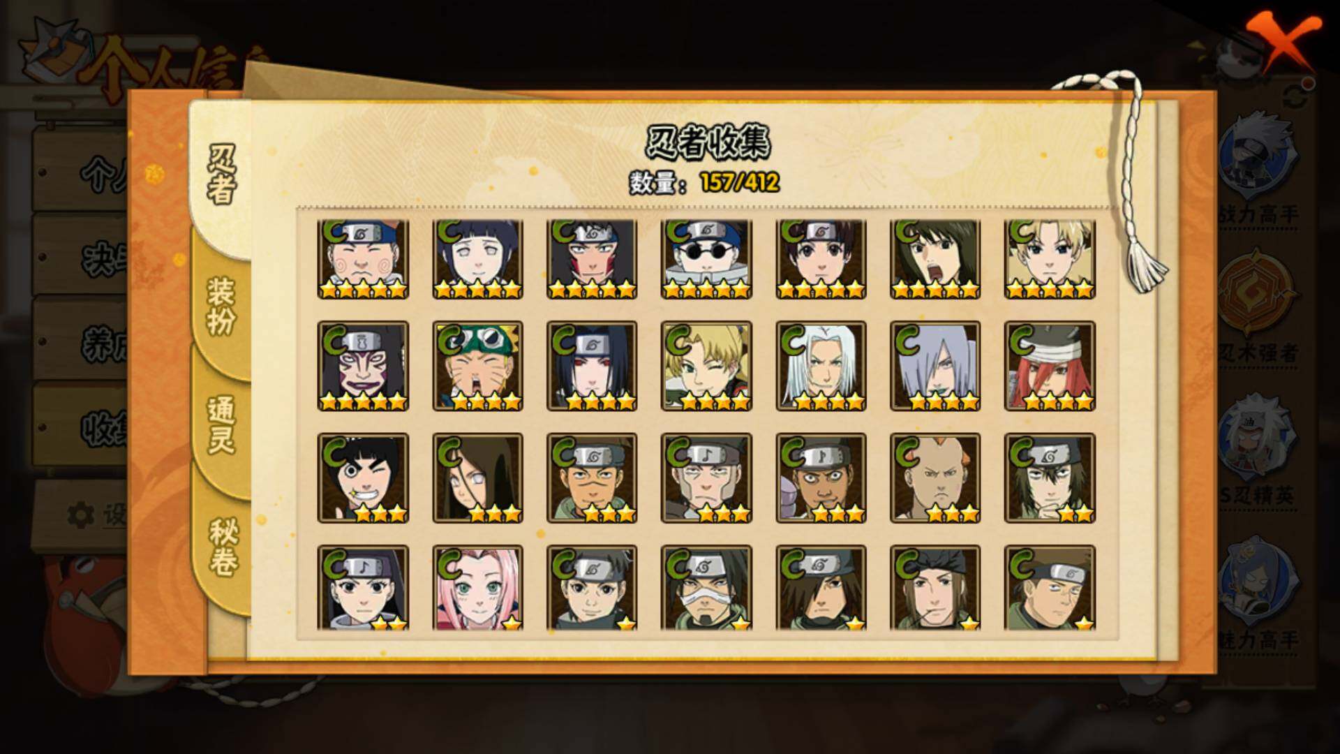【S级忍者】:猿飞日斩「秽土转生」(3星),波风水门「秽土转生」(3星),千手扉间「秽土转生」(3星),宇智波斑「秽土转生」(3星),宇智波斑「秽土转生·解」(3星),宇智波鼬「须佐能乎」(3星),旗木卡卡西「须佐能乎」(3星),自来也「舞之豪杰」(3星),自来也「传说中的三忍」(3星)