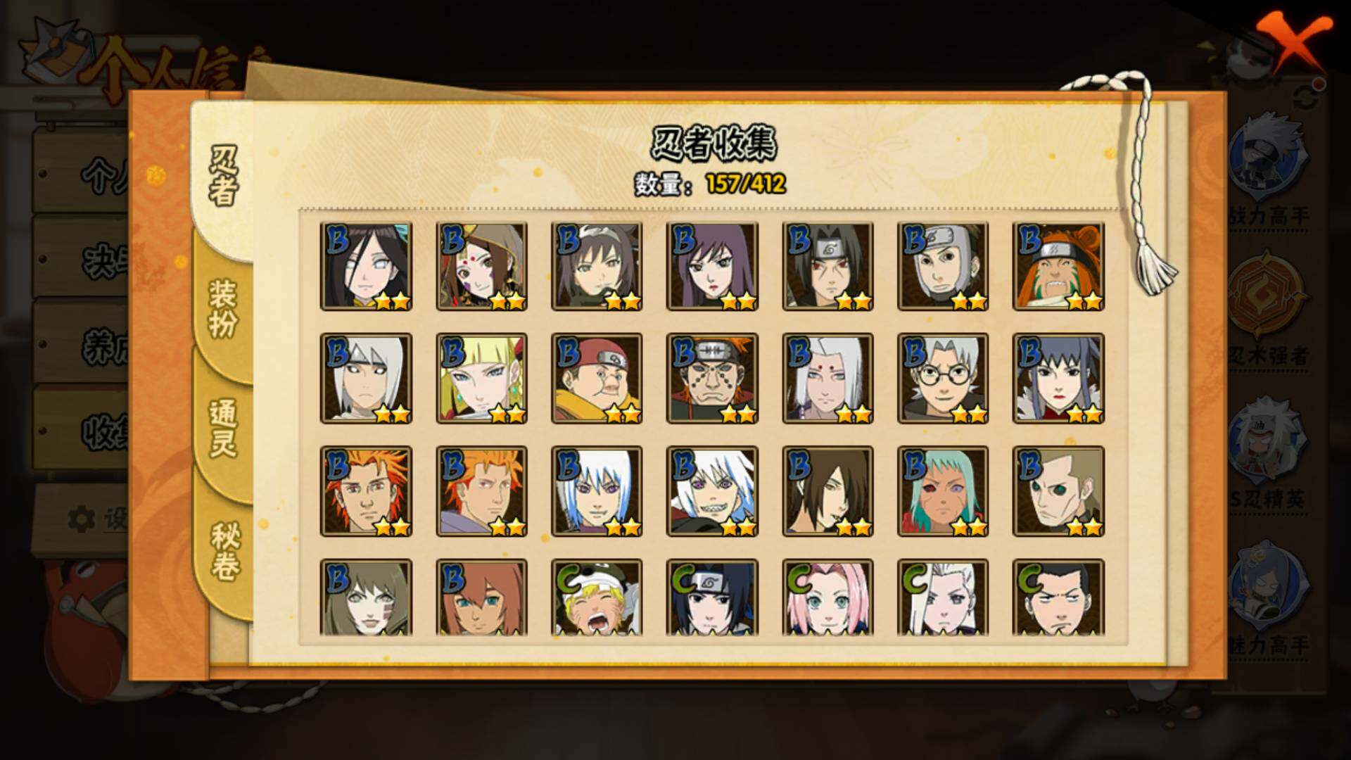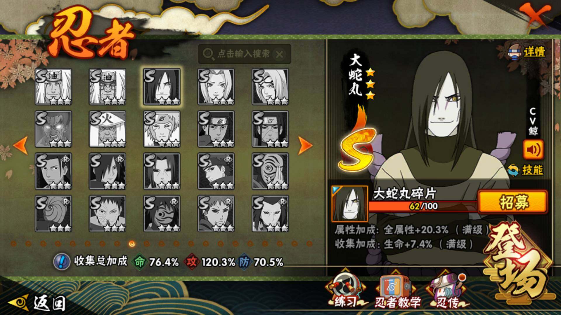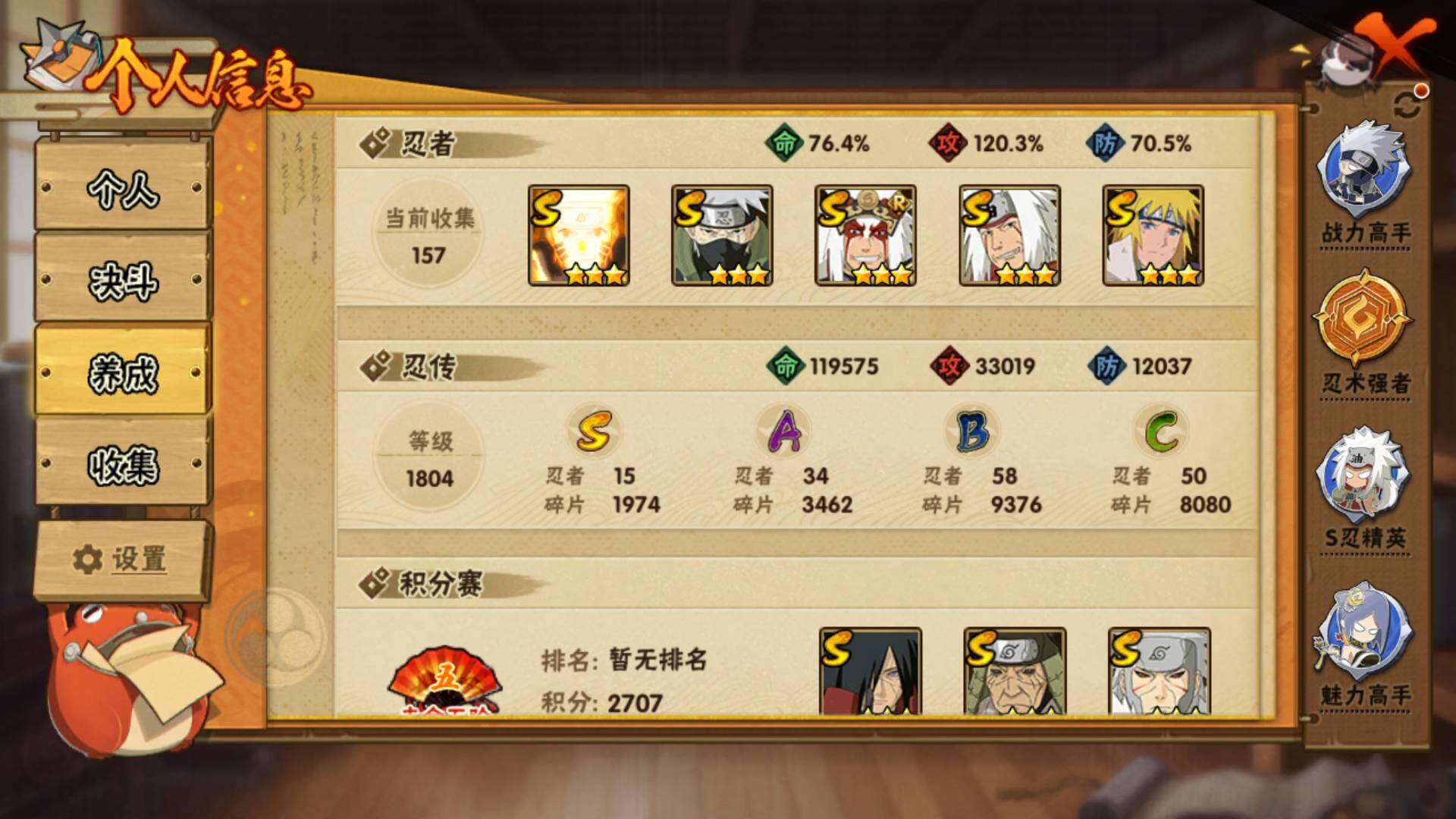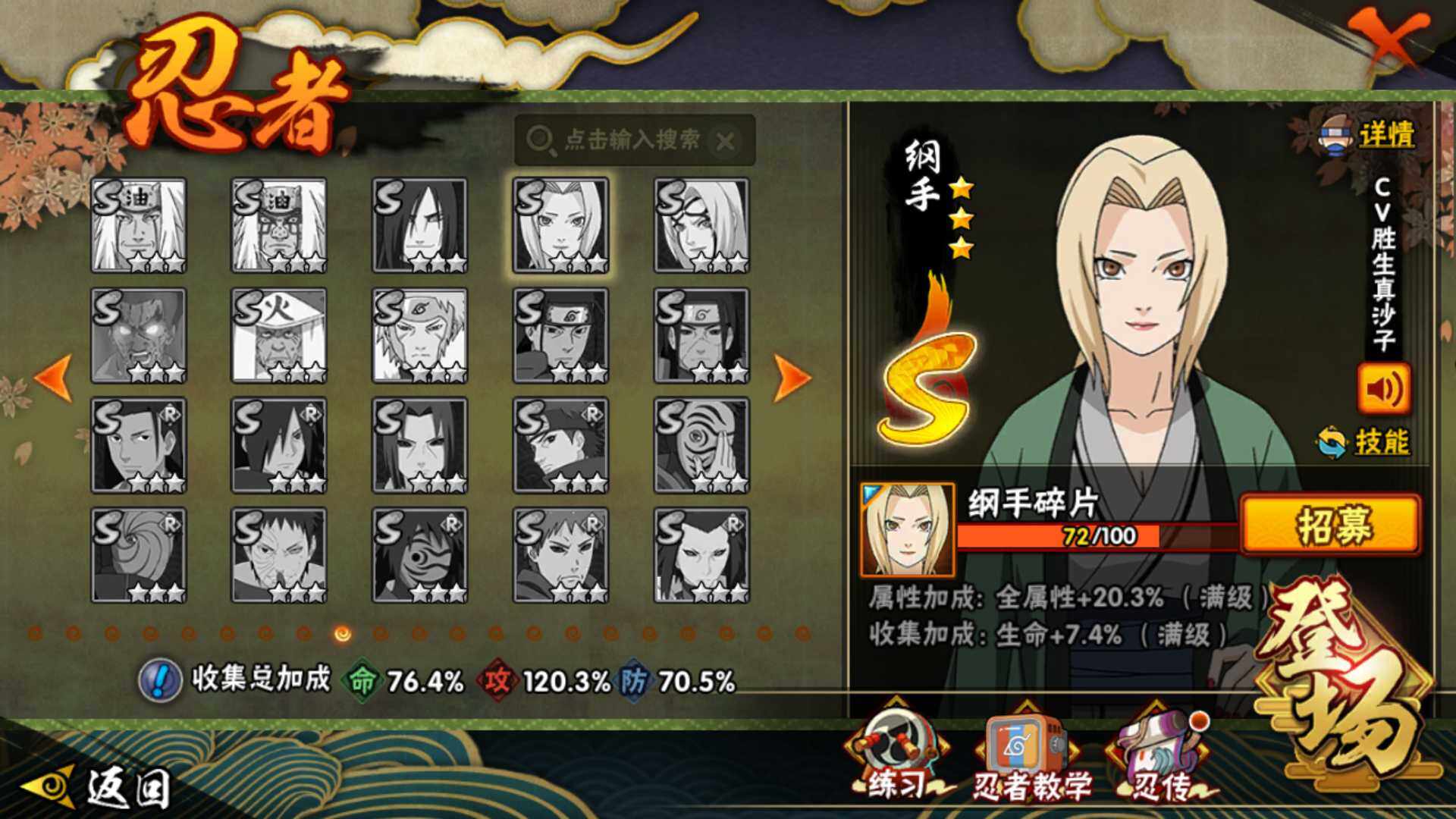v1,1072w战力,15S级忍者数-34A级忍者数,大蛇丸62片,纲手72片,百豪纲手71片 ME1778