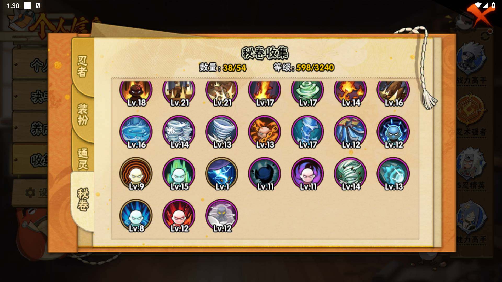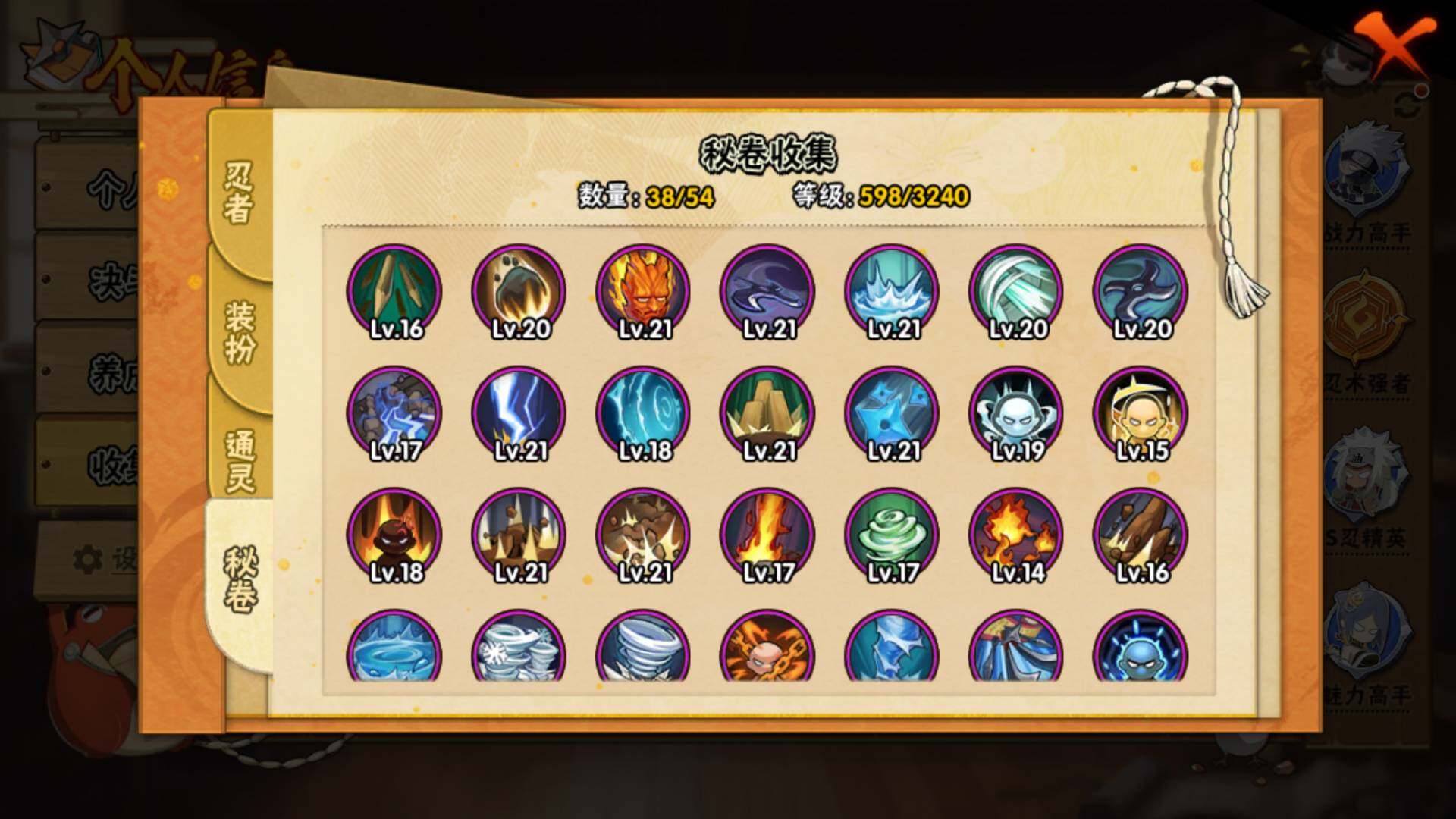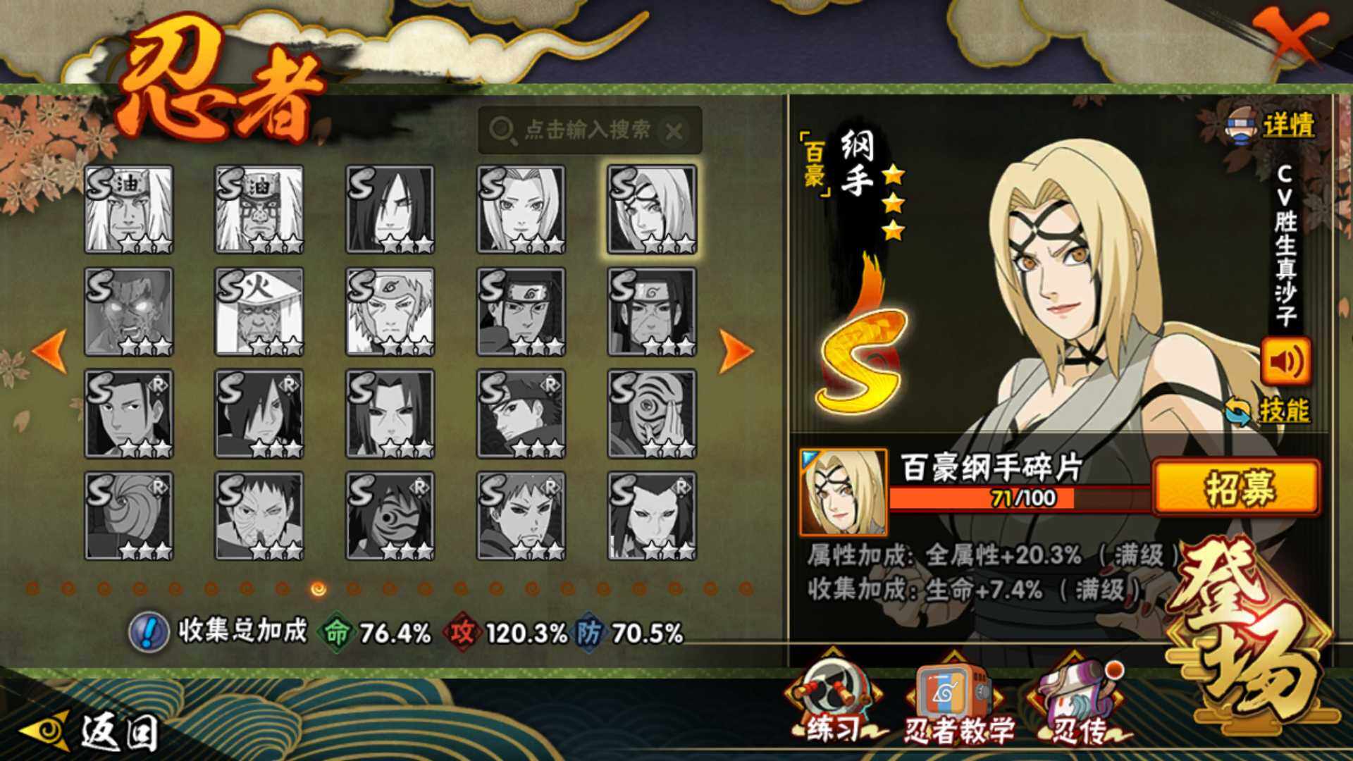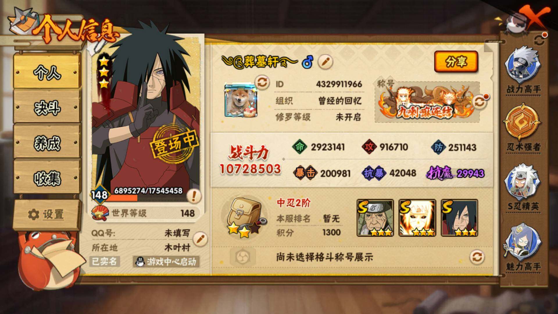 v1,1072w战力,15S级忍者数-34A级忍者数,大蛇丸62片,纲手72片,百豪纲手71片 ME1778