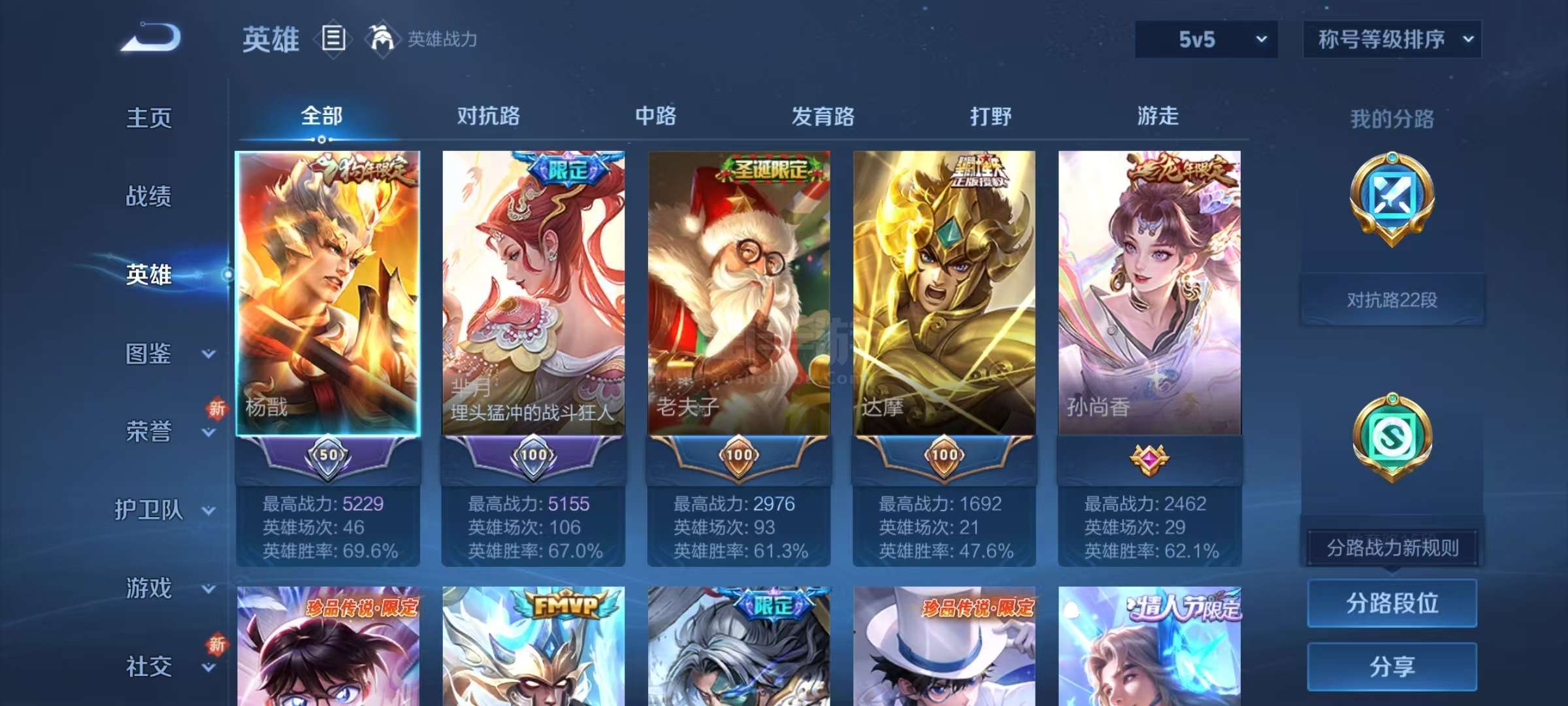 王者荣耀【安卓微信】安卓v/至尊星耀/164皮肤/126英雄/2典藏/1珍品无双/2无双/4珍品传说/22传说/65史