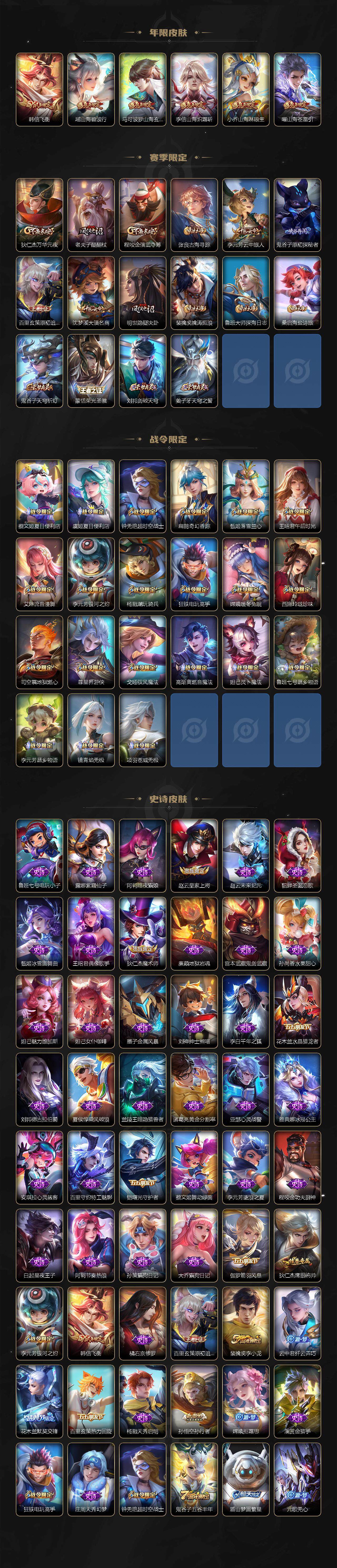 【传说皮肤】:司空震愿照山河定,女娲愿照千秋盛,妲己愿照众生和,澜愿照九州拓,蔡文姬愿照福禄聚,虞姬愿照岁时盈,云缨幻光神枪,桑启鸣野蒿,夏洛特浮生妄,孙悟