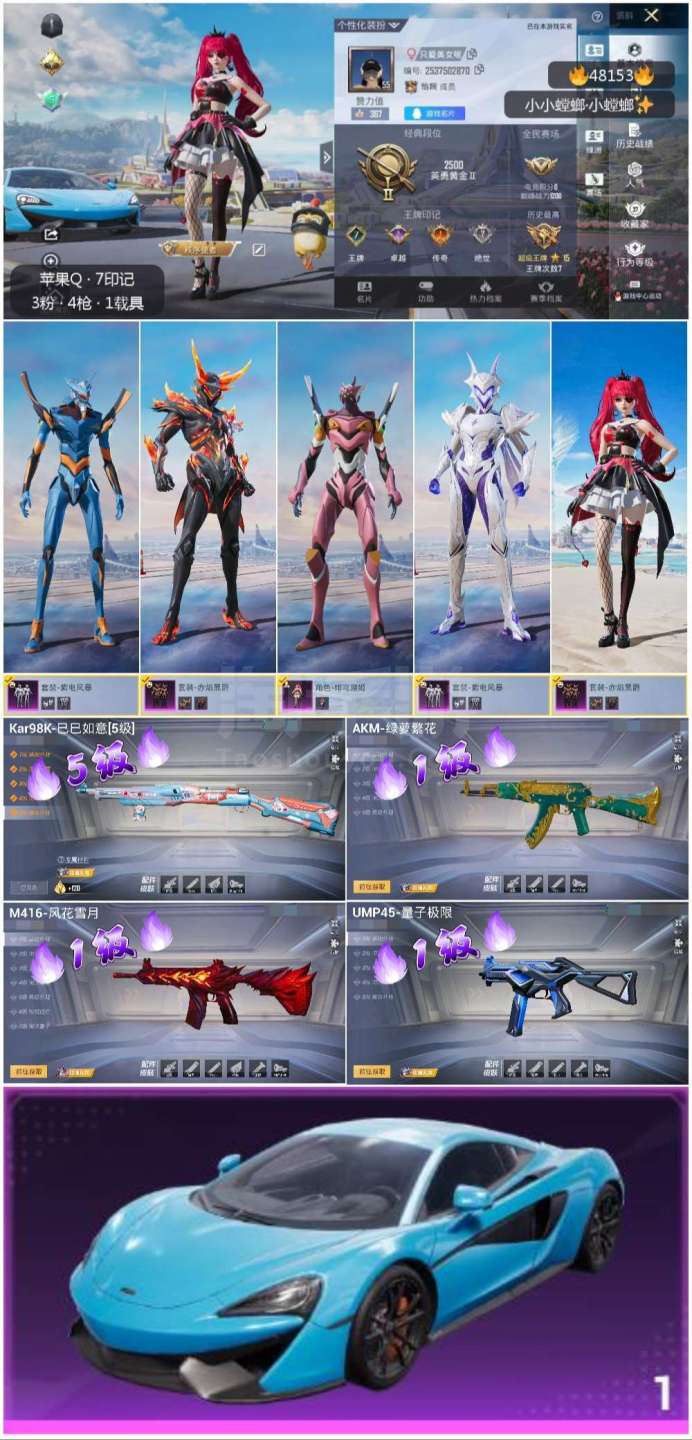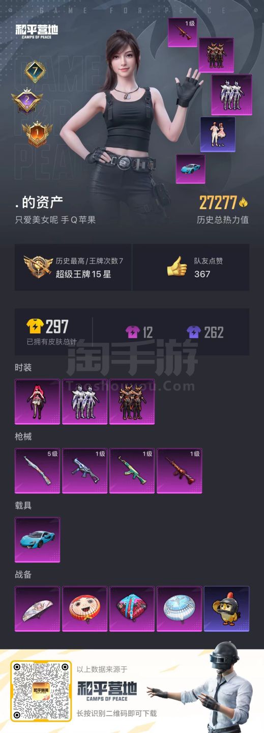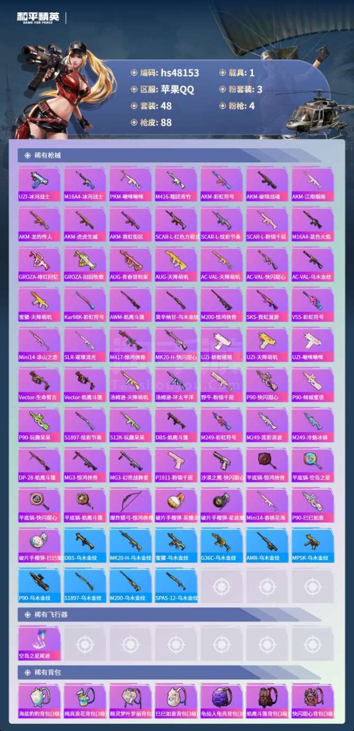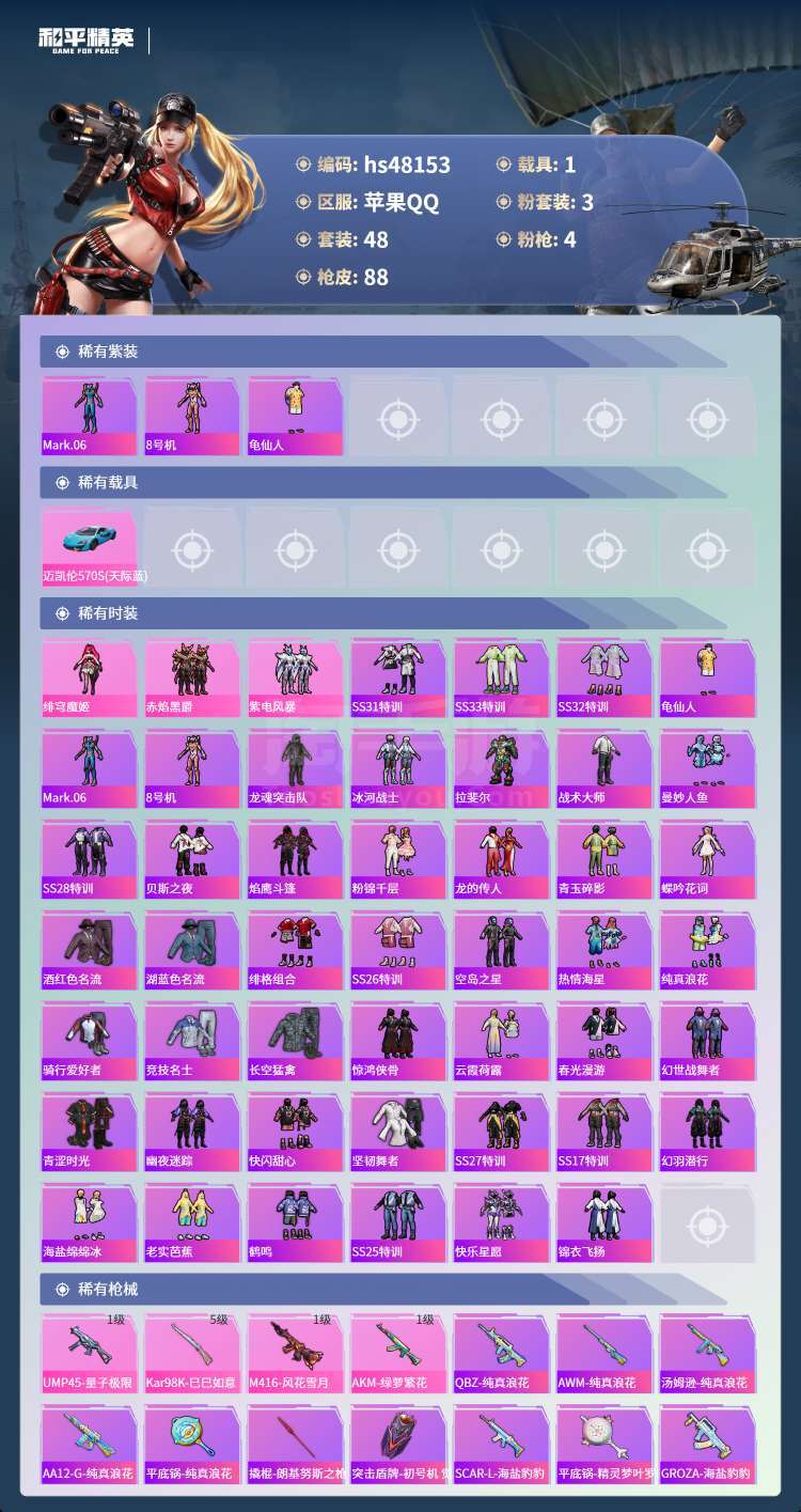 和平精英【苹果QQ】hs48153 苹果手Q-7王牌印记-3粉装-4特效枪-1载具-27277热力值-48套装-88枪皮