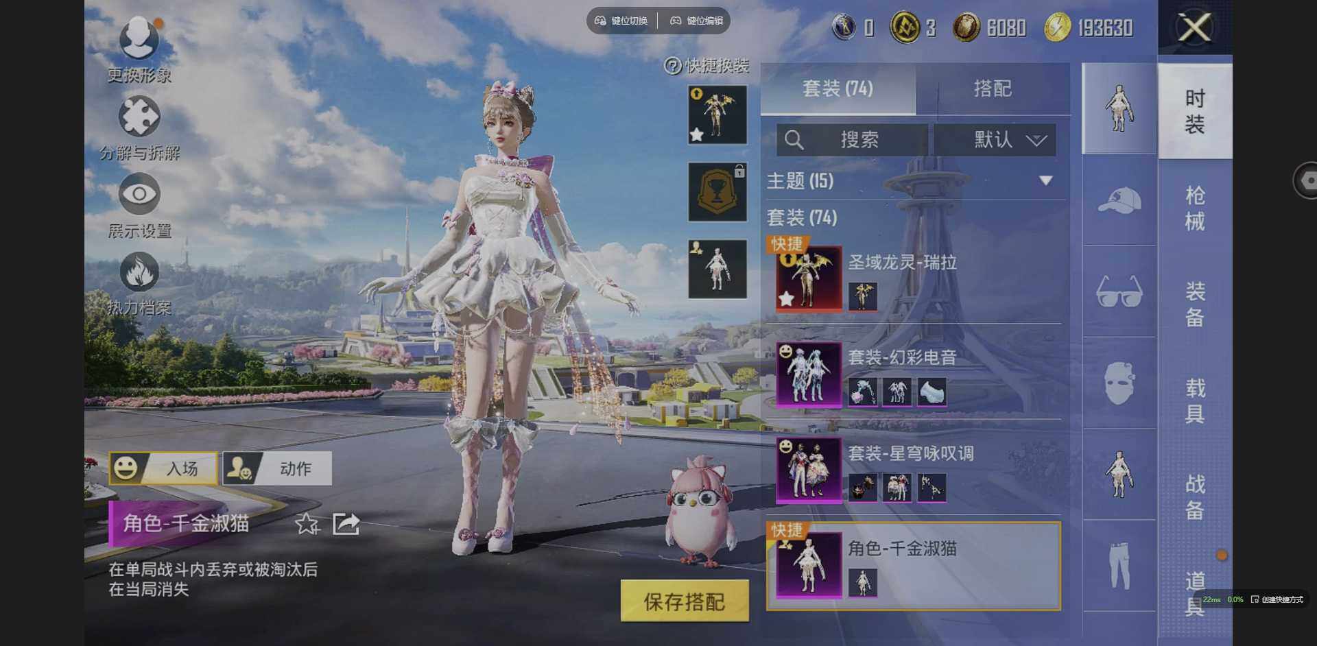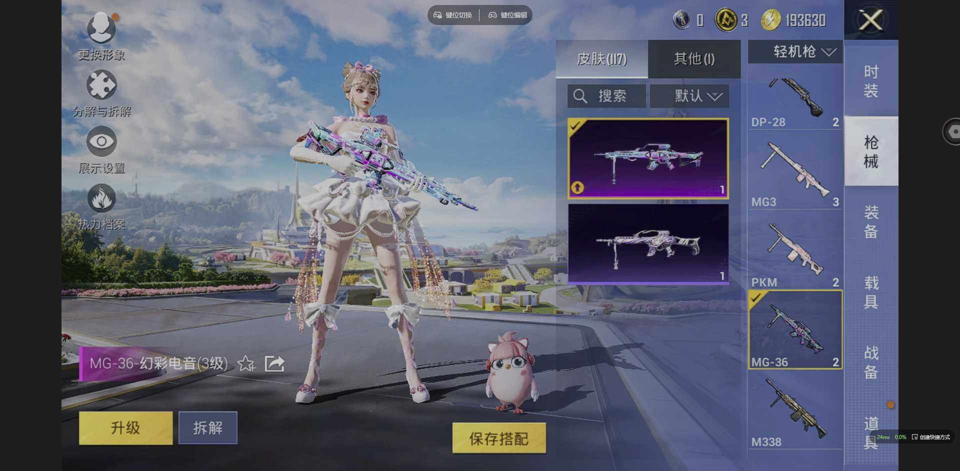 实名: 可修改 时装数: 74 枪械数: 116 战备数: 78 神级装扮: 圣域龙灵-瑞拉 热门装扮: 千金淑猫,星穹咏叹调,幻彩电音 稀有枪皮: Kar98K-巳巳如意(五级),Kar98K-圣域龙灵(三级),DP-28-豹影疾电(一级),MG-36-幻彩电音(三级)