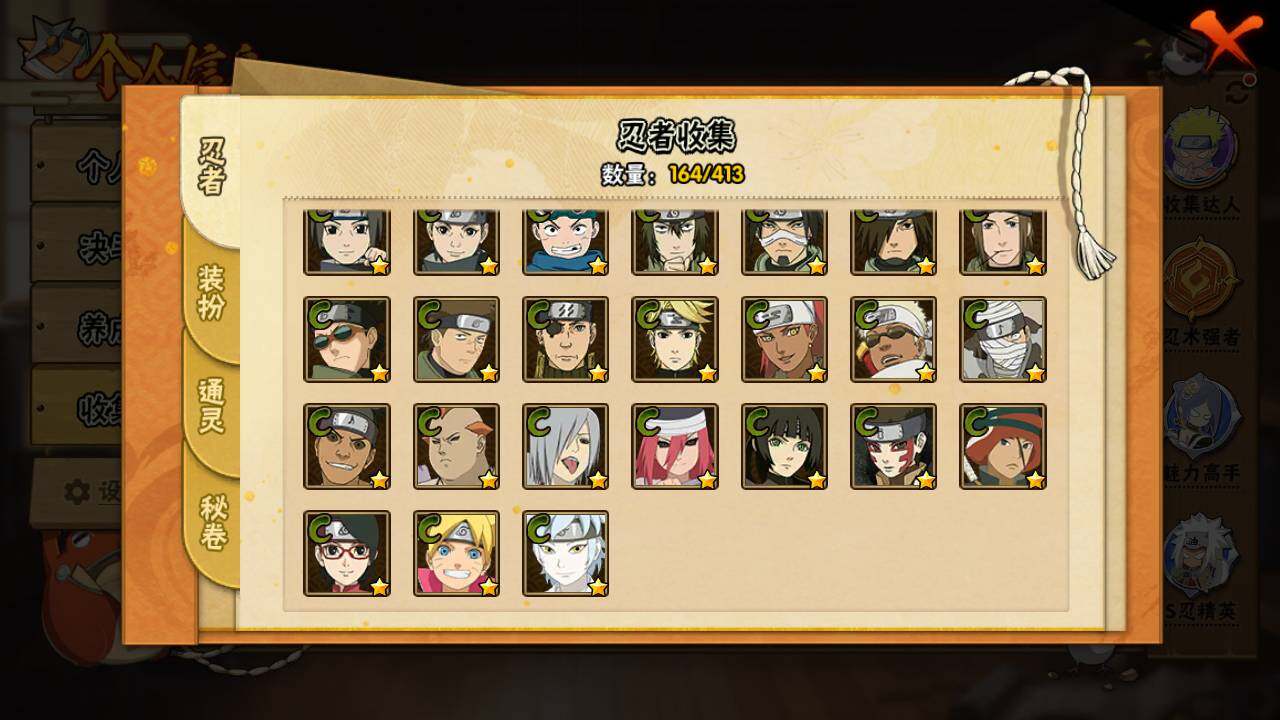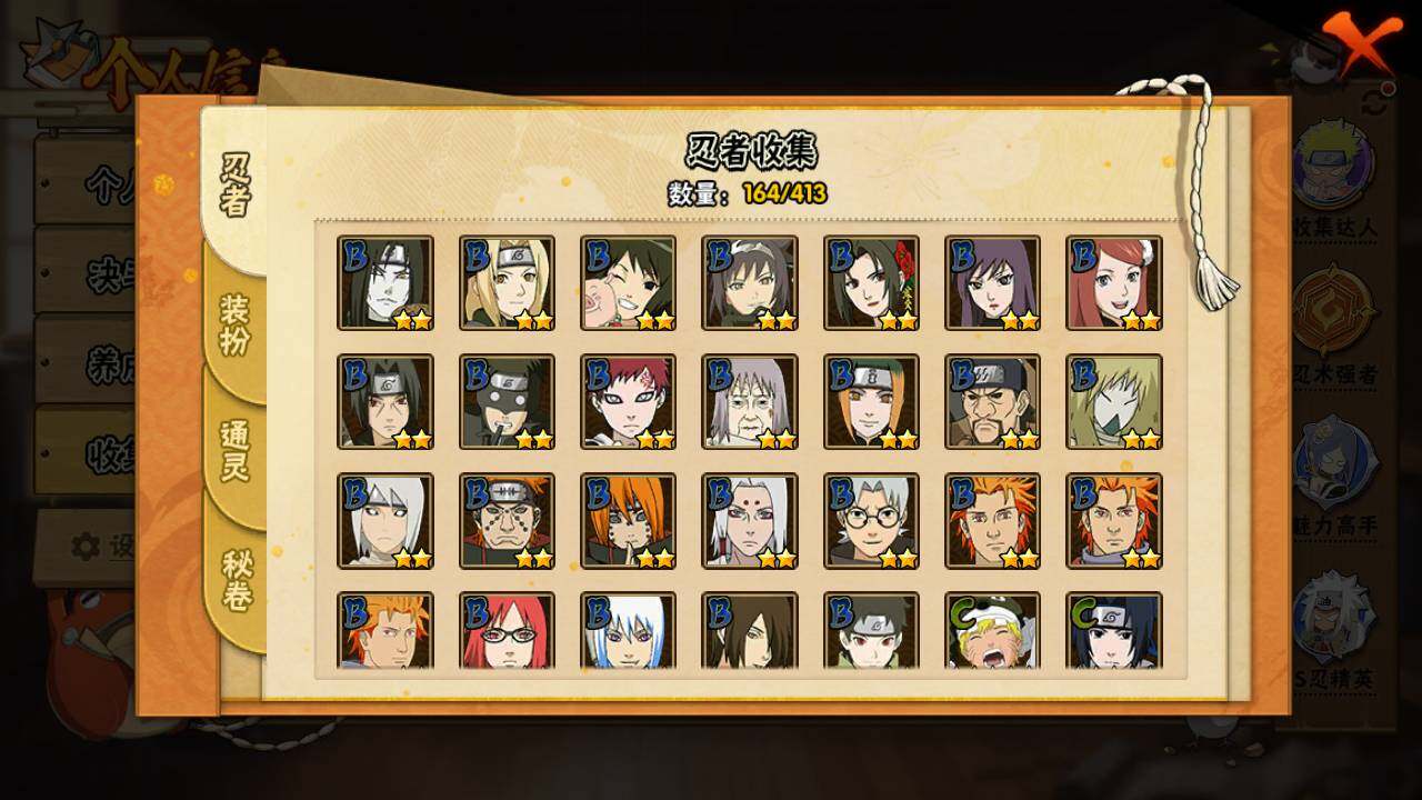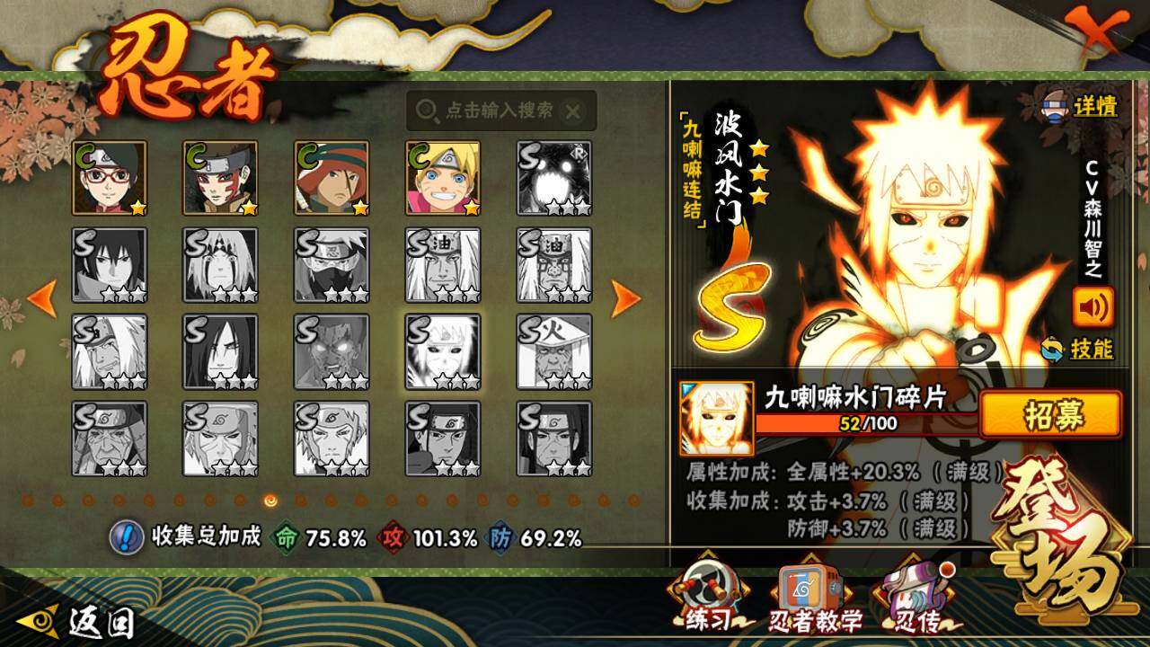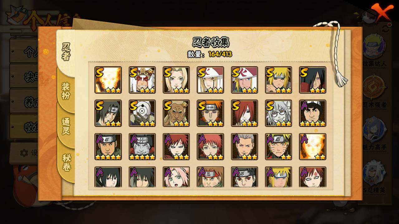 【S级忍者】:长门「秽土转生」(3星),波风水门「秽土转生」(3星),宇智波斑「秽土转生」(3星),宇智波鼬「须佐能乎」(3星),艾「三代目雷影」(3星),自来也「舞之豪杰」(3星),纲手(3星),纲手「百豪」(3星),波风水门(3星),药师兜「仙人模式」(3星),漩涡鸣人「九喇嘛连结