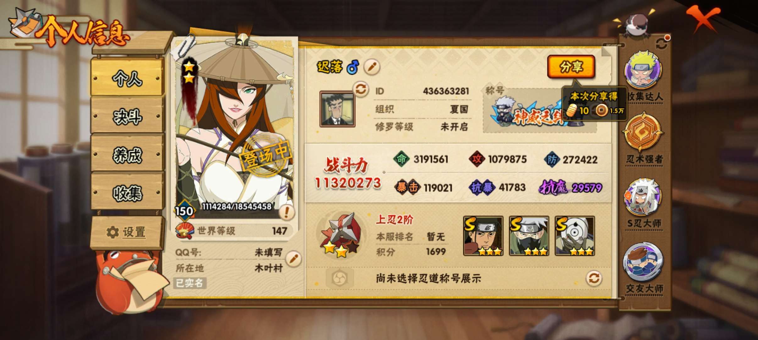 忍界大战春野樱九十片,忍法帖满级且充了两个198升级,创立柱间二十多片,月卡已开
