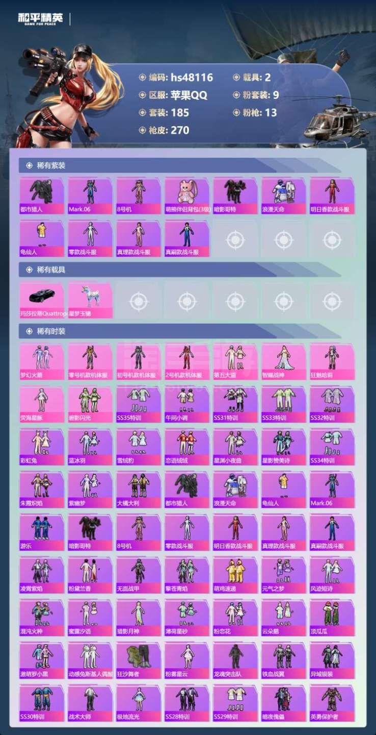 苹果手Q-19王牌印记-9粉装-13特效枪-2载具-89905热力值-185套装-270枪皮-6卓越